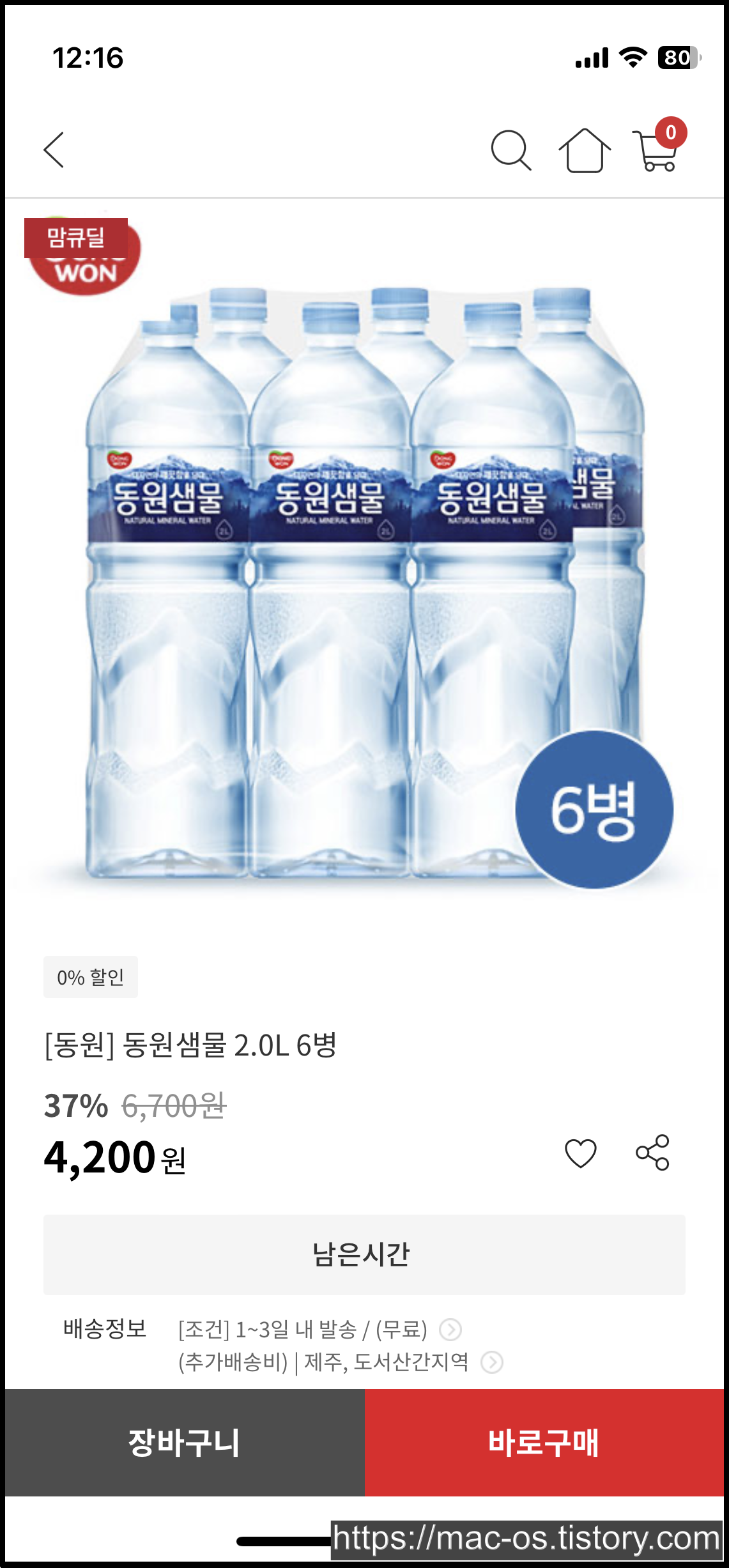 동원샘물 2리터 6병 4,200원짜리 상품인데 적립금 7000원으로 전액결제가 가능해보였다. 따라서 가입만 해서 7천원을 받고 물티슈나 기저귀같은 저렴한 상품을 0원으로 구매하는 것도 좋아보인다.