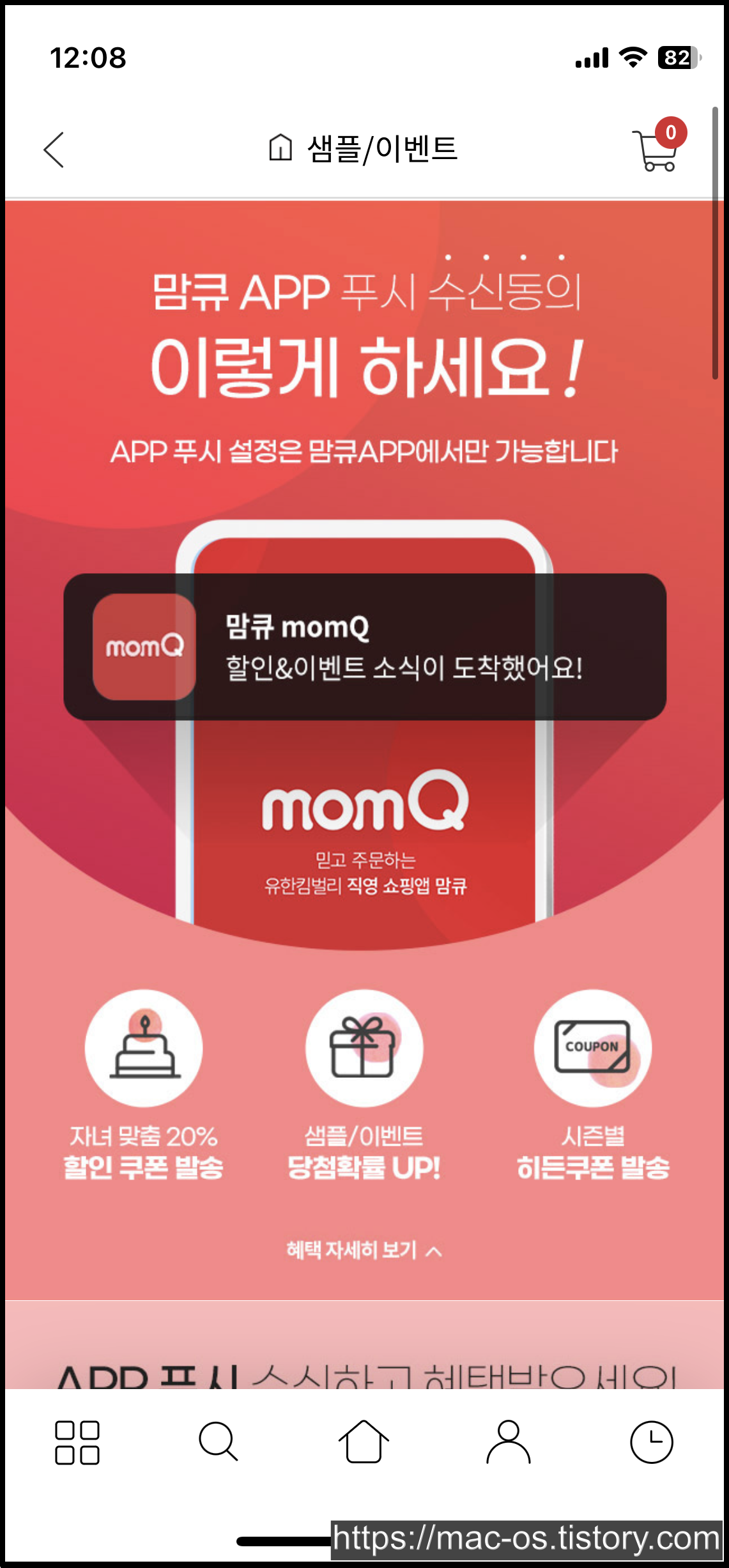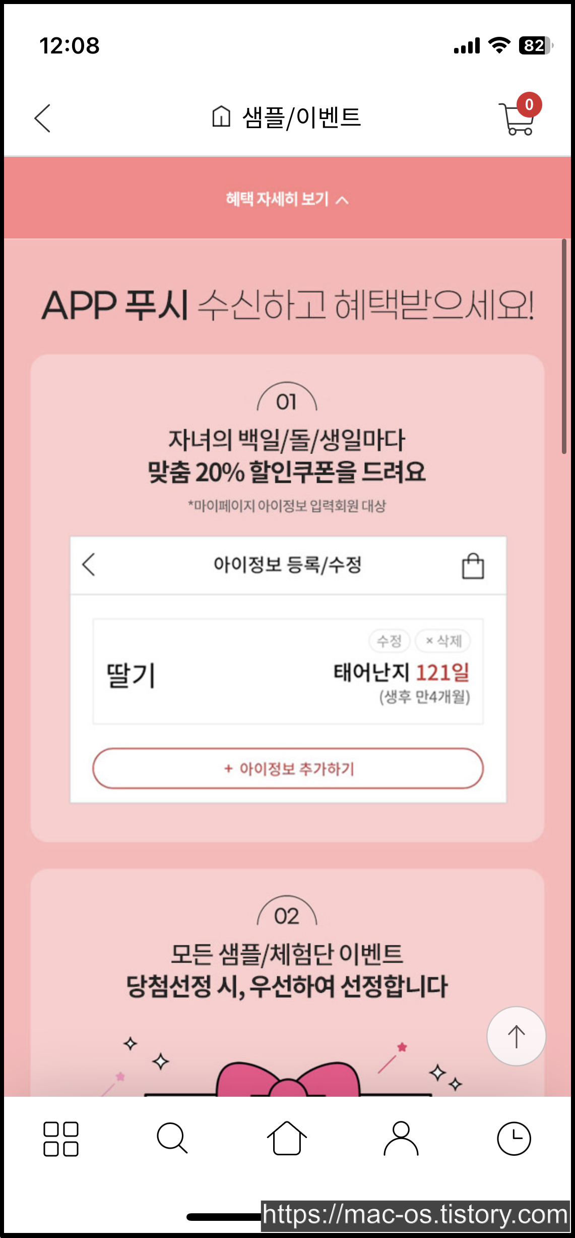 맘큐 앱에서 APP 푸시 수신 동의를 하면 여러 혜택이 제공된다. 우선, 자녀의 백일/돌/생일마다 맞춤 20% 할인 쿠폰이 지급된다.