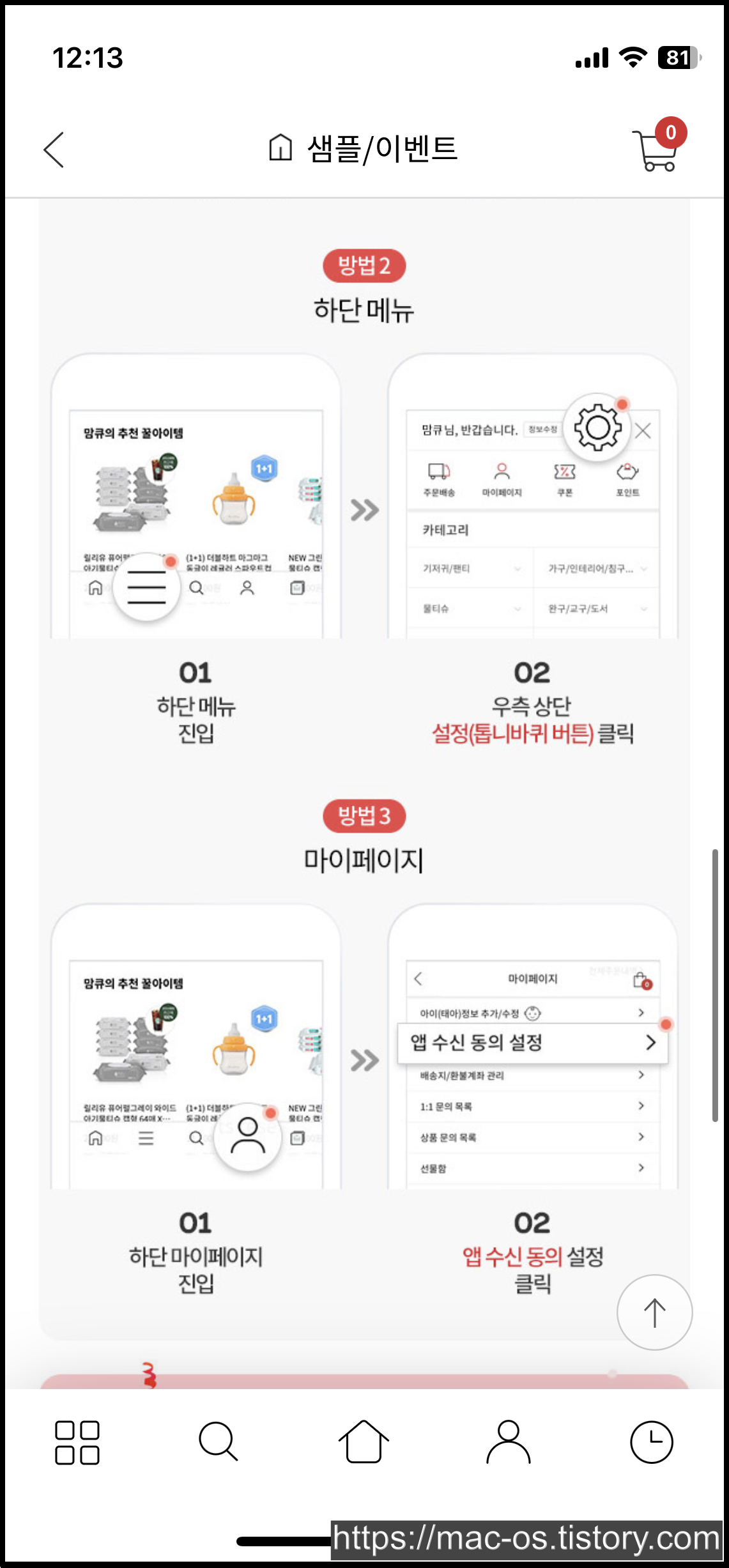 맘큐 앱 APP 푸시 수신 동의는 사이드 메인에서 왼쪽으로 슬라이드하여 설정 창에서 알림 ON으로 변경하면 된다. 수신 동의 후 해당 이벤트 페이지에서 [쿠폰 다운로드] 버튼을 터치하여 쿠폰을 발급받는다.