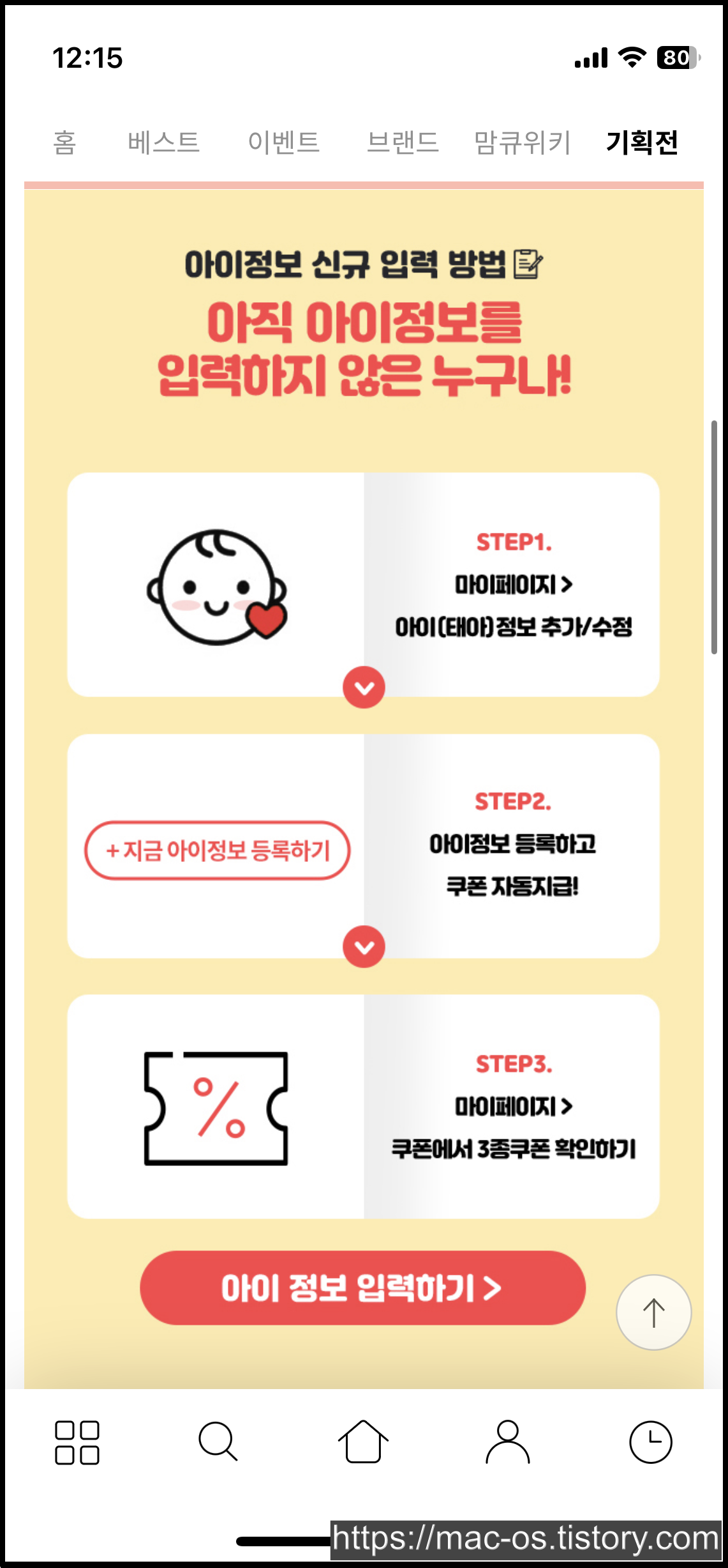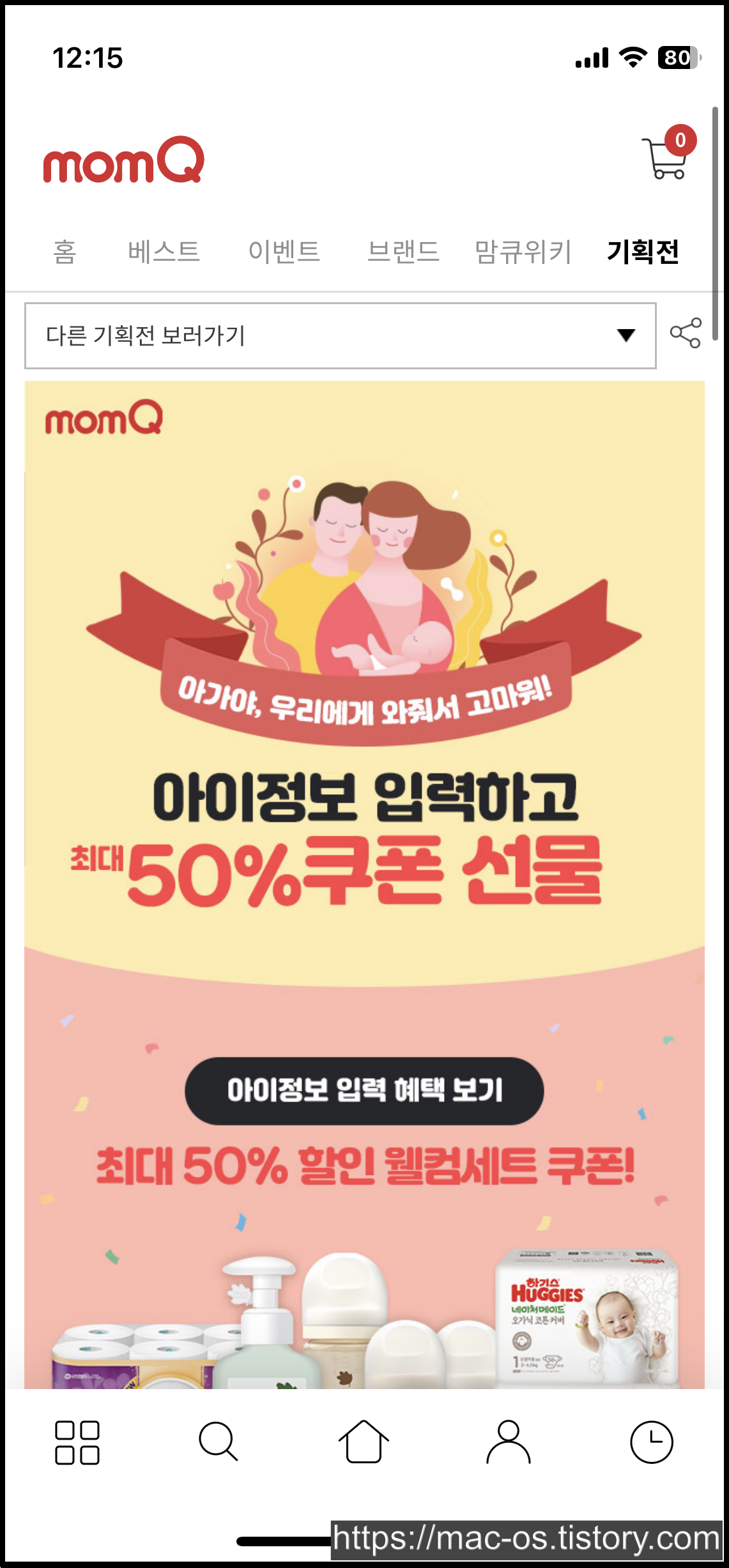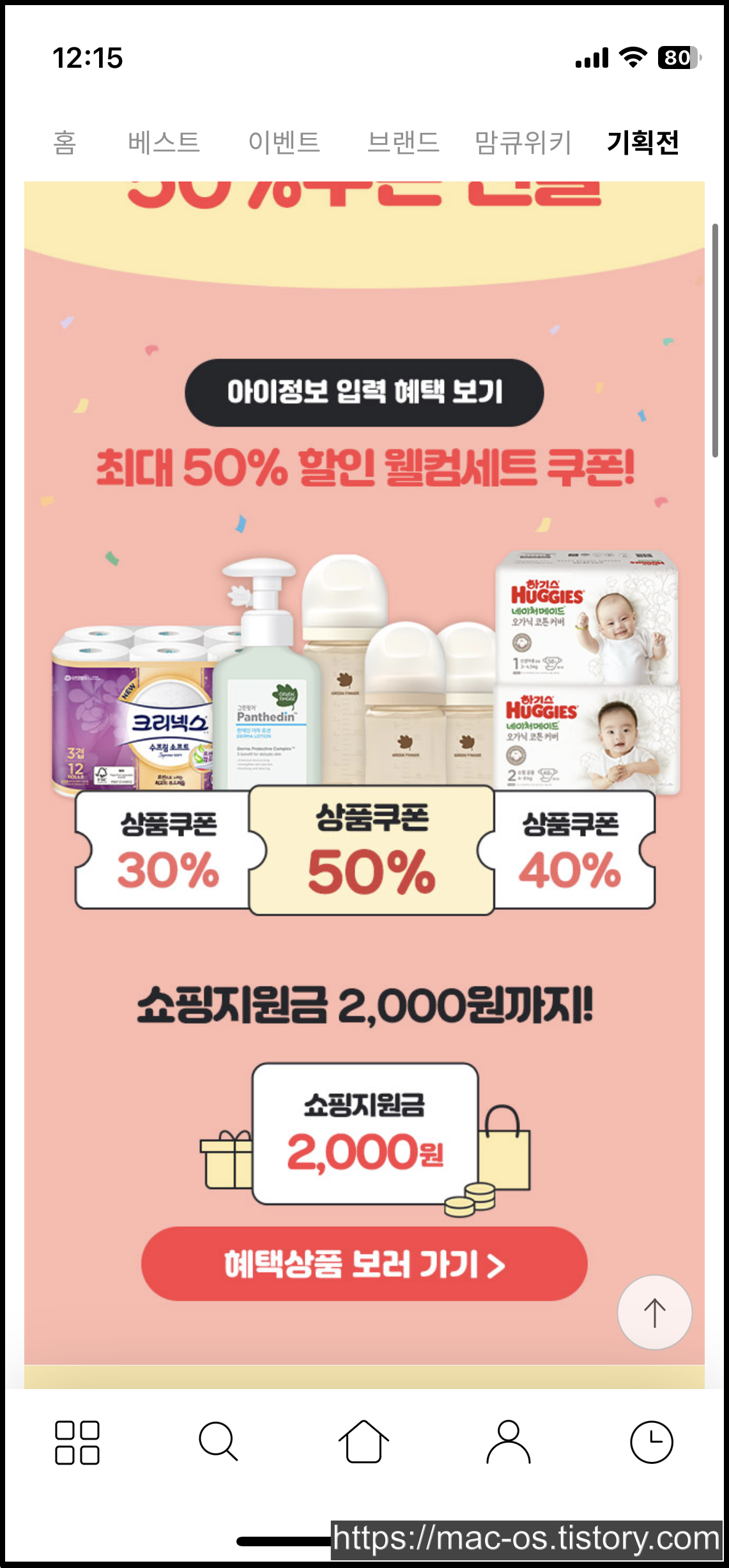 맘큐에서 아이정보를 입력하면 최대 50% 할인 웰컴세트 쿠폰과 쇼핑지원금 2,000원을 받을 수 있다.