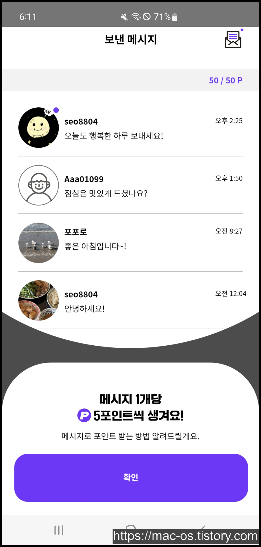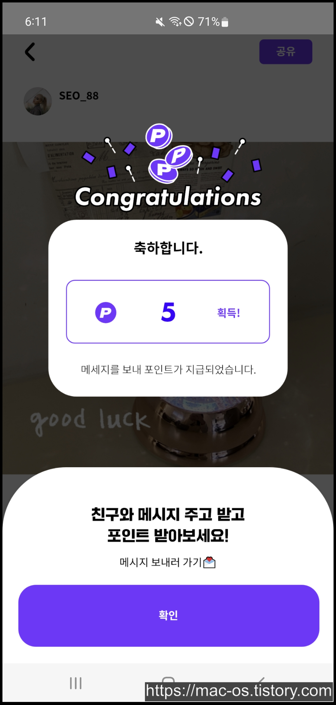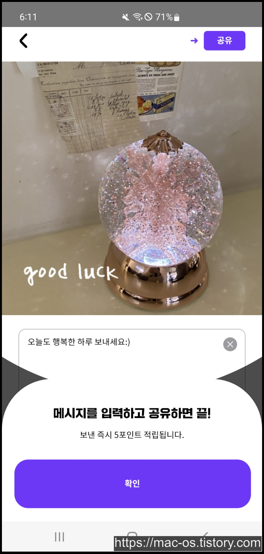 친구에게 보낼 사진을 선택한다. 여기서 보낼 사진이 고민된다면 기본 이미지에서 선택해도 된다. 그리고 메시지를 입력하고 공유하면 보낸 즉시 5포인트가 적립되는 식이다.