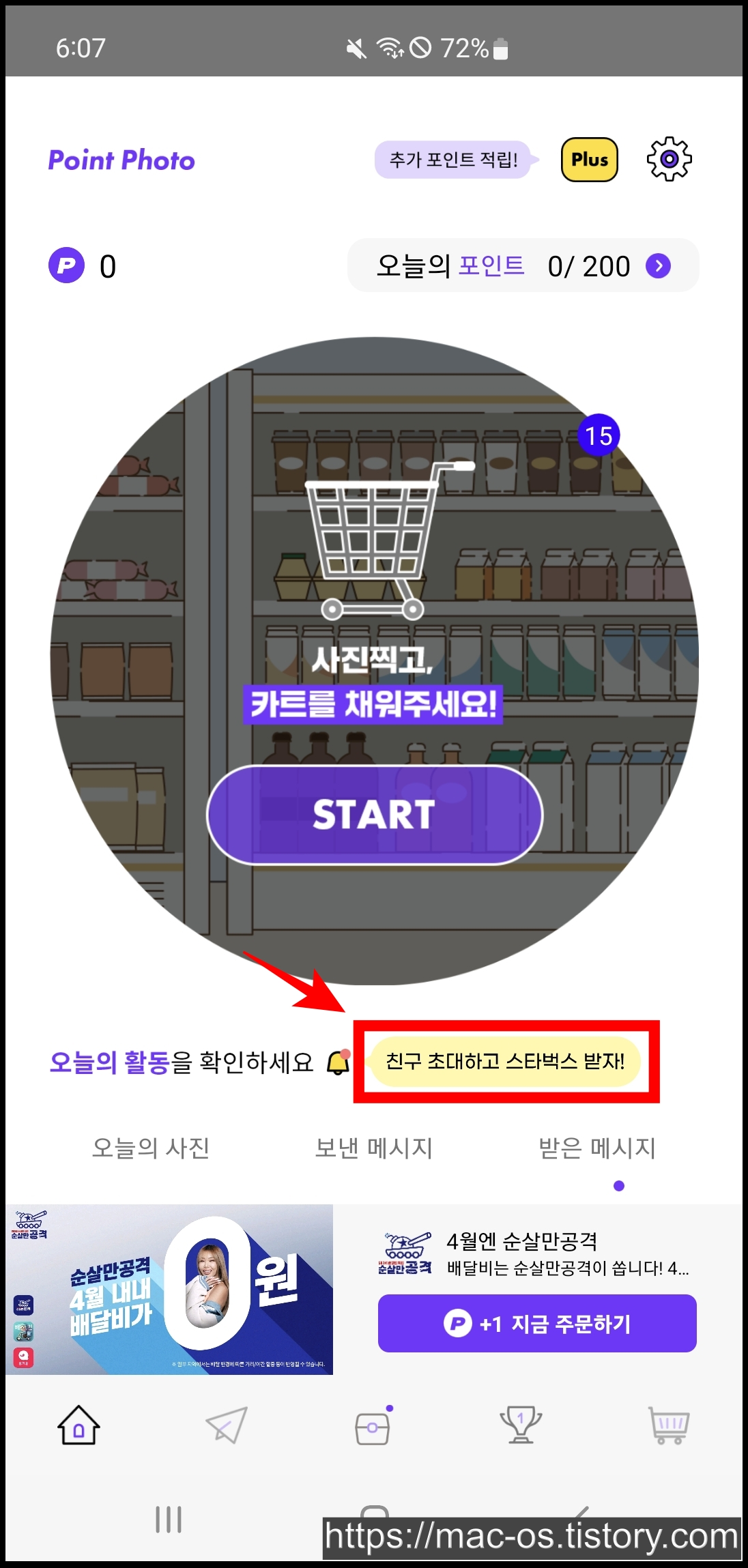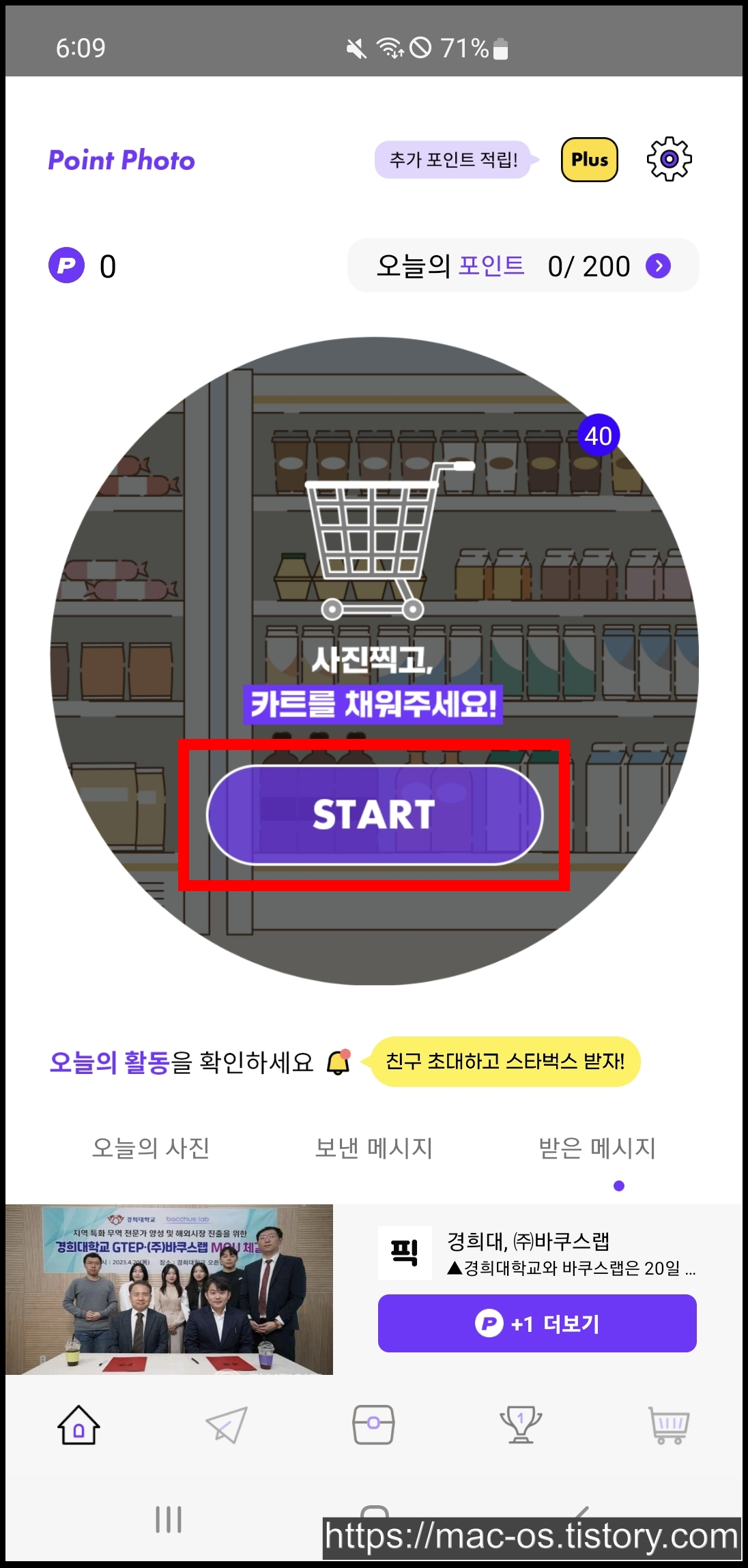 그럼 이제 포인트포토에서 포인트를 적립하는 방법에 대해 알아보자. 화면 중앙의 START 버튼을 누르고 카트를 터치하면 터치할 때마다 1포인트가 적립된다. 이렇게 하루에 총 200포인트를 받을 수 있다.