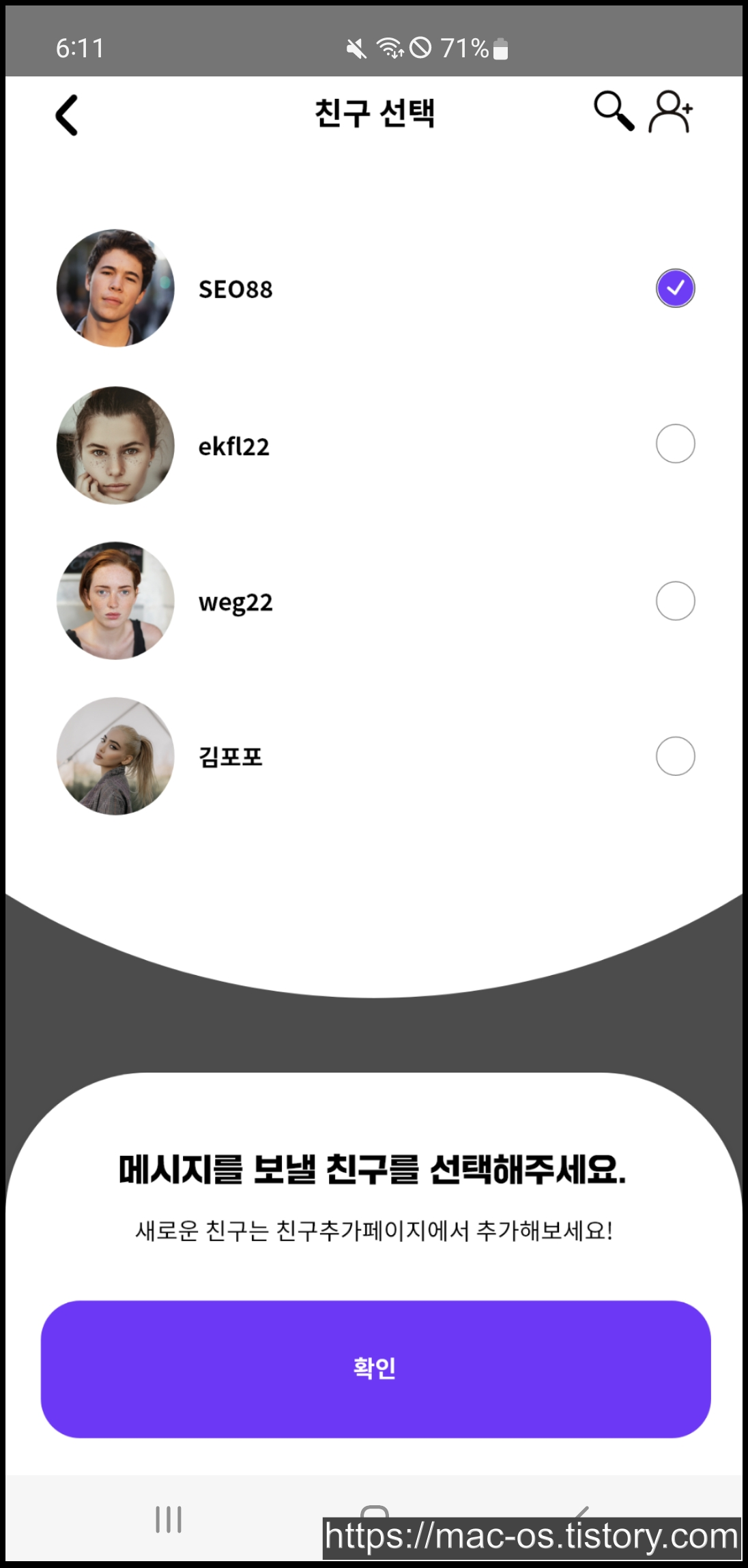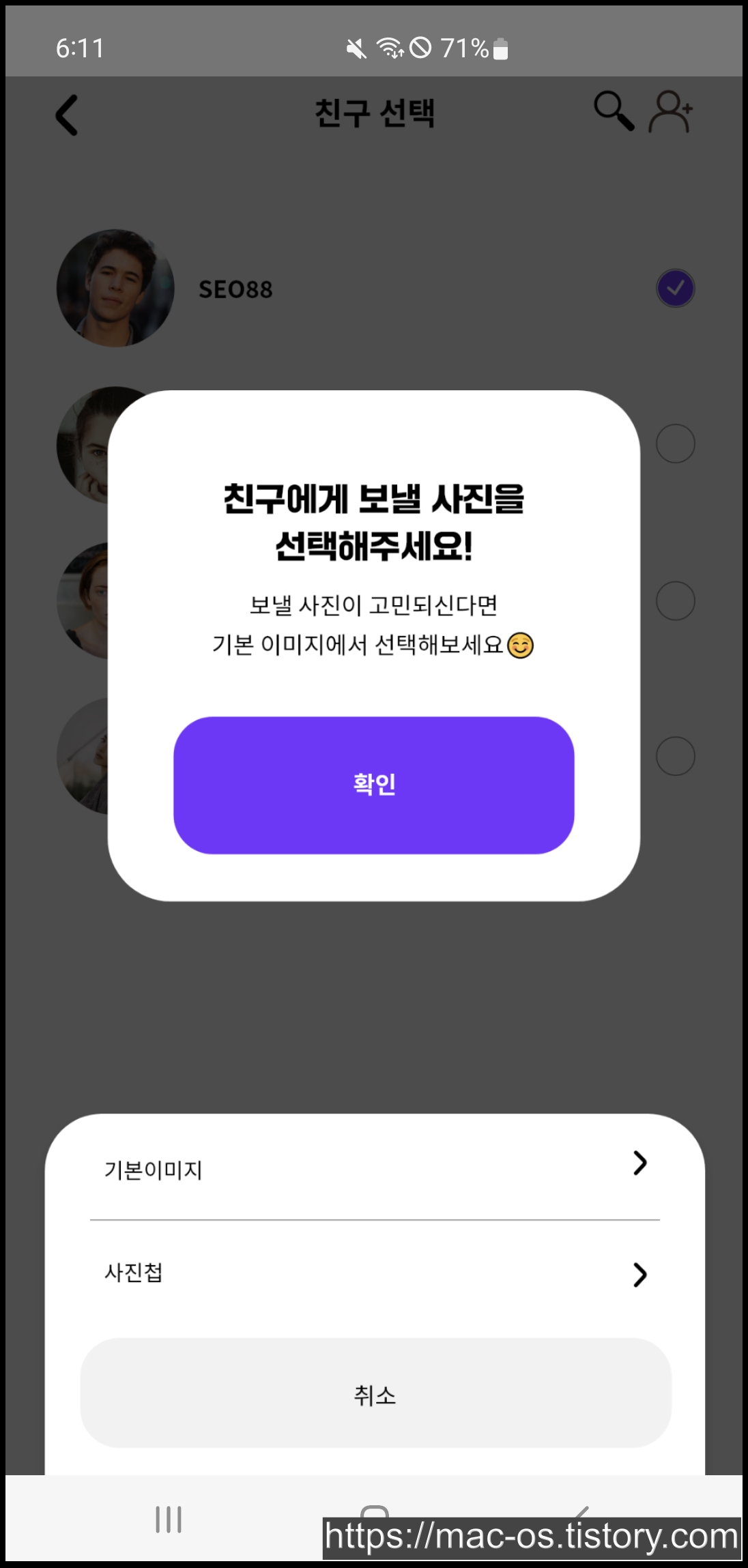 포인트포토에서 친구에게 메시지를 보내면 포인트가 적립된다. 우선 메시지를 보낼 친구를 선택하고