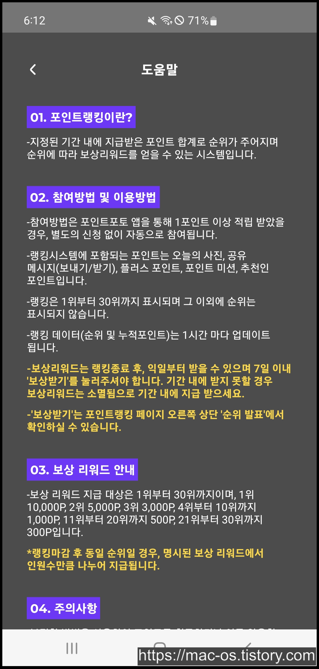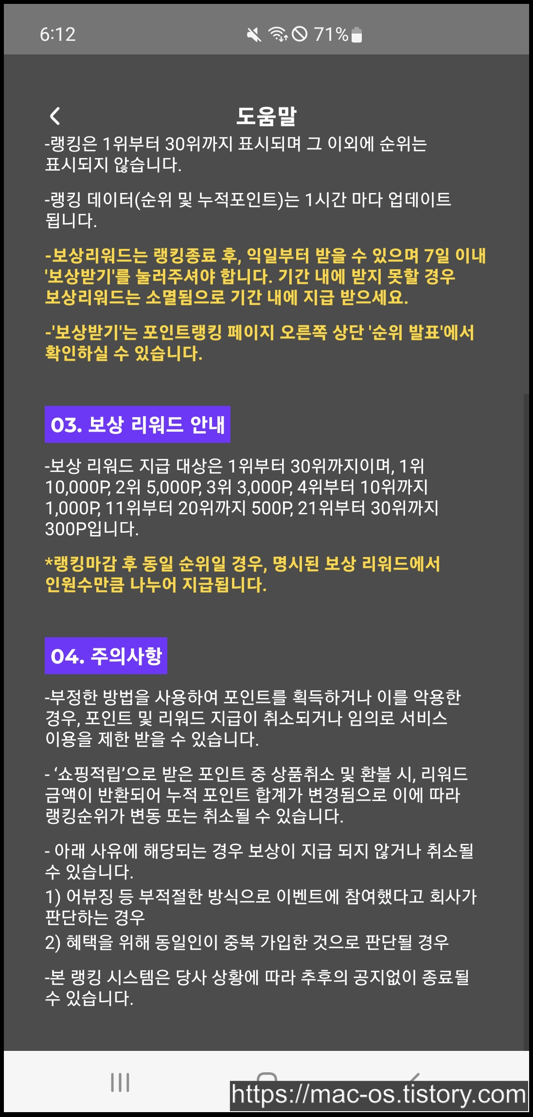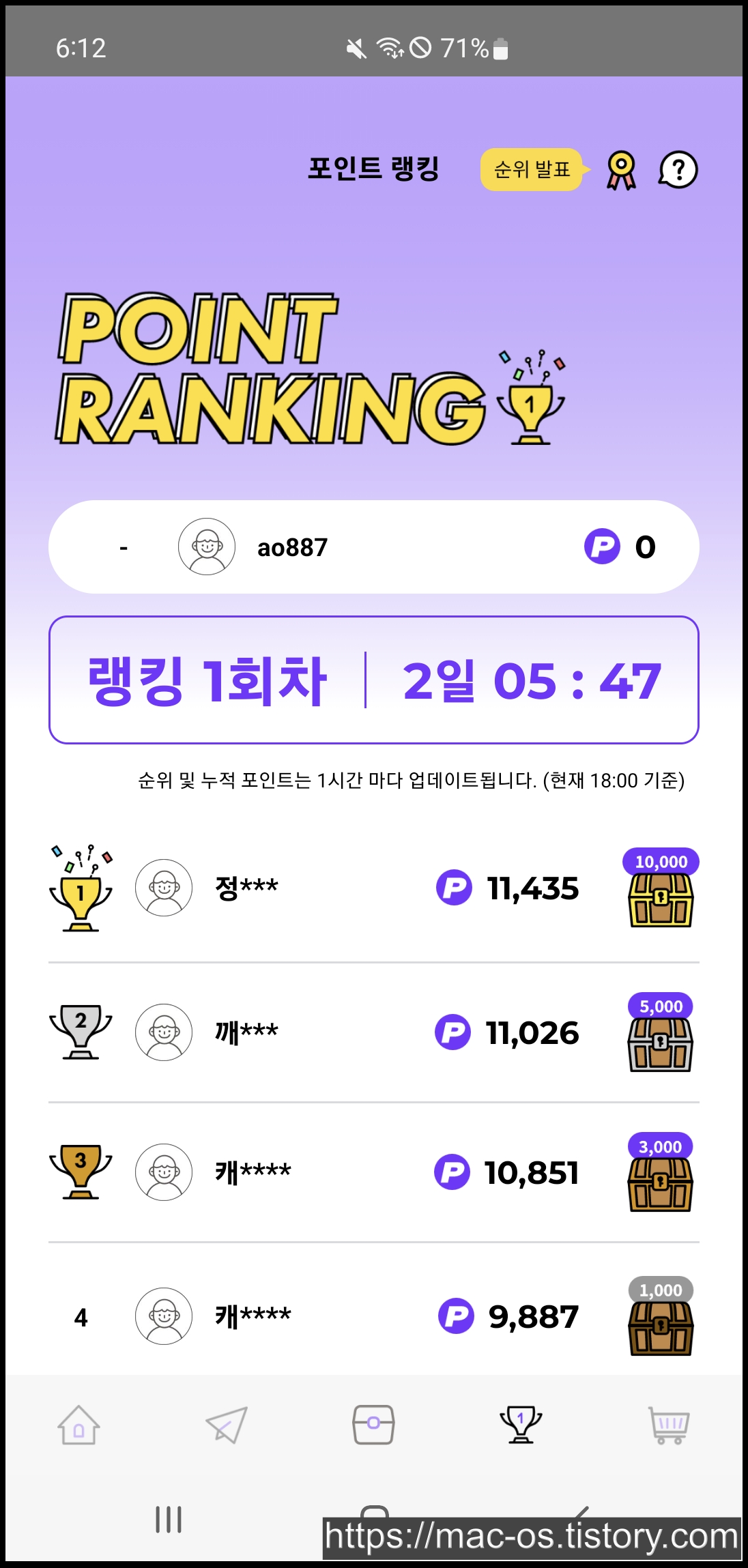 우측 사진은 포인트 랭킹이다. 랭킹 순위에 들게 되면 1등은 1만, 2등은 5천, 3등은 3천 포인트를 받을 수 있는 것 같다.