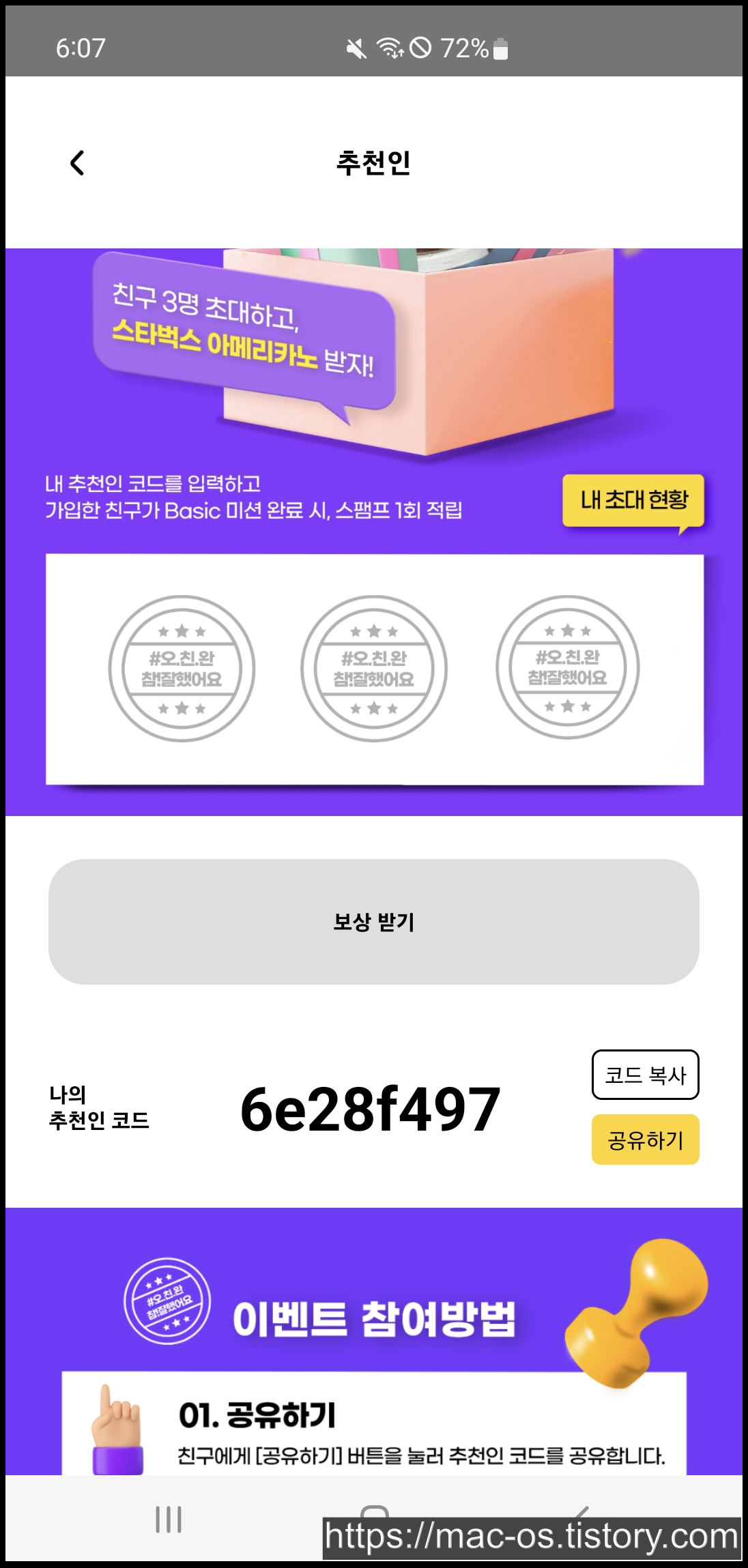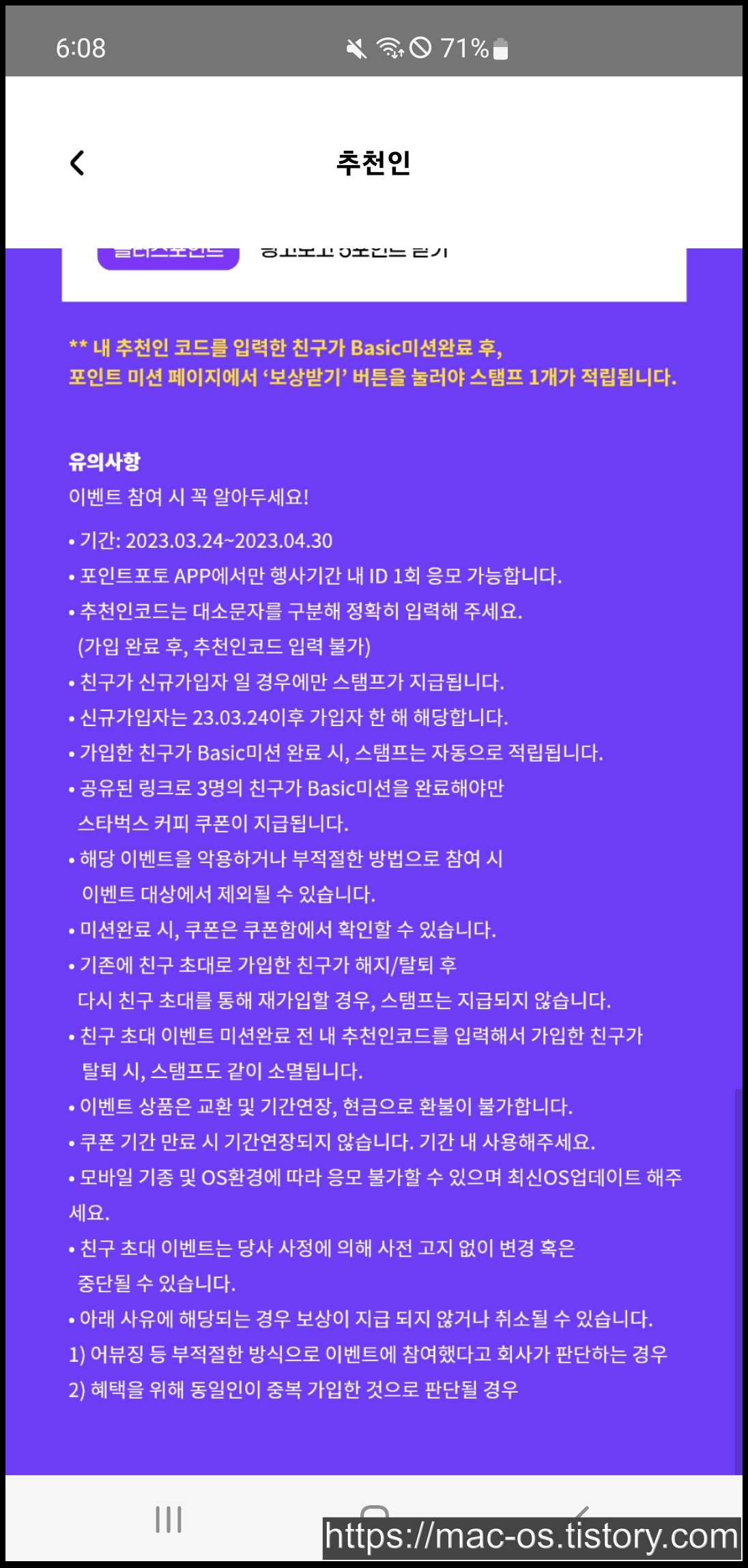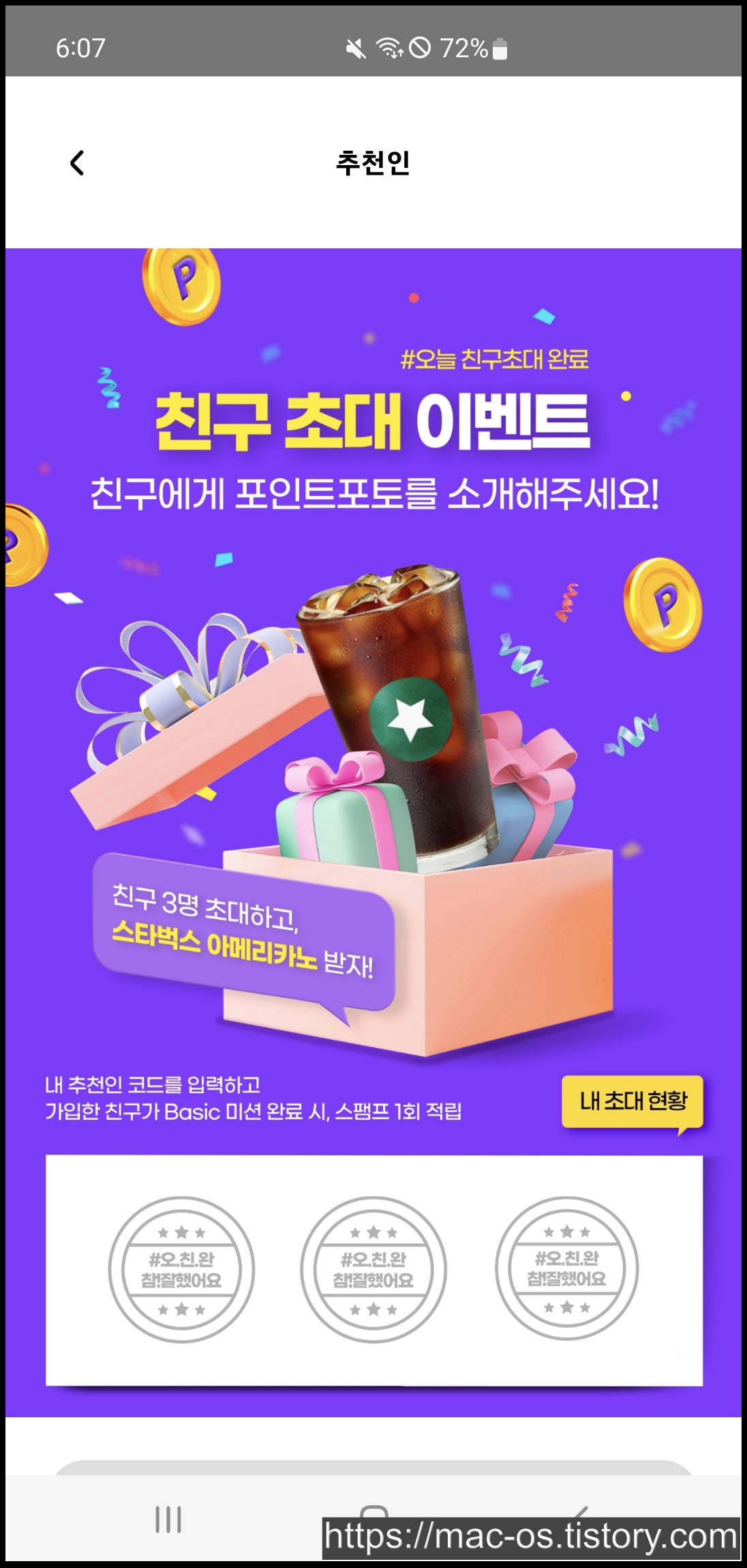 포인트포토에서 진행하는 친구초대 이벤트에 대해 살펴보자. 내 추천인 코드를 입력하고 가입한 친구가 Basic 미션을 완료하면 스탬프 1회가 적립된다.
