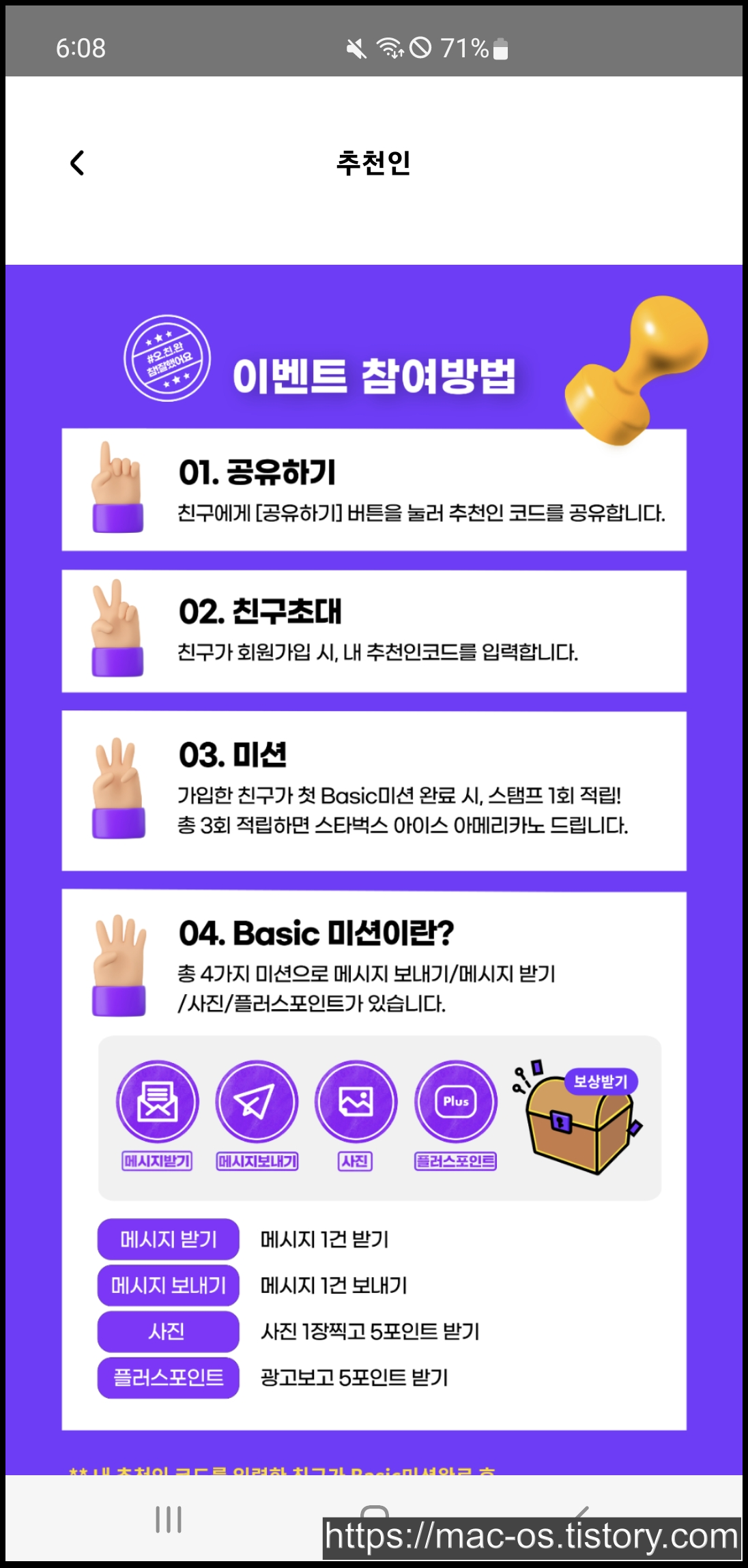 스탬프를 총 3회 적립하면 스타벅스 아이스 아메리카노를 받을 수 있다. Basic 미션이란 메시지받기, 메시지보내기, 사진, 플러스포인트로 구성되는 4가지의 미션을 말한다.