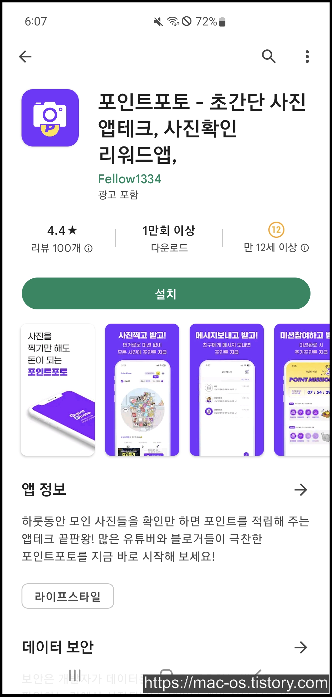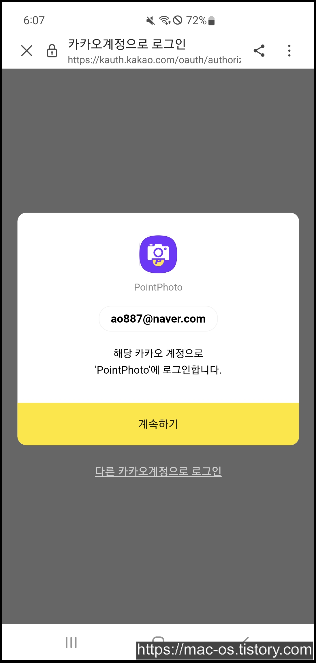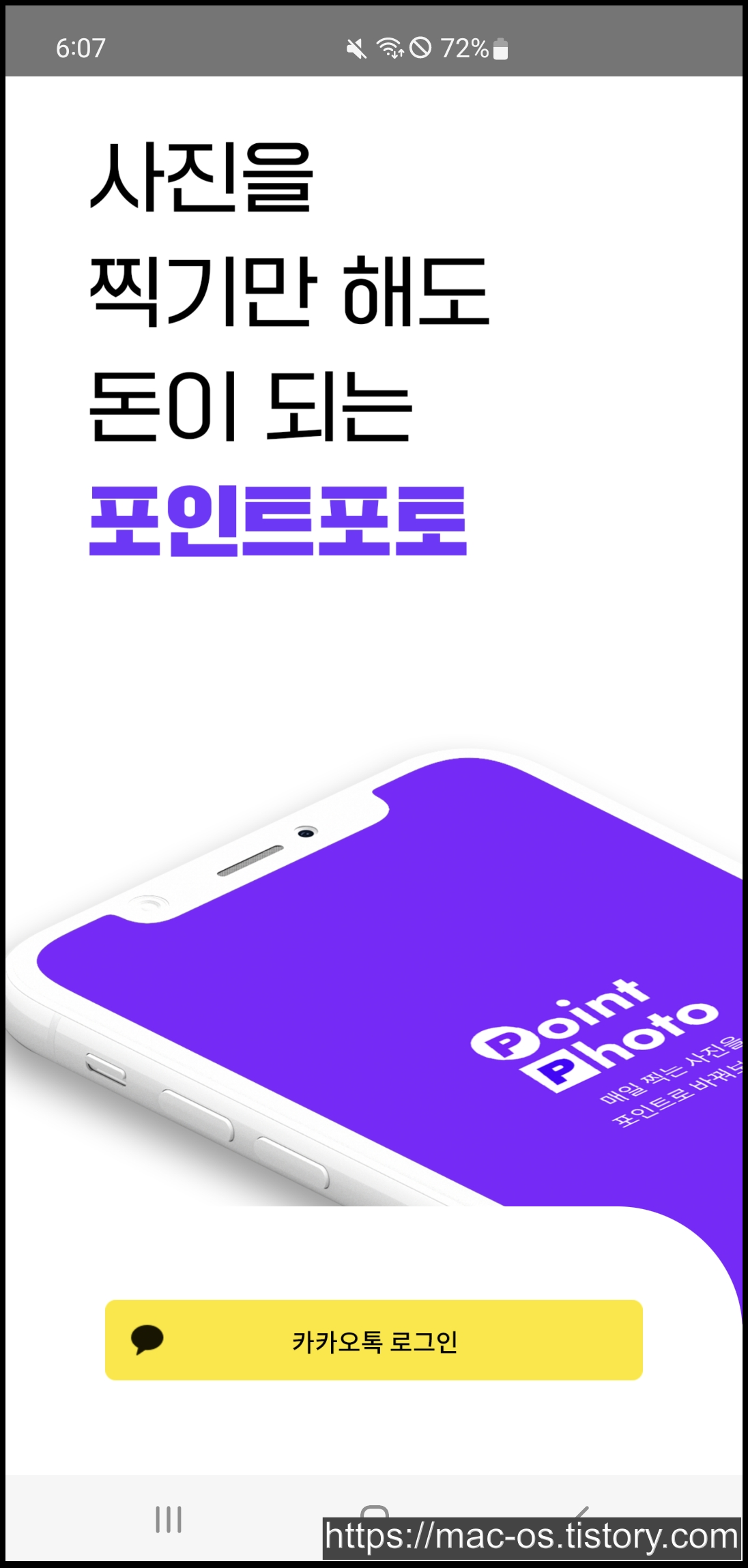 포인트포토는 구글 플레이 스토어에서 설치하고 카카오 계정으로 로그인할 수 있다.
