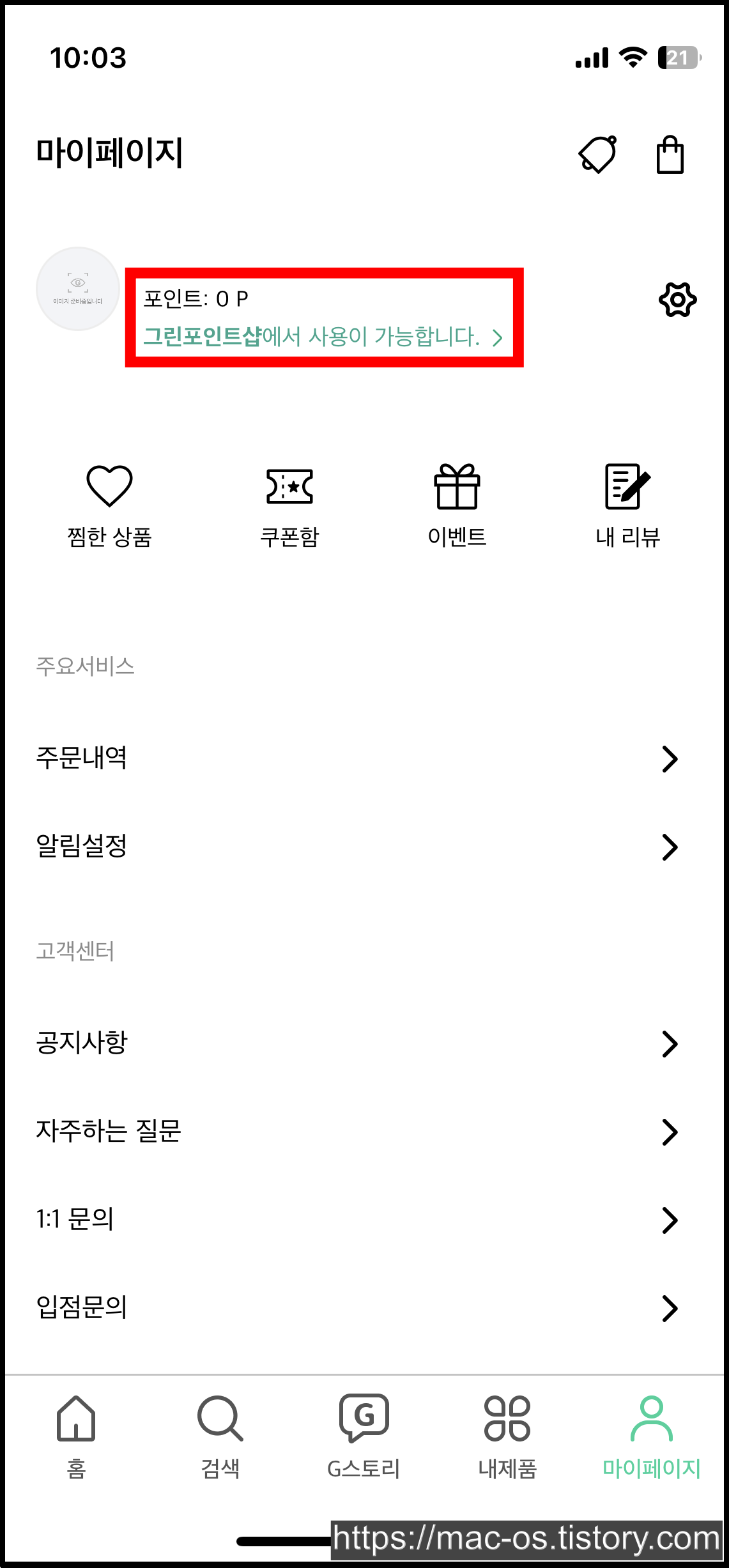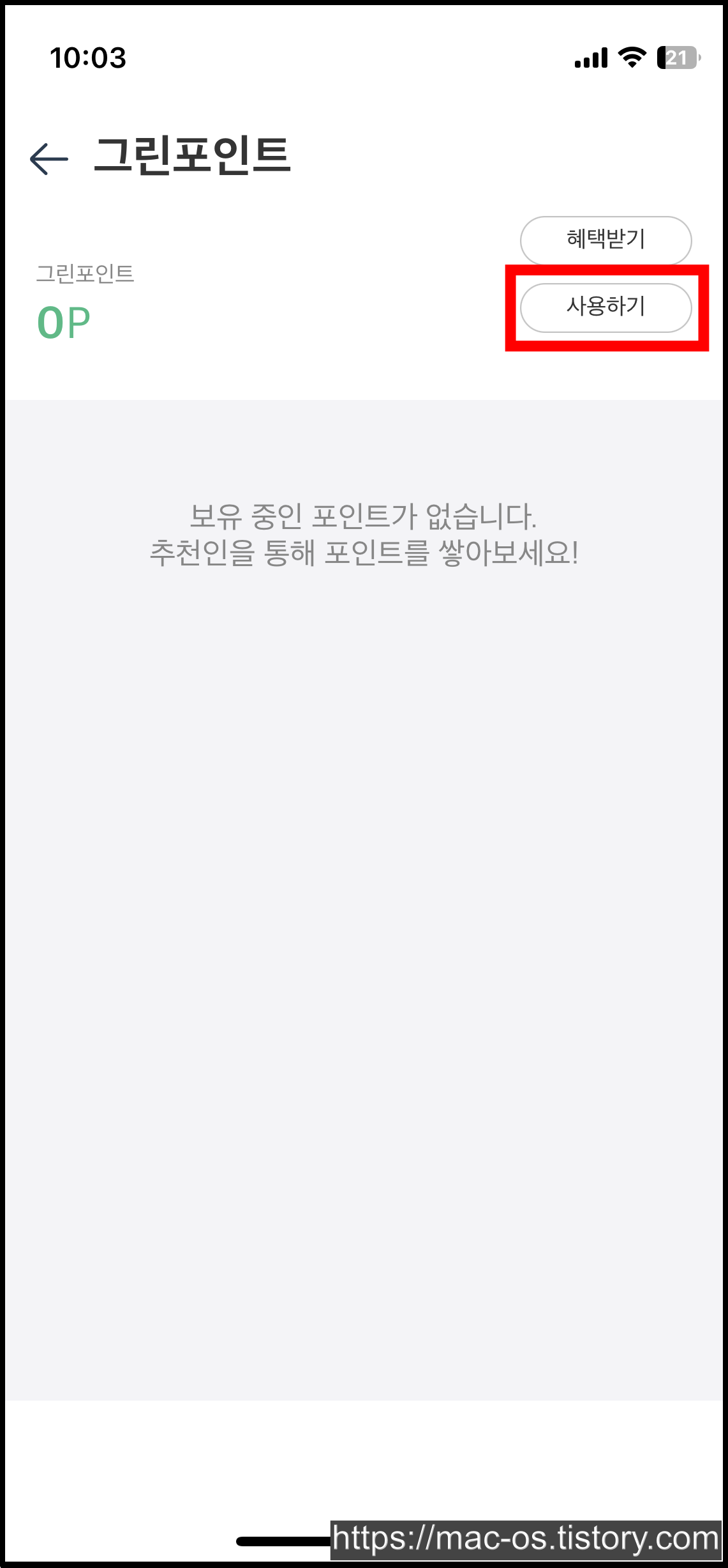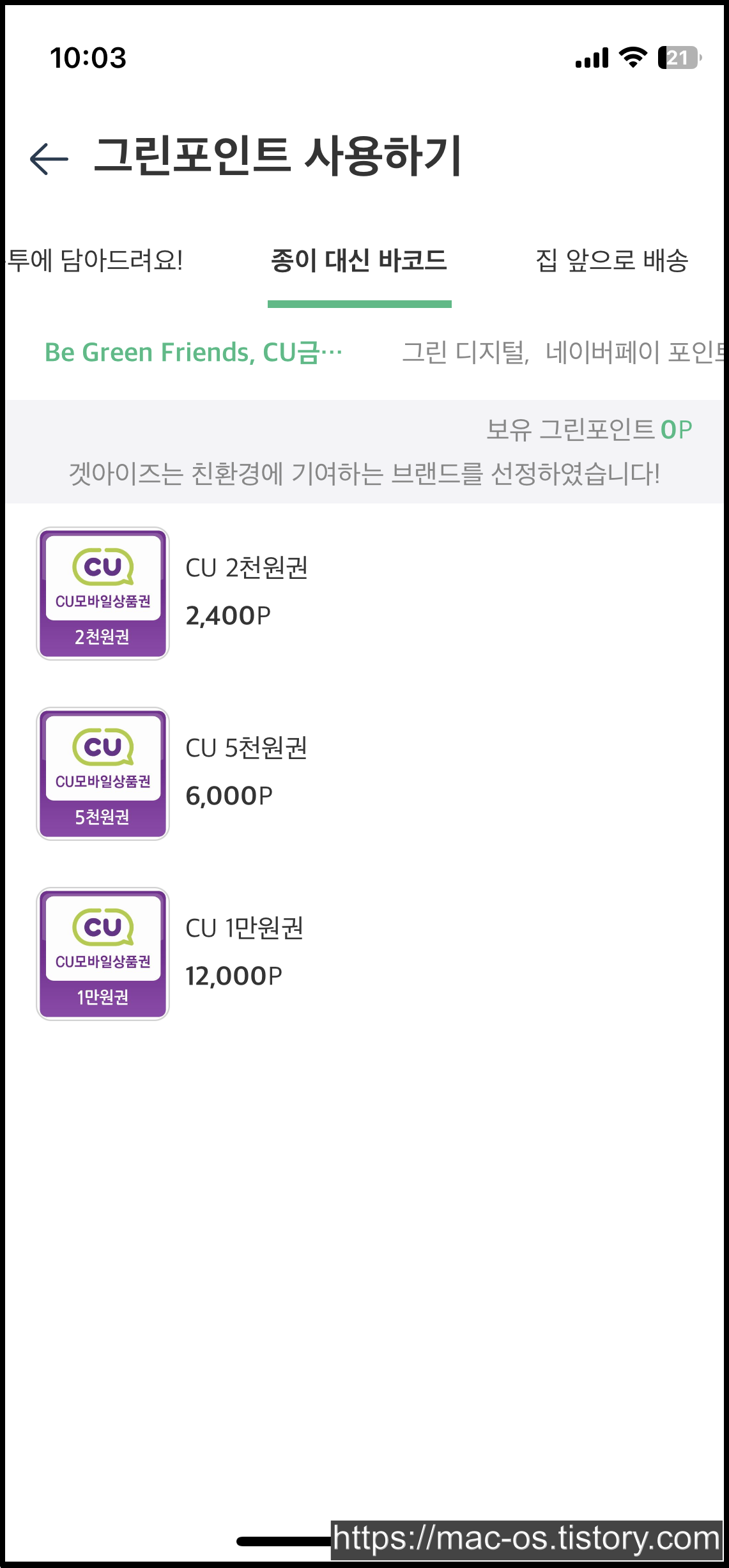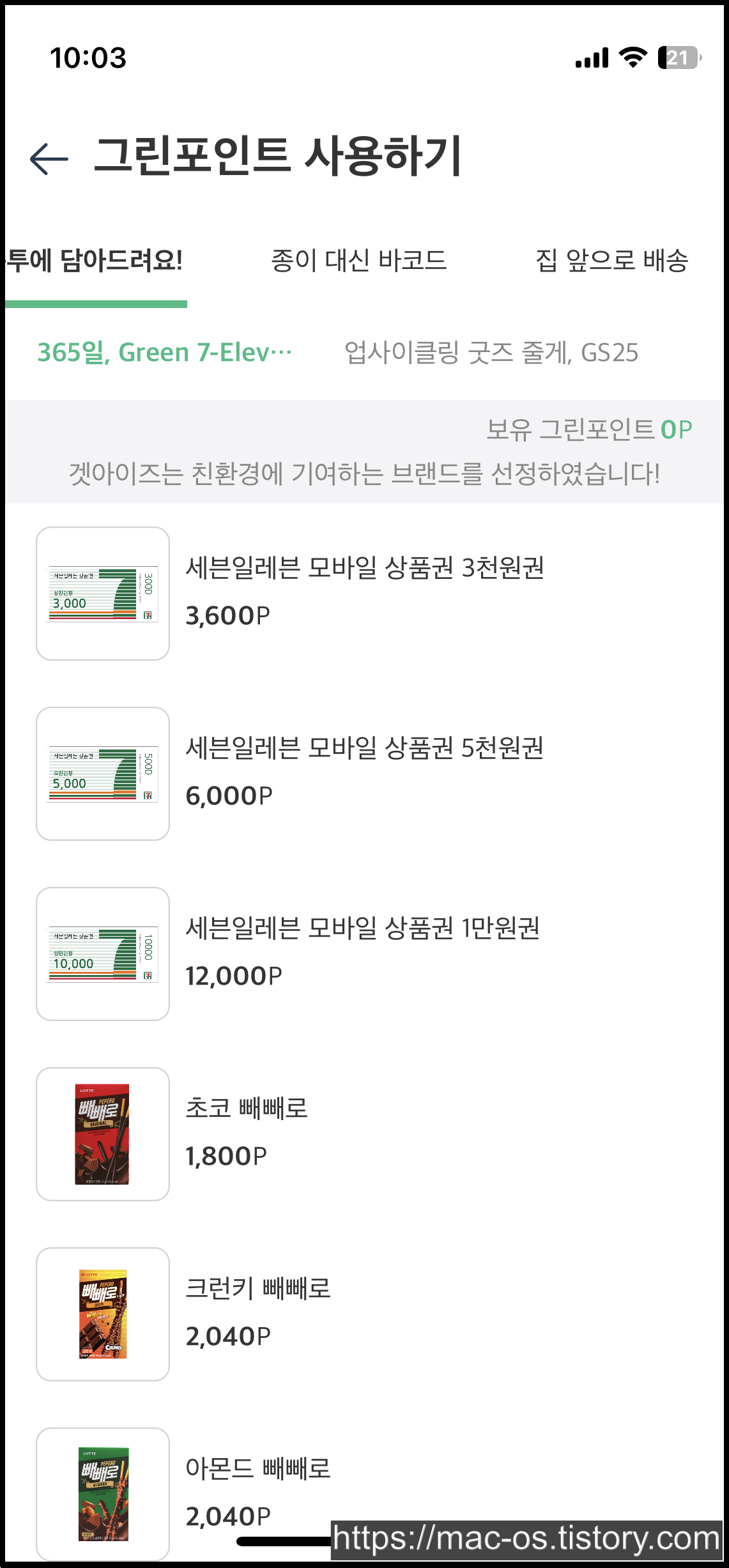 그린포인트샵은 [마이페이지] > [그린포인트] > [사용하기]를 순서대로 누르면 된다.