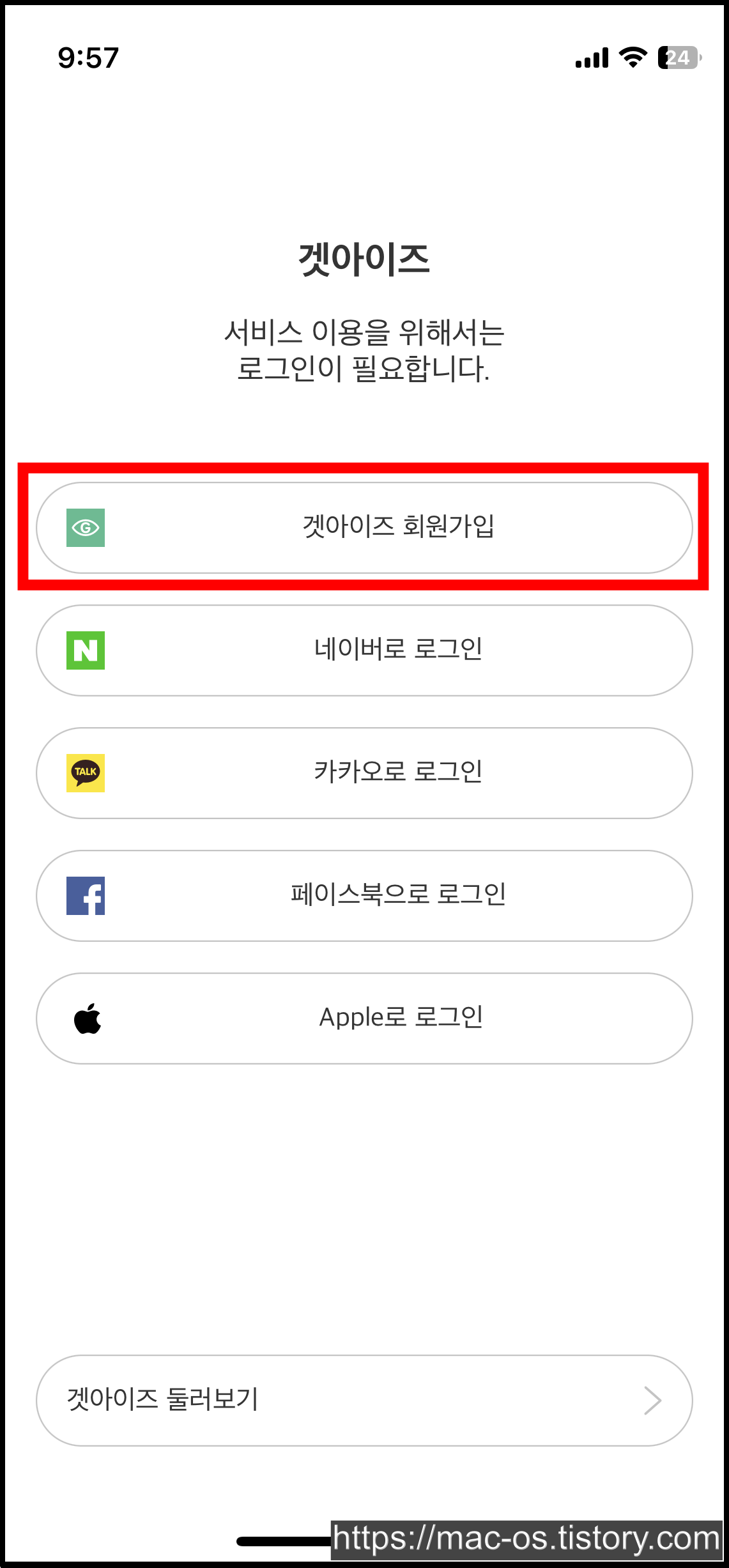 회원가입은 네이버나 카카오톡 등 소셜 로그인으로 간편 가입 또는 겟아이즈 회원가입으로 진행할 수 있다.