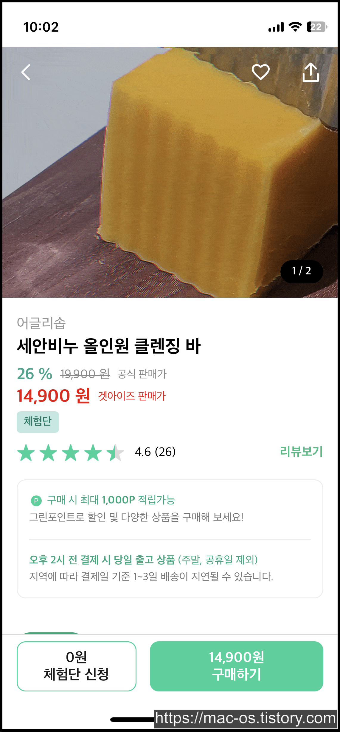 홈 화면에서 상단에 있는 세안비누를 터치해봤다. 구매시 포인트를 적립할 수 있으며, 오후 2시 전 결제 시 당일 출고된다.