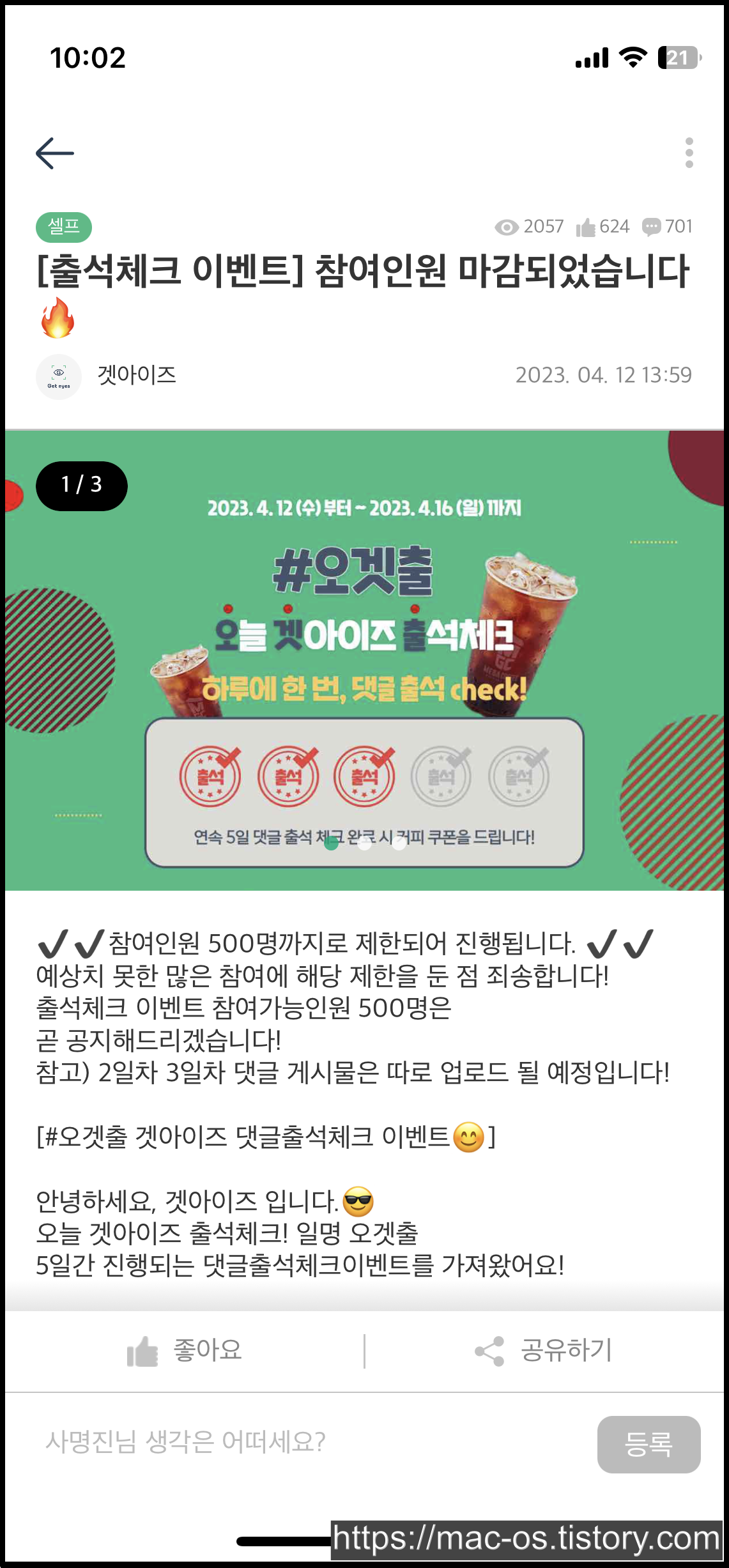 오늘 오후 1시 59분에 종료된 스타벅스 출석체크 이벤트다. 하루에 한 번, 연속 5일 댓글 출석 체크 완료 시 스타벅스 커피 쿠폰을 준다는데 참여인원 500명으로 종료되었다.