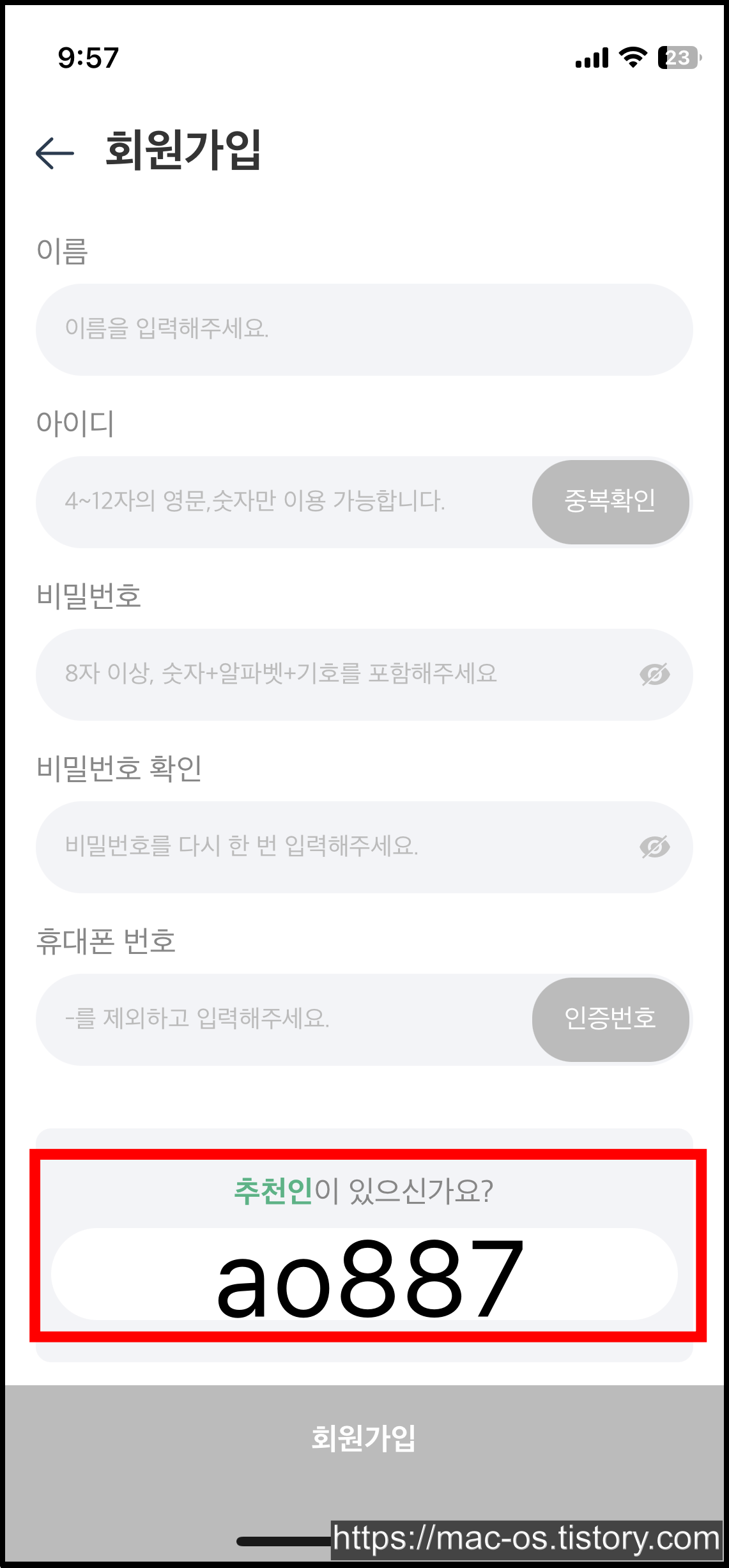겟아이즈 회원가입 페이지에서 추천인은 ao887을 입력하면 된다.