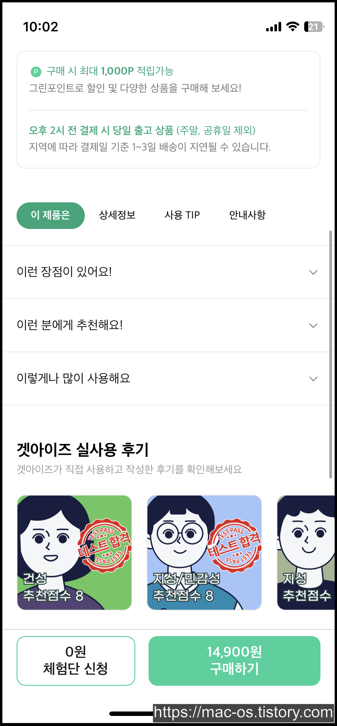 - 상품 구입 전 고민이 된다면 겟아이즈 검증단이 먼저 써보고 작성한 실사용 후기를 확인할 수 있다.