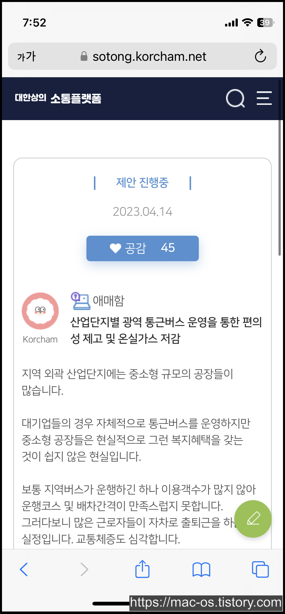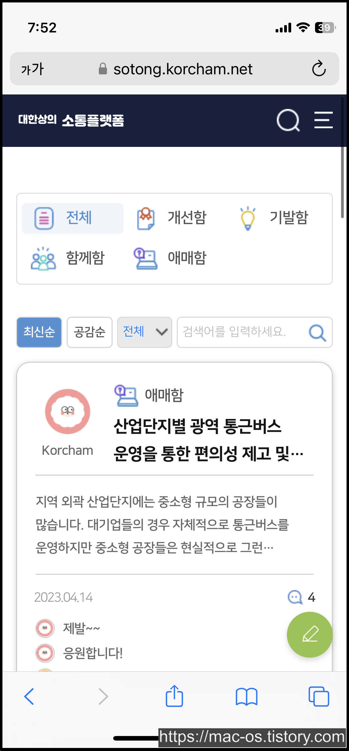 위 사진은 대한상의 소통플랫폼의 '제안하기' 페이지로, 경제·사회문제 해결을 위한 자신의 의견을 자유롭게 작성할 수 있으며, 같은 생각의 글이 보이면 공감하기 버튼을 클릭하여 공감을 표시할 수 있다.