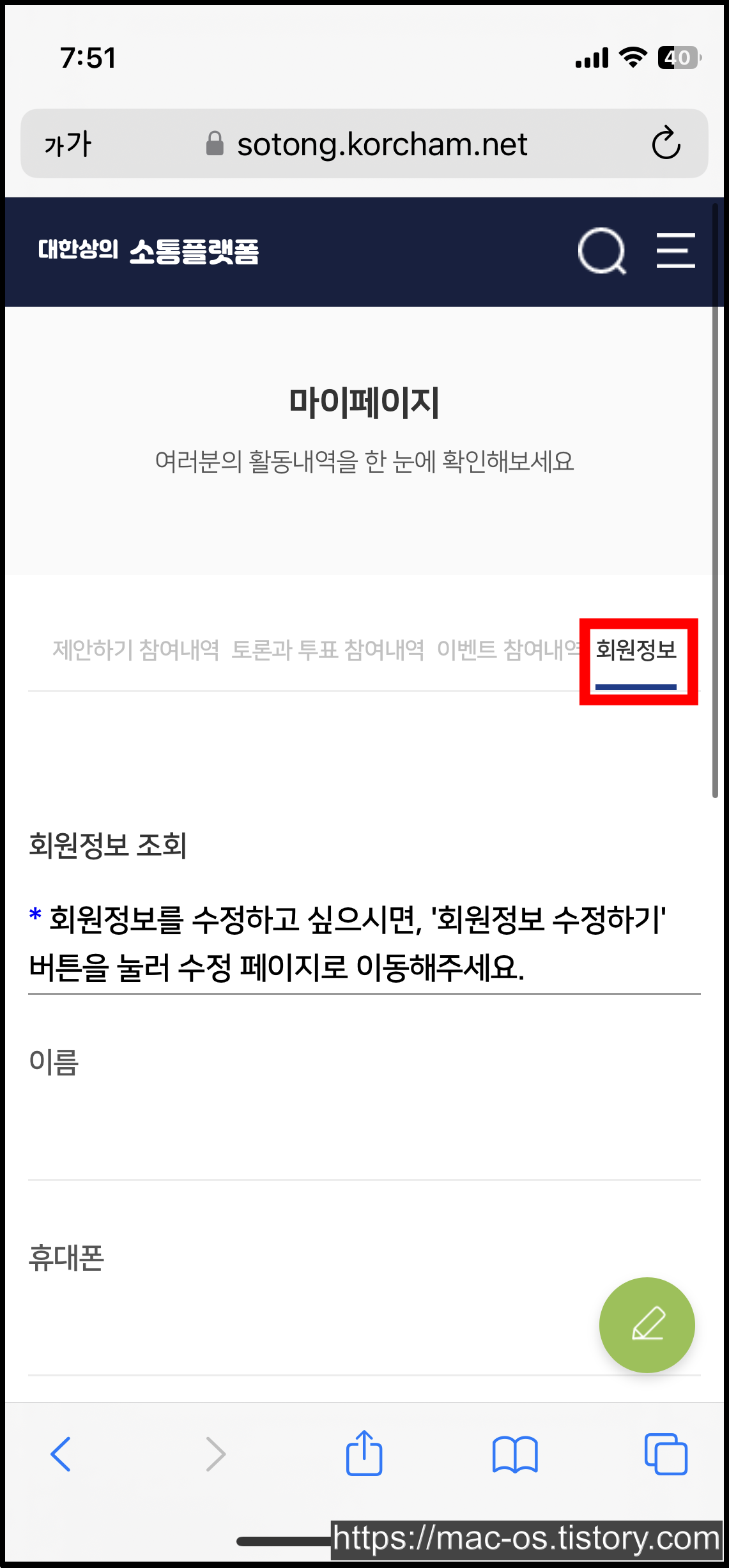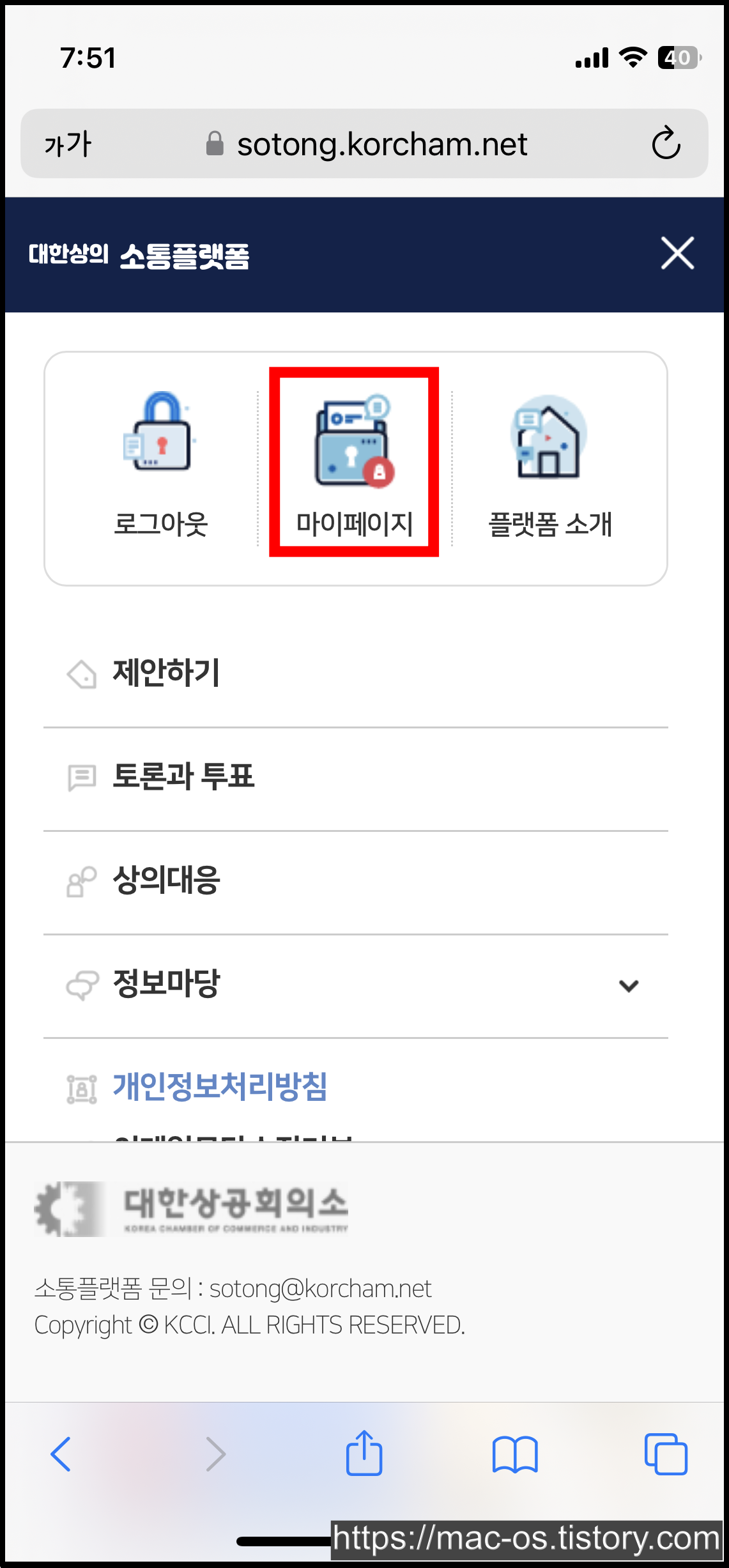 대한상의 소통플랫폼 회원가입 후 우측 상단 더보기 메뉴를 누르고 [마이페이지]로 이동한다.