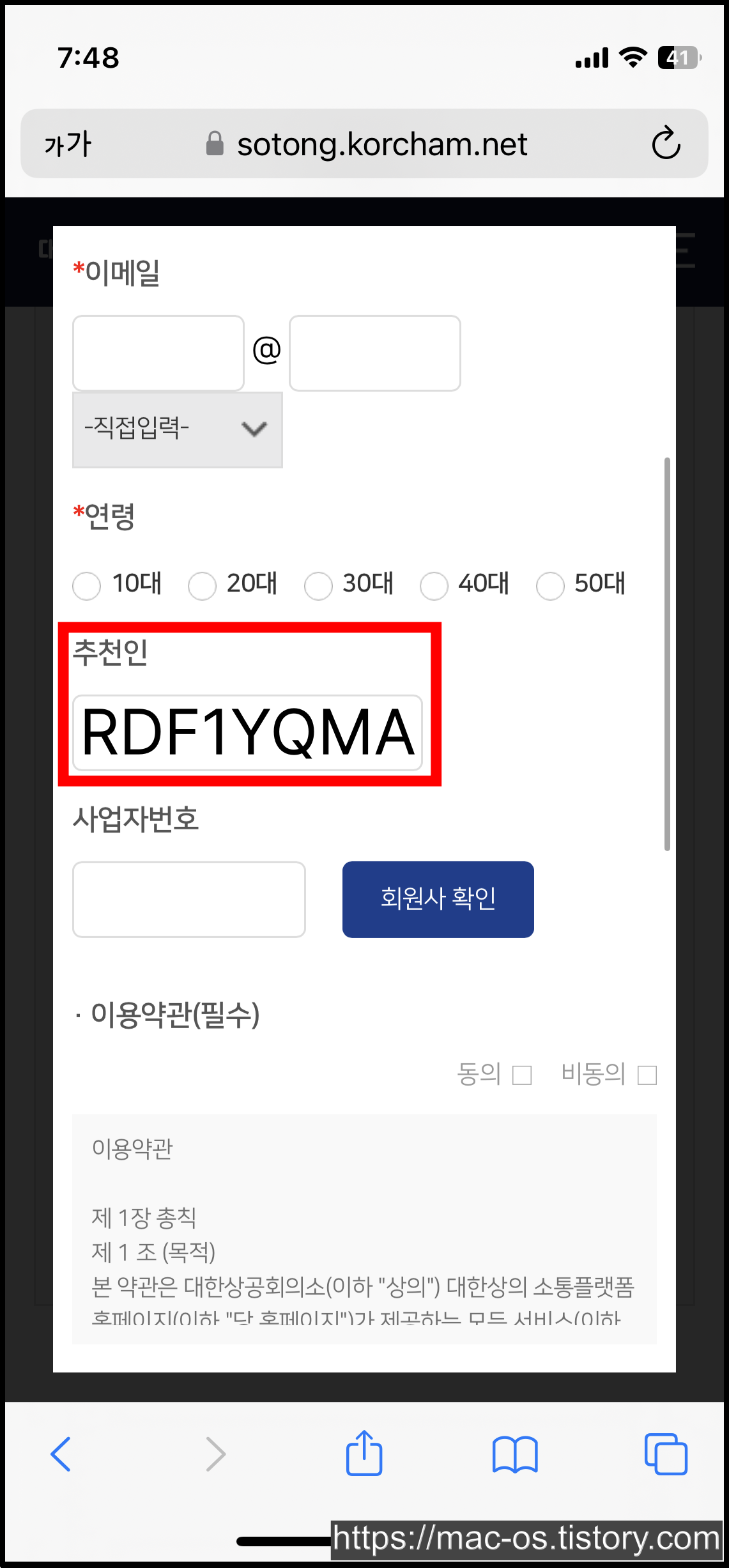 회원정보 입력 페이지에서 아래로 스크롤을 내려보면 추천인을 입력하는 칸이 있다. 여기에 RDF1YQMA를 복사해서 붙여넣기하고 가입하면 이벤트 참여가 완료된다.