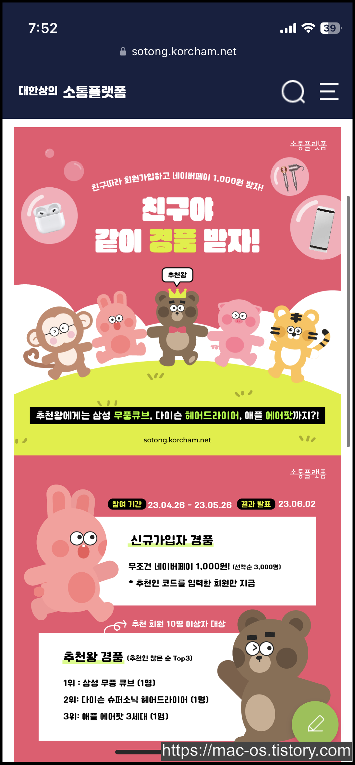2023년 4월 26일부터 2023년 5월 26일까지 진행되는 이벤트로, 신규회원은 이 기간 내에 추천인 코드를 입력하고 가입하면 2023년 6월 2일에 네이버페이 1,000원권을 받을 수 있다. 다만 선착순 3,000명이라는 제한이 있기 때문에 빨리 가입하는 것이 중요하다.