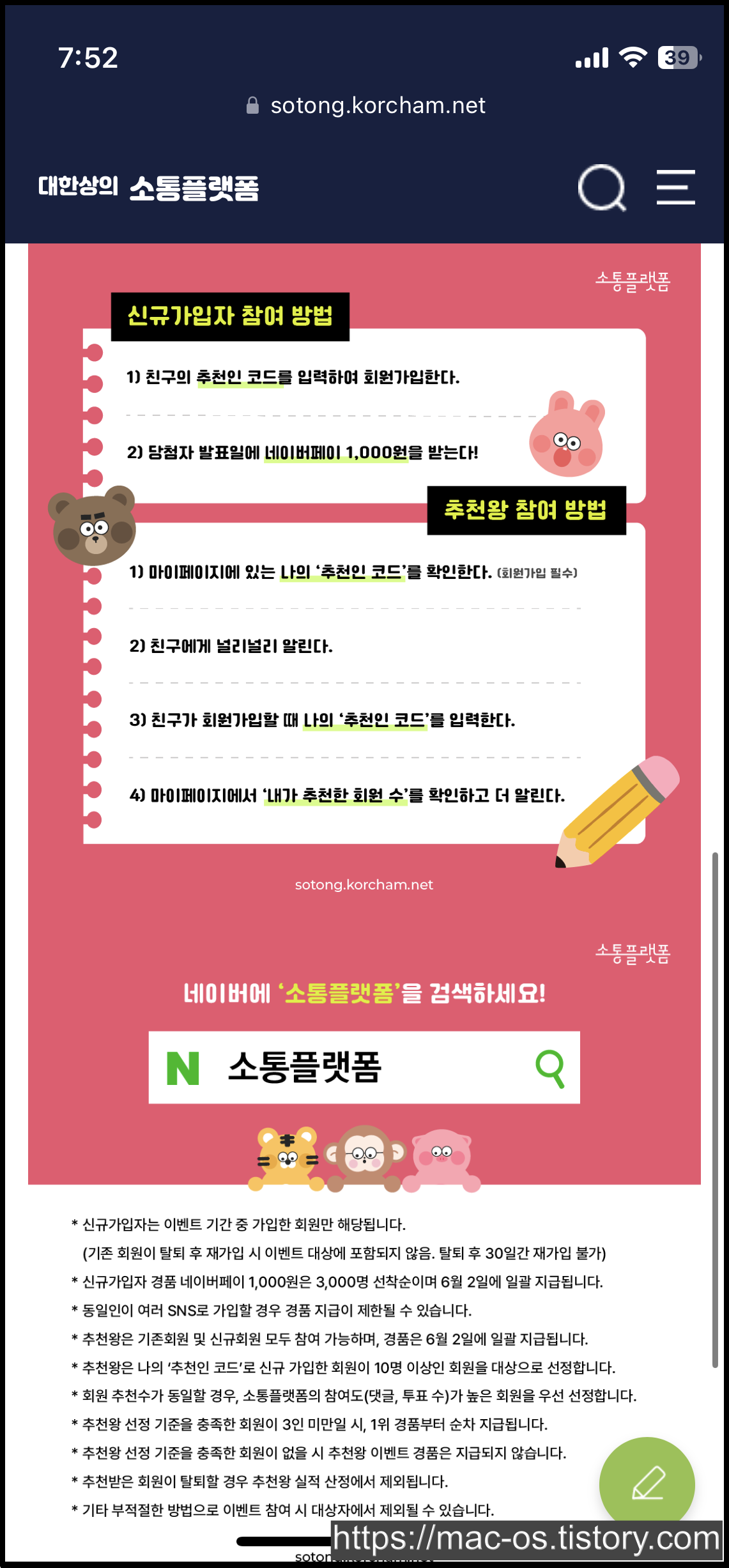 - 이벤트 내용 : 신규회원이 친구의 추천인 코드를 입력하여 회원가입하면 당첨자 발표일에 네이버페이 1,000원권을 지급