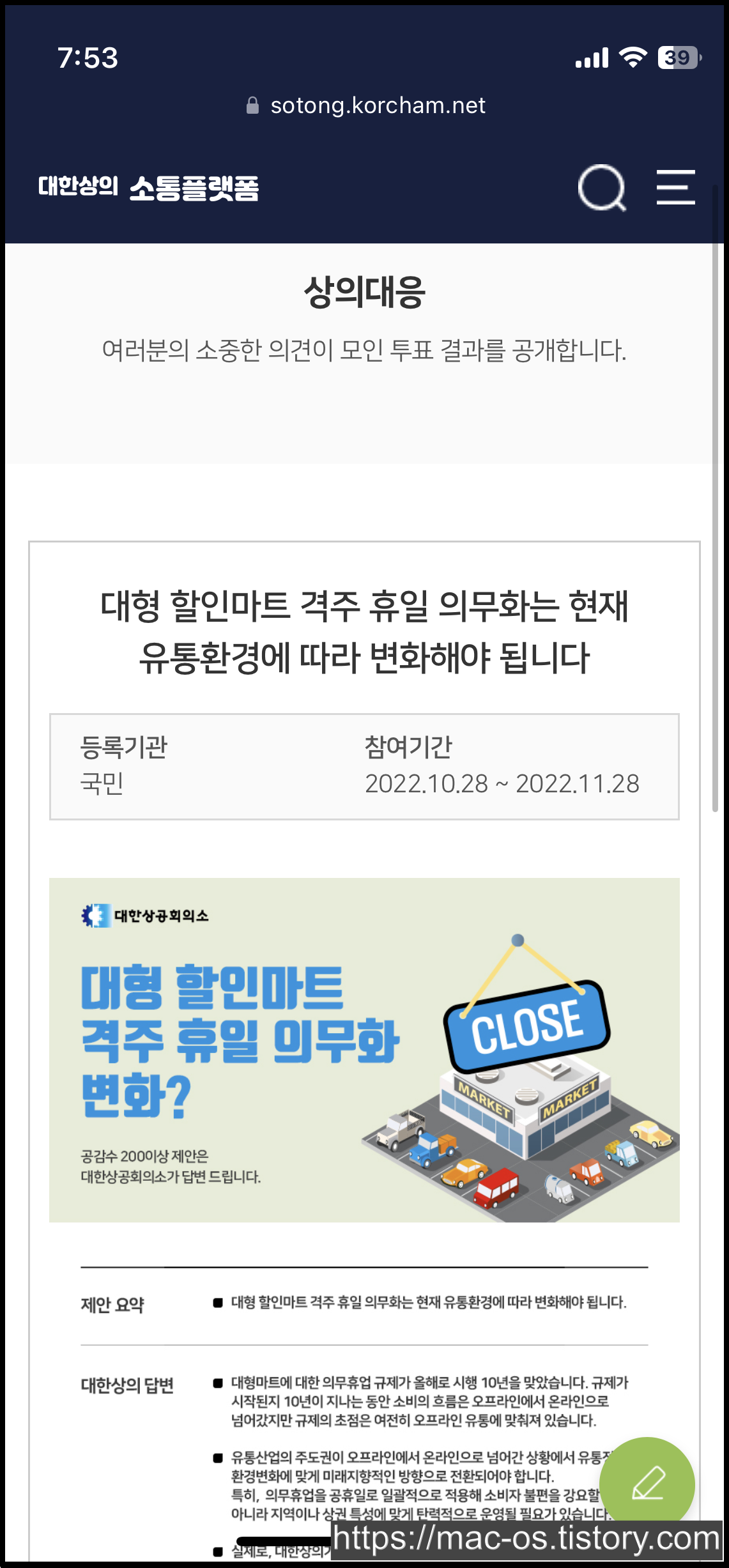 상의대응에서는 토론과 투표 결과를 볼 수 있다. 가장 최근인 2022년 10월에 게시된 '대형 할인마트 격주 휴일 의무화'에 대한 투표 결과에 대해 제안 요약, 대한상의 답변 등을 투표 참여자에 대해 공개하고 있다.