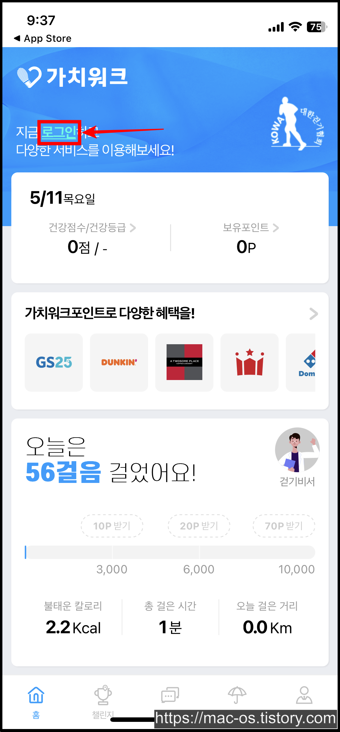 가치워크는 구글 플레이 스토어나 애플 앱스토어에서 설치 가능. 앱 실행 후 좌측 상단 [로그인]을 터치