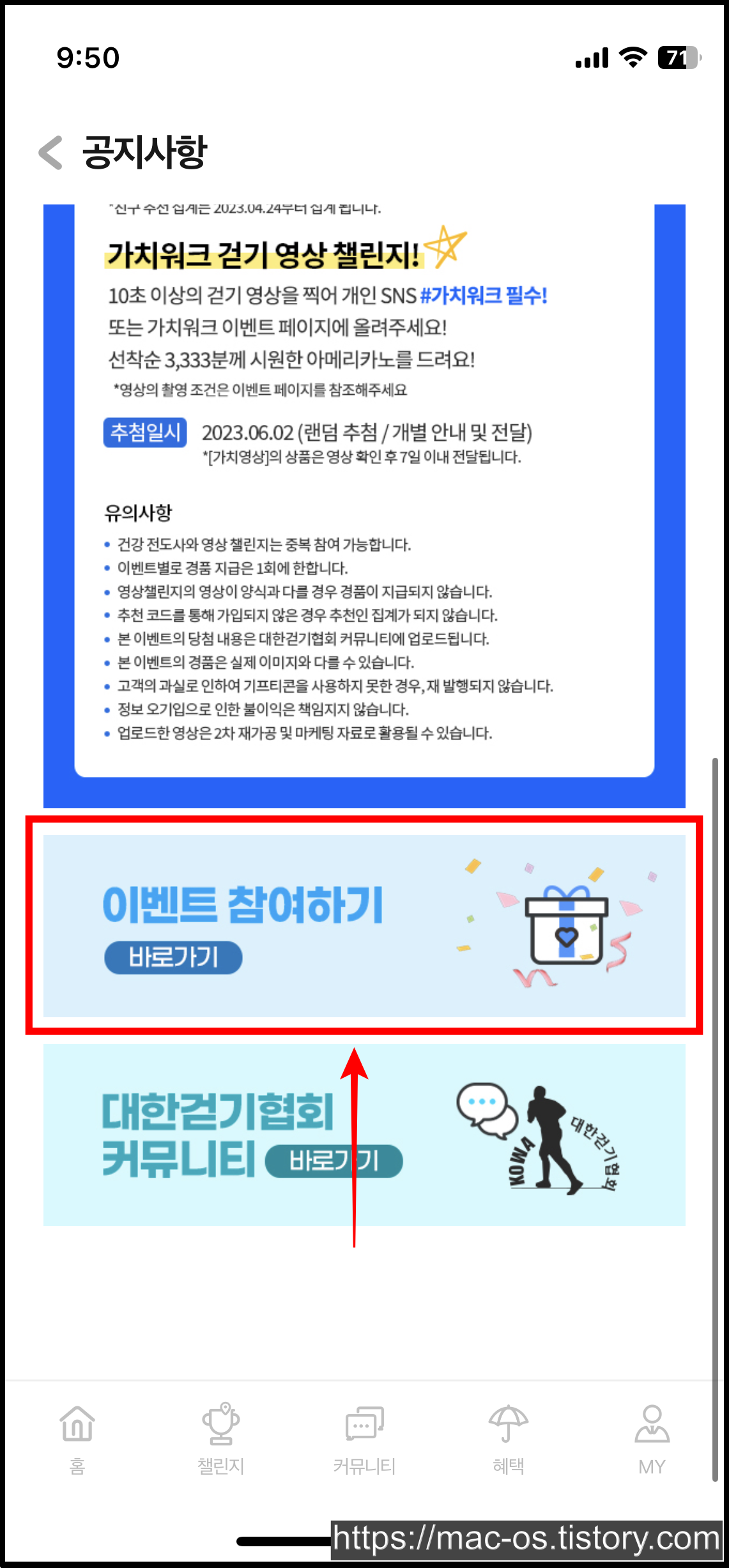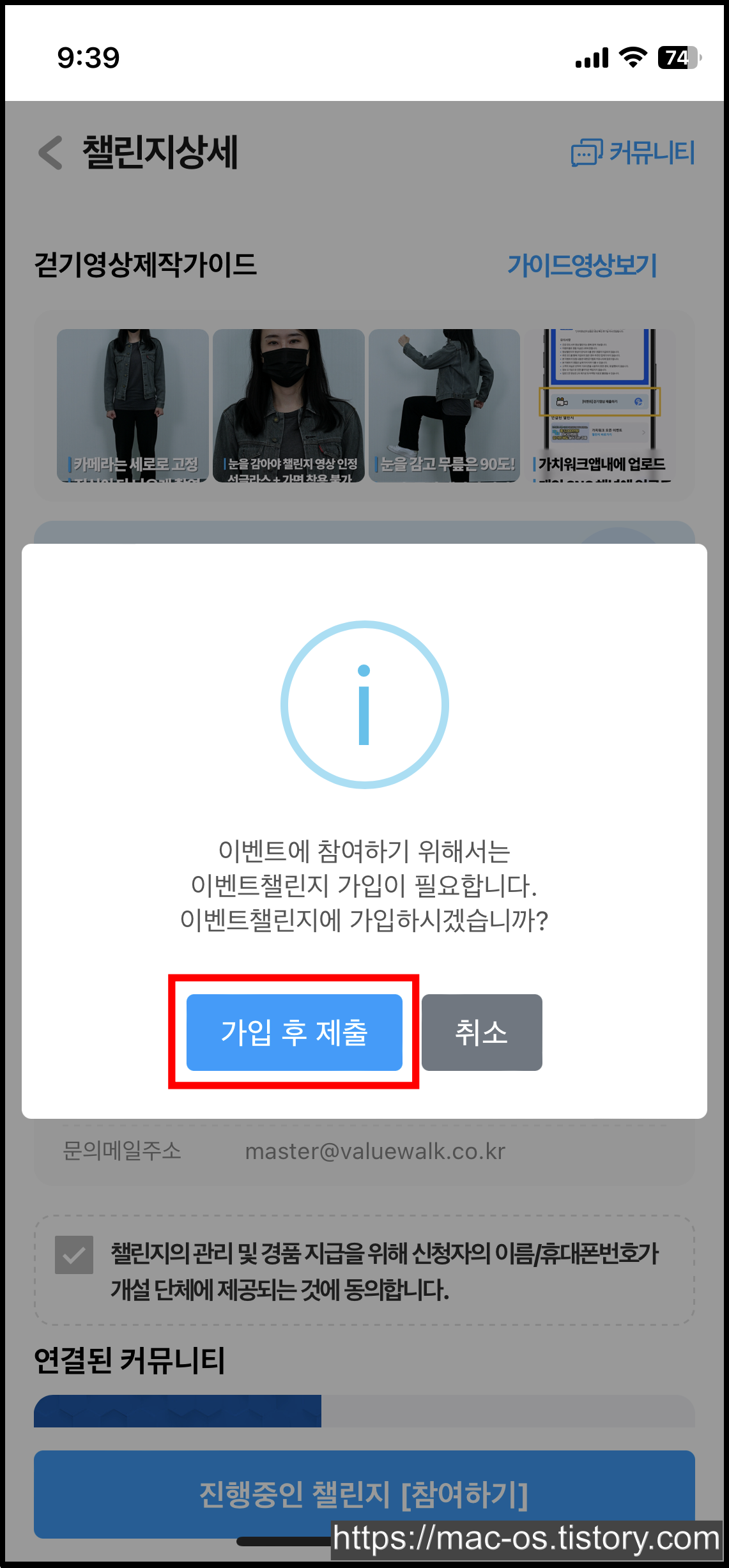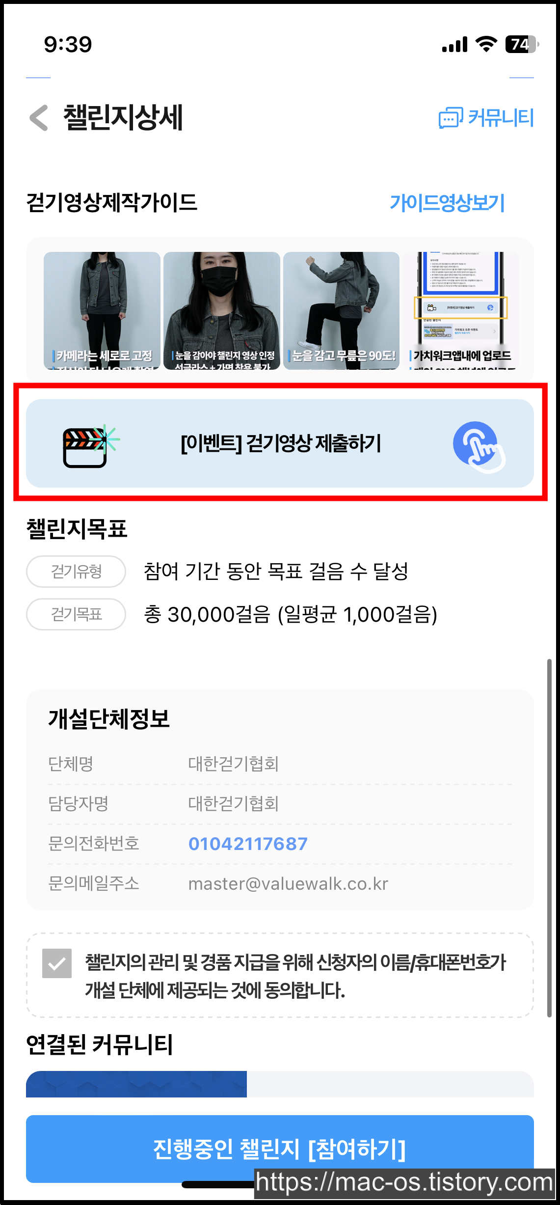 챌린지상세 페이지에서 스크롤을 내려 [걷기영상 제출하기] → [가입 후 제출] 터치