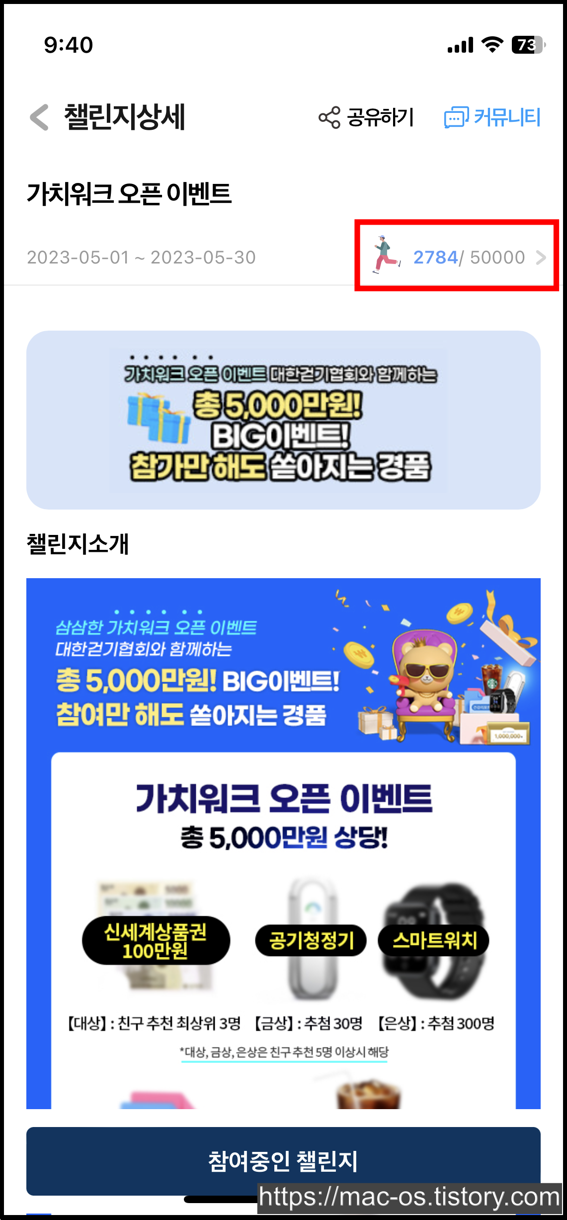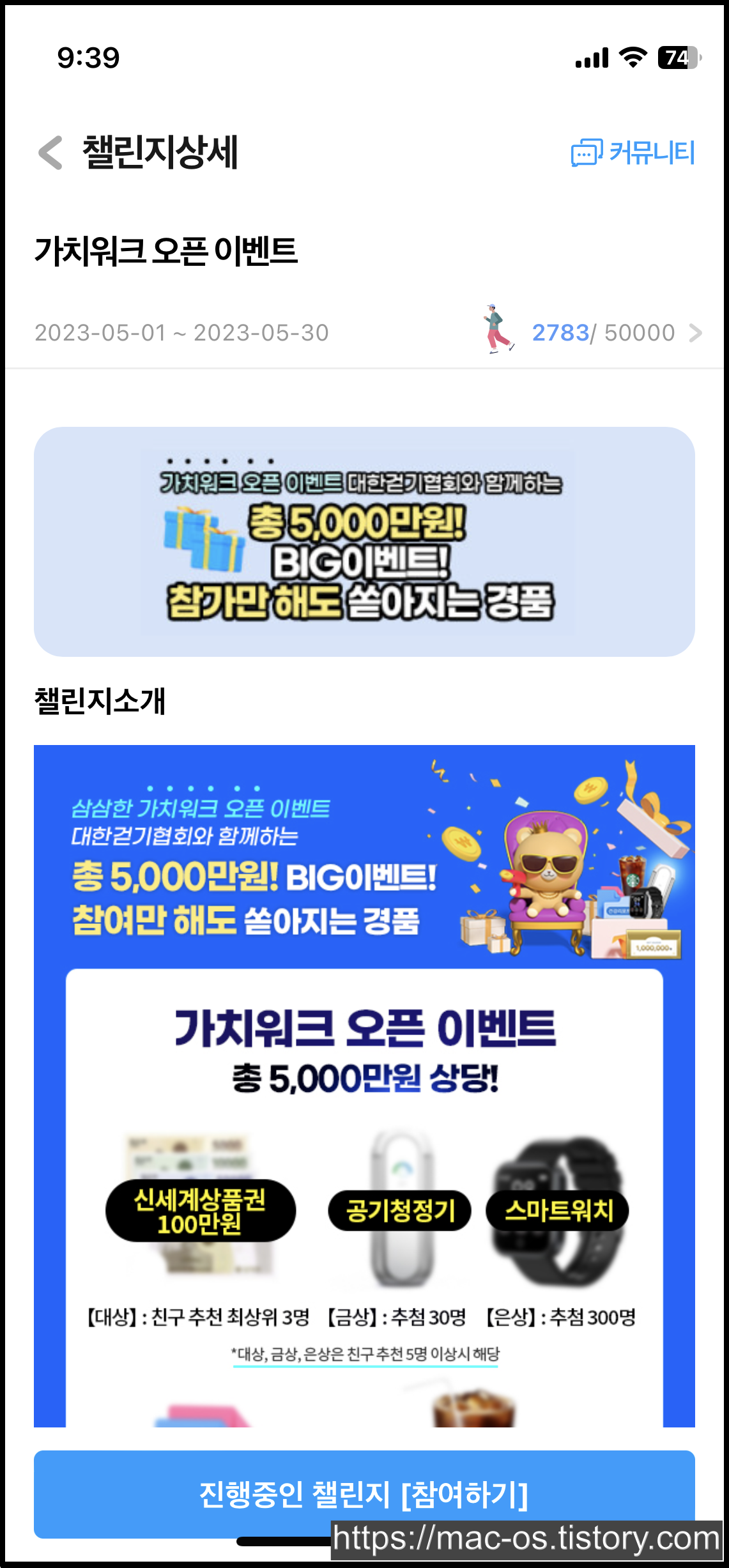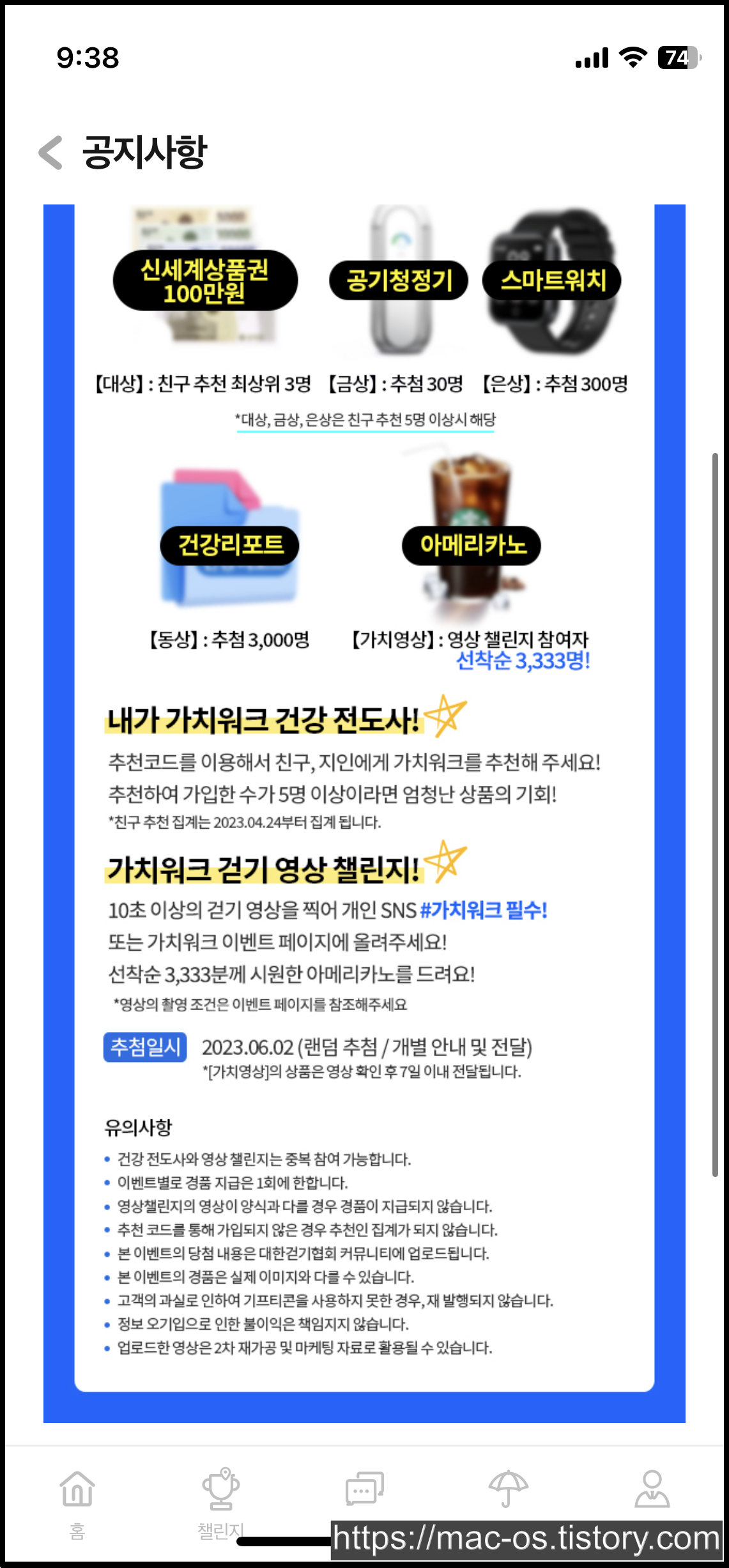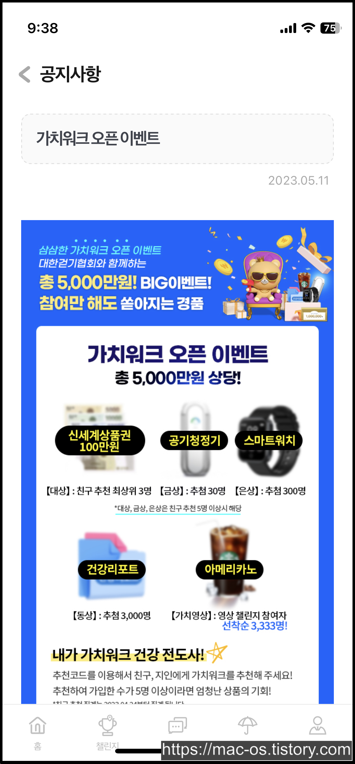 친구를 5명 이상 초대하면 자동으로 친구추천 이벤트에 응모되고, 이와 별개로 10초 이상의 걷기 영상을 찍어서 개인 SNS 또는 가치워크 이벤트 페이지에 등록하면 선착순 3,333명은 스타벅스 아메리카노 기프티콘을 받을 수 있음