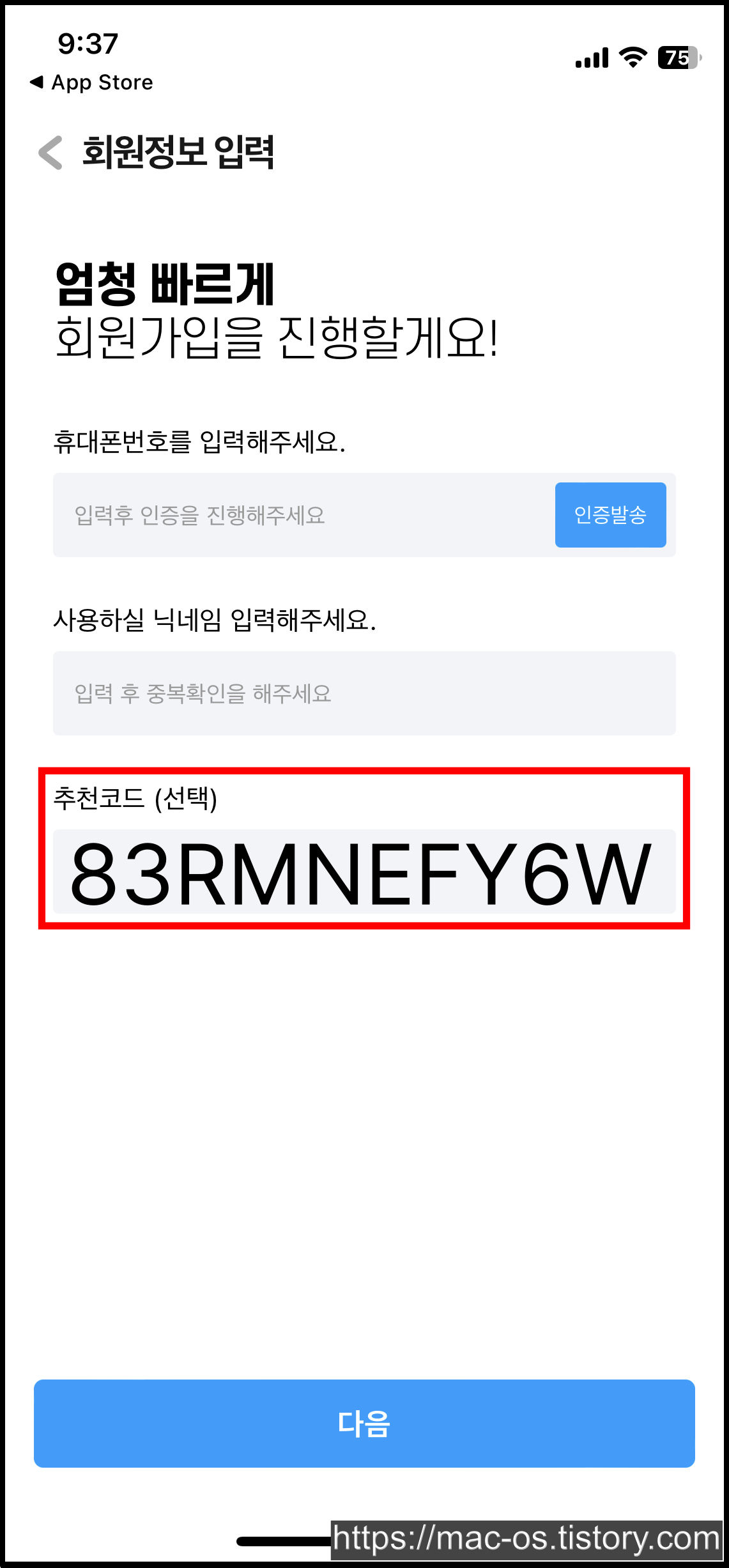 가입약관 확인 후 휴대폰 번호와 닉네임, 추천코드를 입력하면 회원가입이 완료됨 (오른쪽 화면에서 다음 버튼을 눌렀을 때 화면이 멈추는 경우가 있는데 앱을 종료했다가 다시 실행하면 회원가입이 완료된 것으로 나타나는 버그가 가끔 있음)