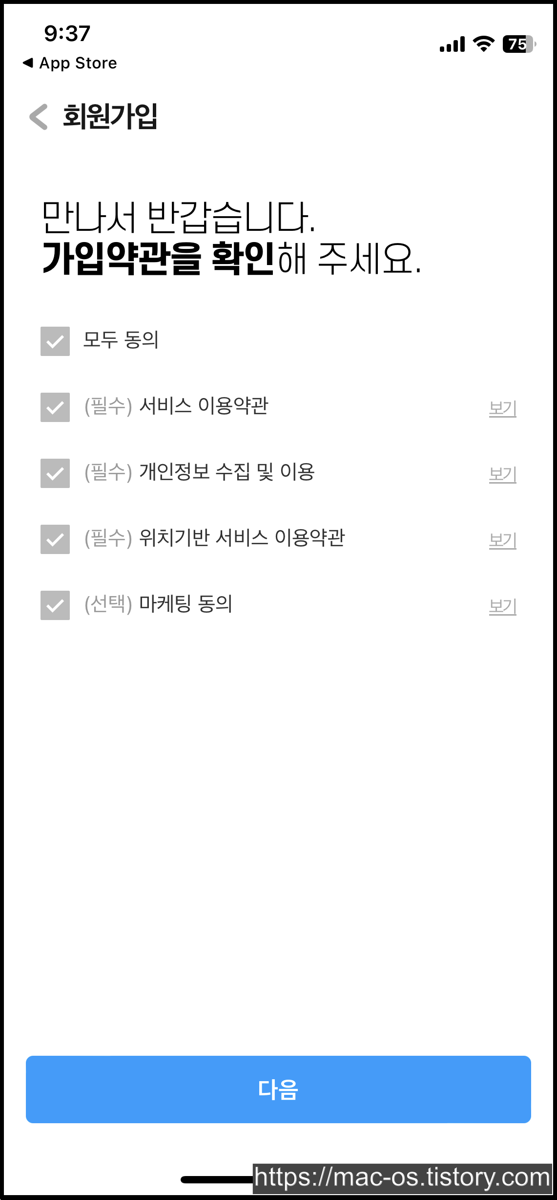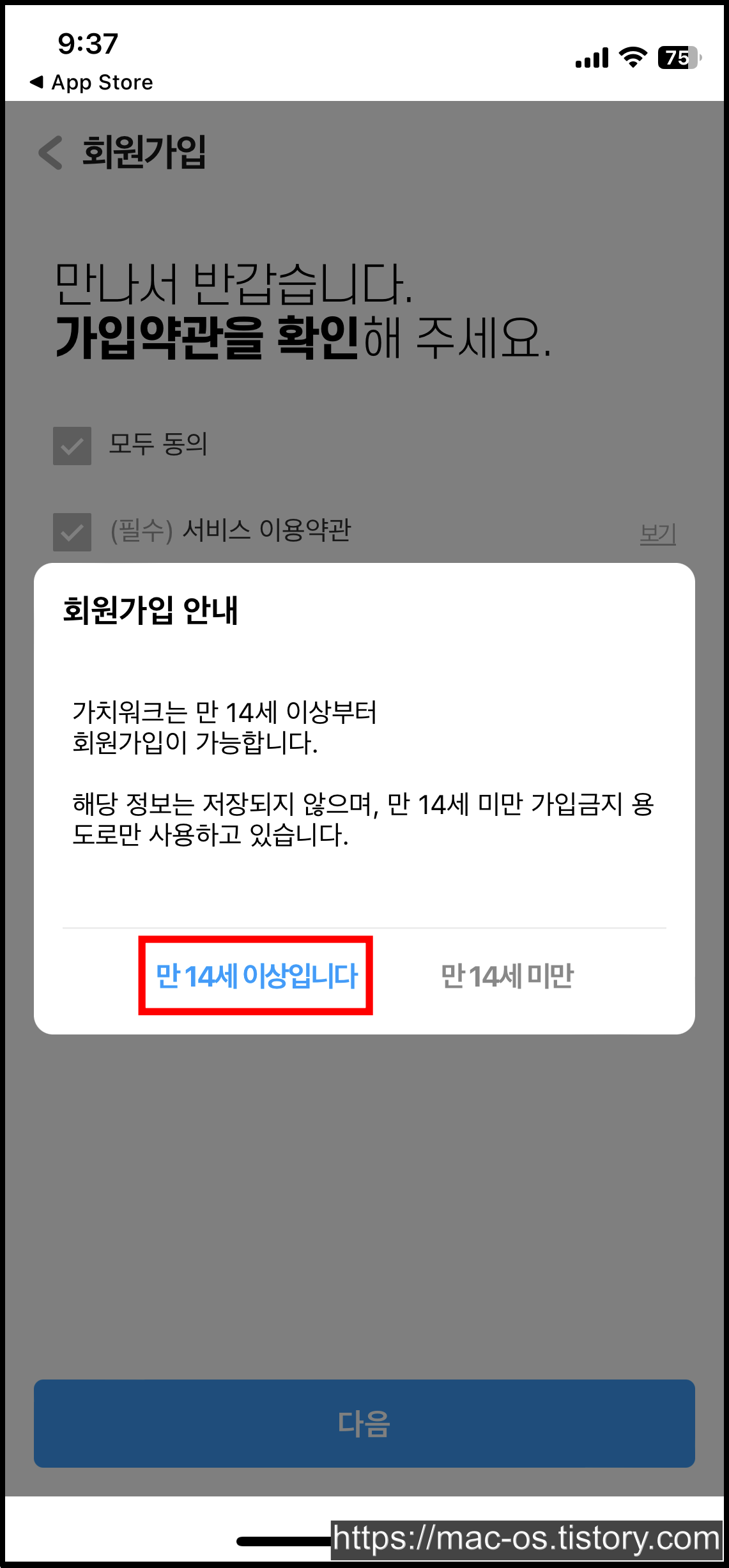 로그인 페이지에서 [회원가입하기] → [만 14세 이상입니다]를 순서대로 터치