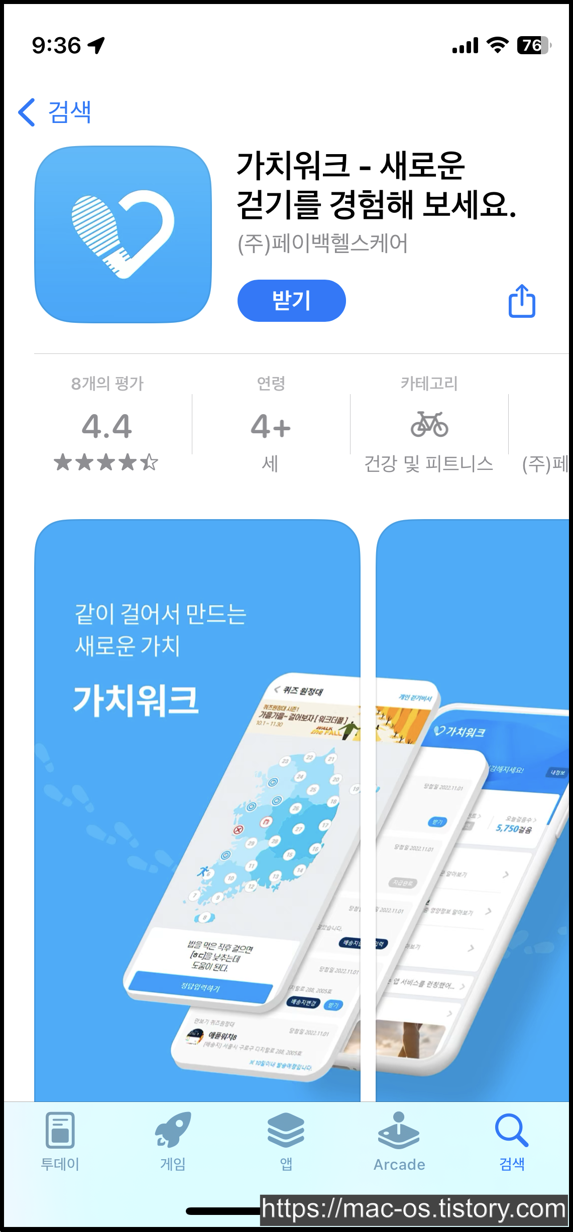 - 앱 특징 : 매일 1만 걸음을 걸으면 100포인트를 적립받을 수 있는 만보기 어플, 적립한 포인트는 스토어에서 커피/음료, 편의점, 피자/버거/치킨 등 기프티콘을 구매하는 데 사용 가능