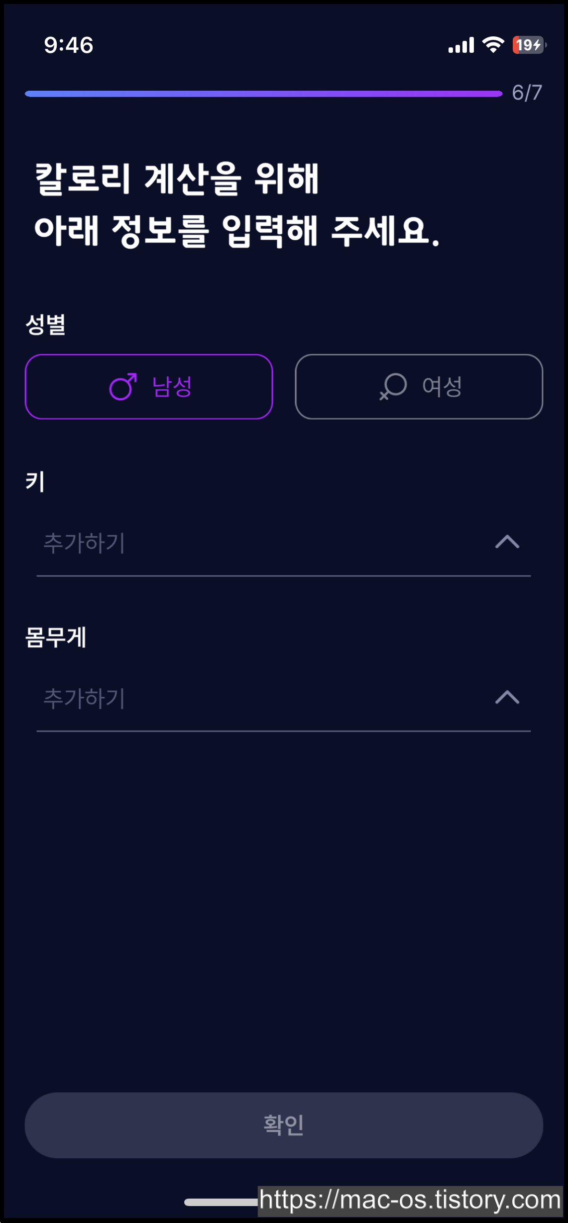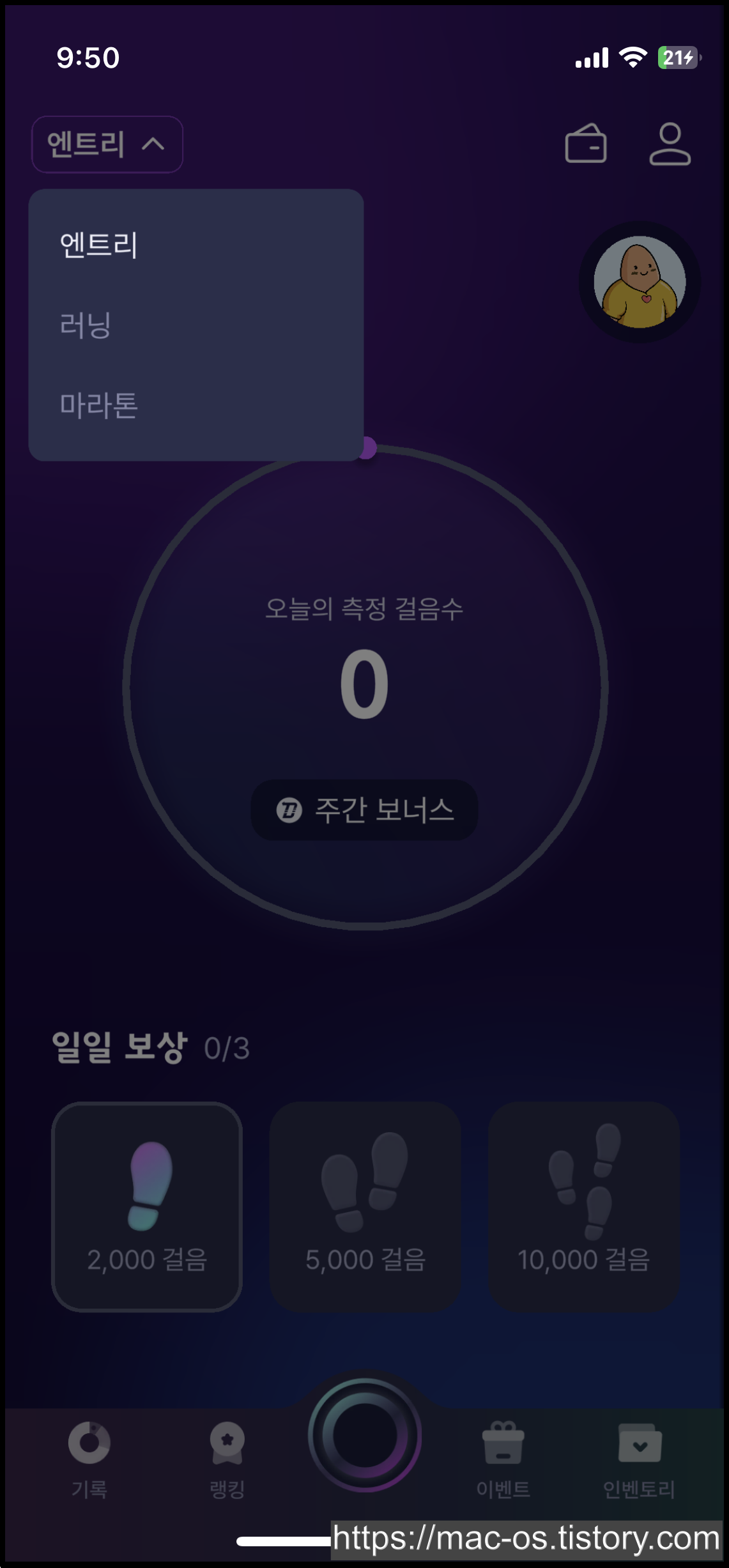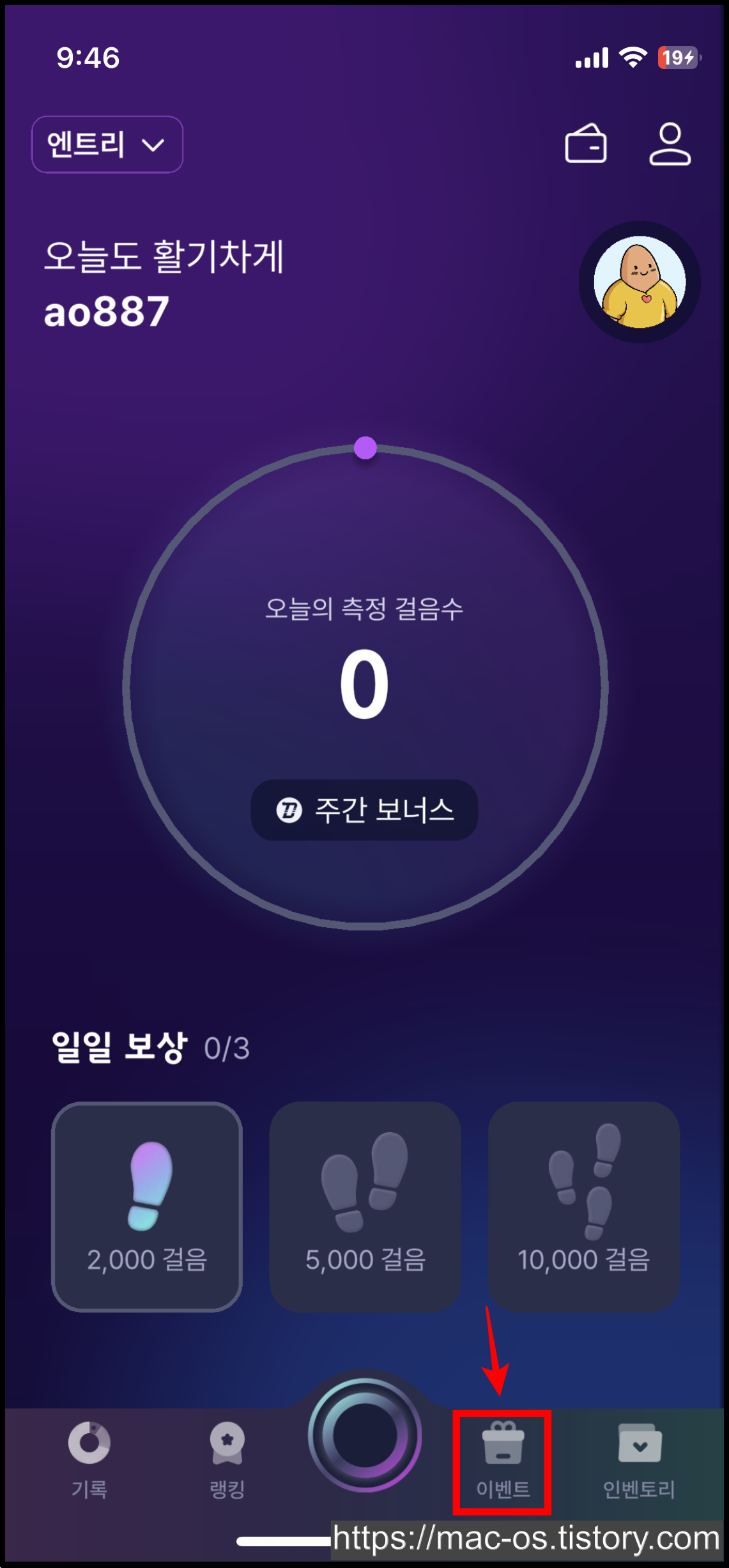 칼로리 계산을 위해 성별, 키, 몸무게 등 신체정보 입력을 하고나면 회원가입이 완료됩니다. 가입 후 하단 [이벤트] 탭 터치