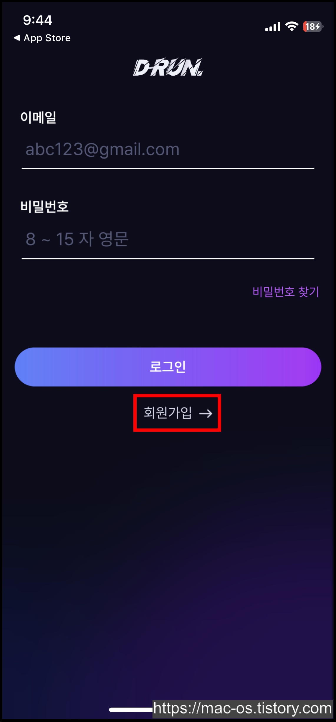 구글 플레이 스토어나 애플 앱스토어에서 D-RUN(디런) 앱 설치 후 로그인 페이지에서 [회원가입] 터치