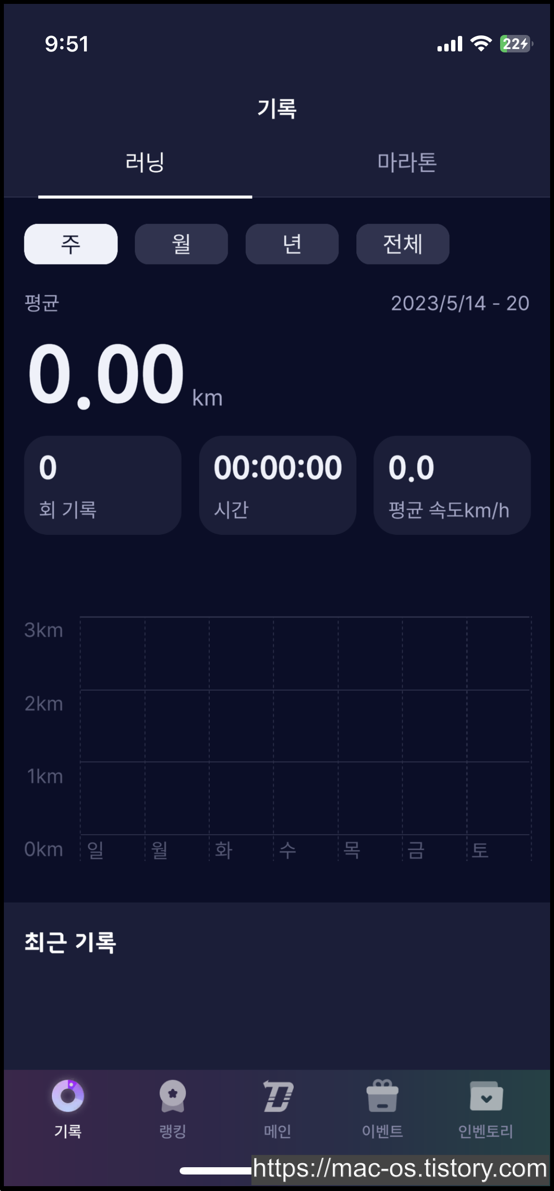 하단의 [랭킹] 탭과 [기록] 탭으로 이동하면 운동 랭킹과 운동 기록 기능을 이용할 수 있다.