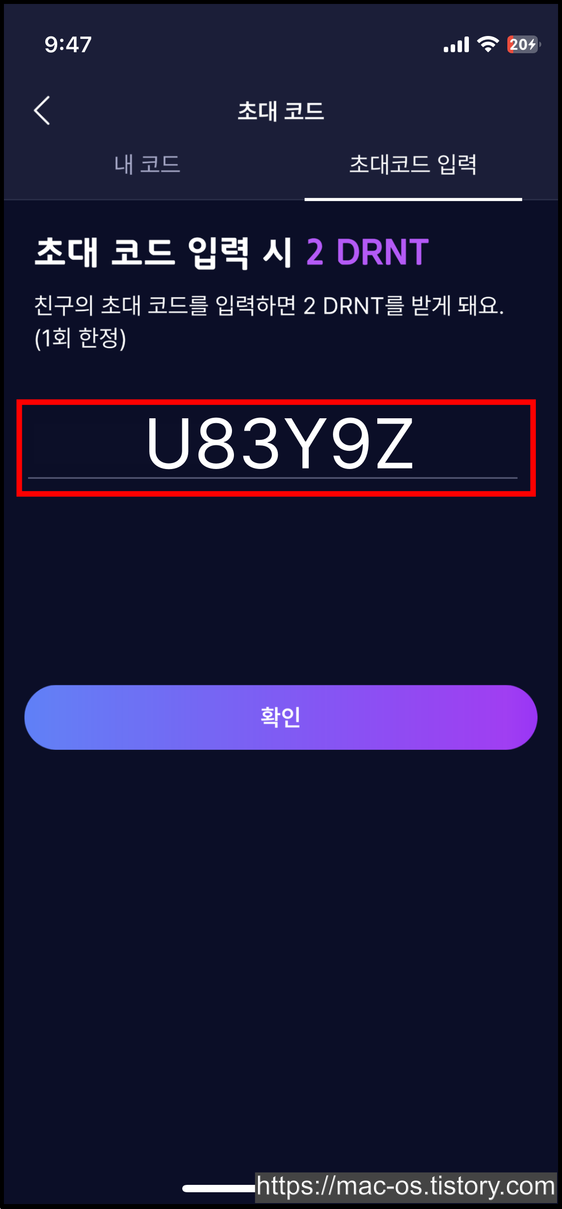 신규회원도 초대코드를 입력하면 초대 보상으로 2DRNT를 받을 수 있습니다.