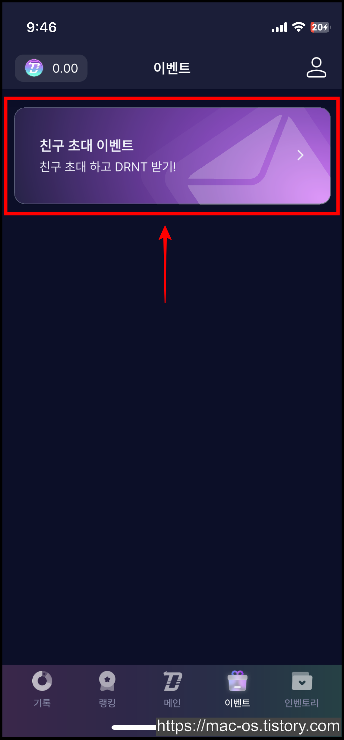 - 회원가입 후 하단 [이벤트] 탭에서 [친구초대 이벤트] 배너를 터치
