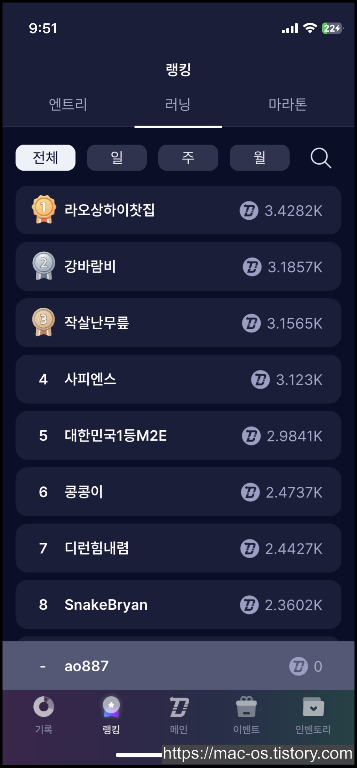 엔트리, 러닝, 마라톤 모드의 일간, 주간, 월간, 전체 랭킹을 확인할 수 있어 운동 동기를 부여한다.