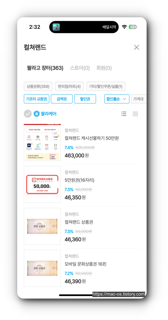 팔라고에서 기프티콘을 구매하려면 우선 캐시나 마일리지를 충전해야 한다. 캐시는 카카오페이/신용카드/네이버페이/TOSS 등 현금 결제를 의미하고, 마일리지는 컬쳐랜드나 틴캐시 등 상품권 결제를 의미한다. 캐시 충전은 수수료가 저렴하지만, 마일리지 충전은 수수료가 높은 편이다.