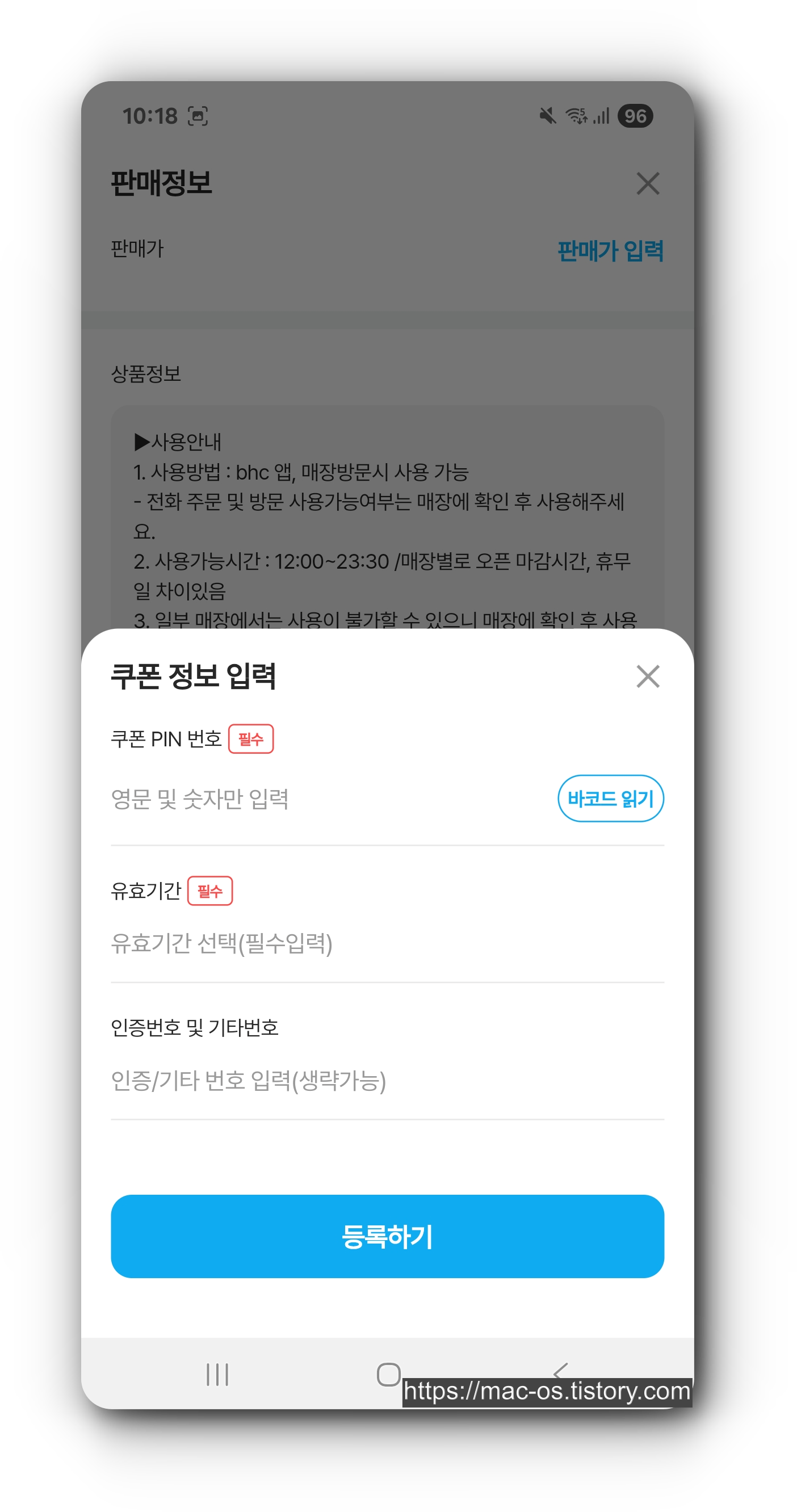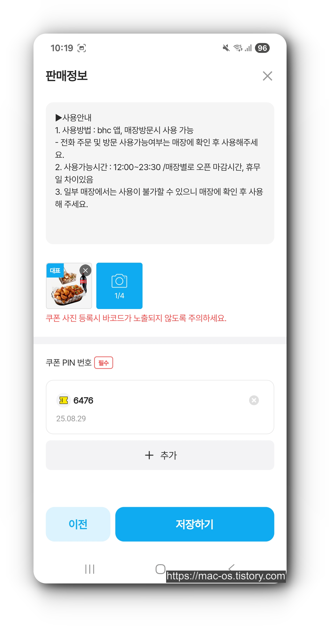 그리고 하단의 쿠폰 PIN 번호에서 [추가] 버튼을 눌러 쿠폰 번호, 유효기간을 입력하고 [등록하기] > [저장하기] 버튼을 누르면 판매 등록이 완료된다.