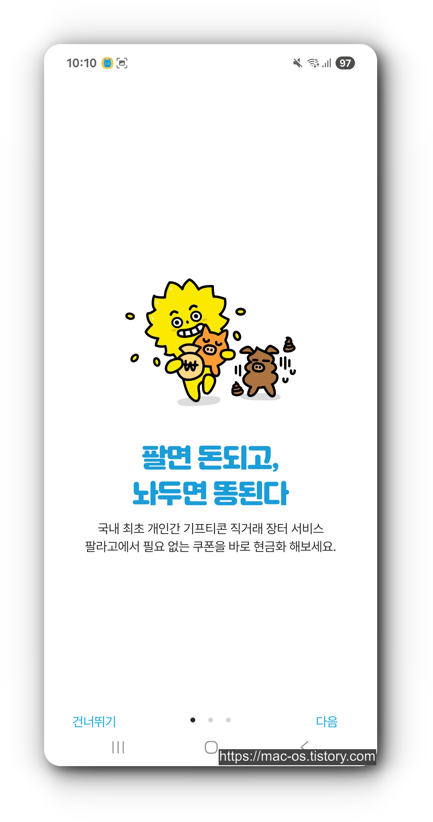 팔라고는 구글 플레이 스토어와 애플 앱스토어에서 설치할 수 있다. 앱을 실행한 다음 좌측 하단의 [건너뛰기] 버튼을 터치한다.