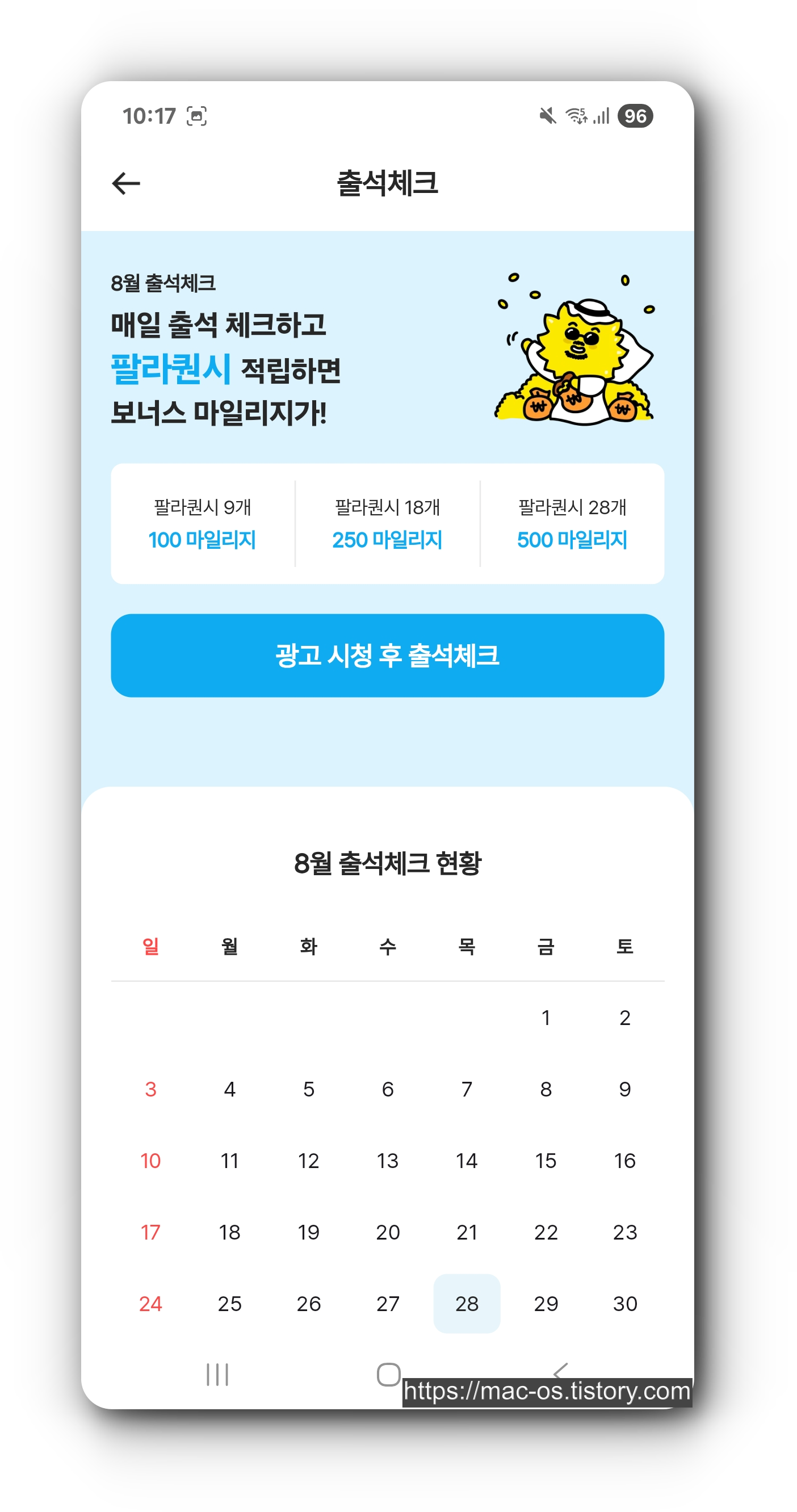 팔라고의 혜택 탭을 살펴보면 출석체크, 동영상 광고, 친구초대, 광고 충전소 등을 통해 마일리지를 얻을 수 있다.