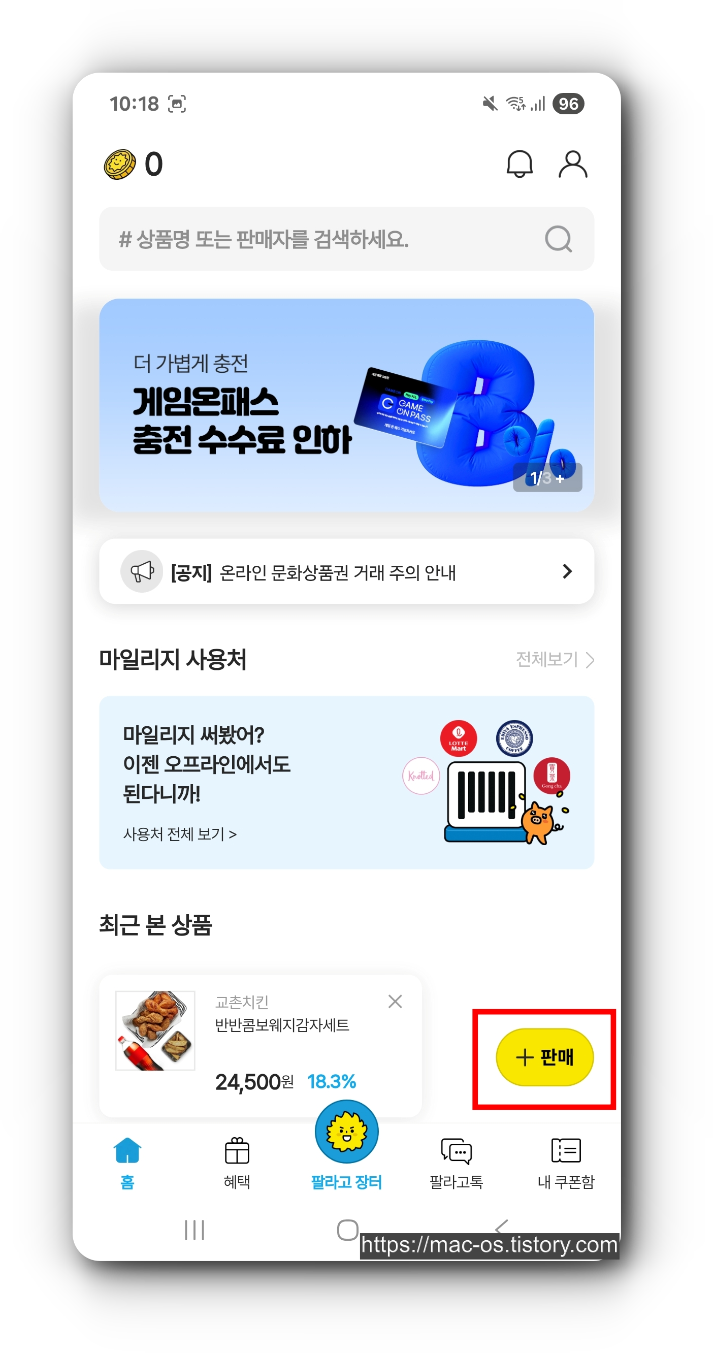 결제 페이지에서 캐시, 마일리지를 사용하여 구매하면 핀번호를 확인할 수 있다. 그리고 팔라고에서 기프티콘을 판매하려면 홈 화면에서 우측 하단의 [판매] 버튼을 터치하면 된다.