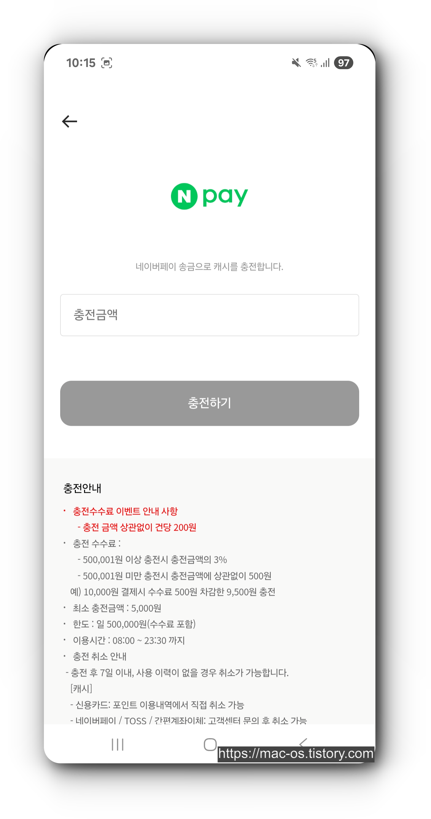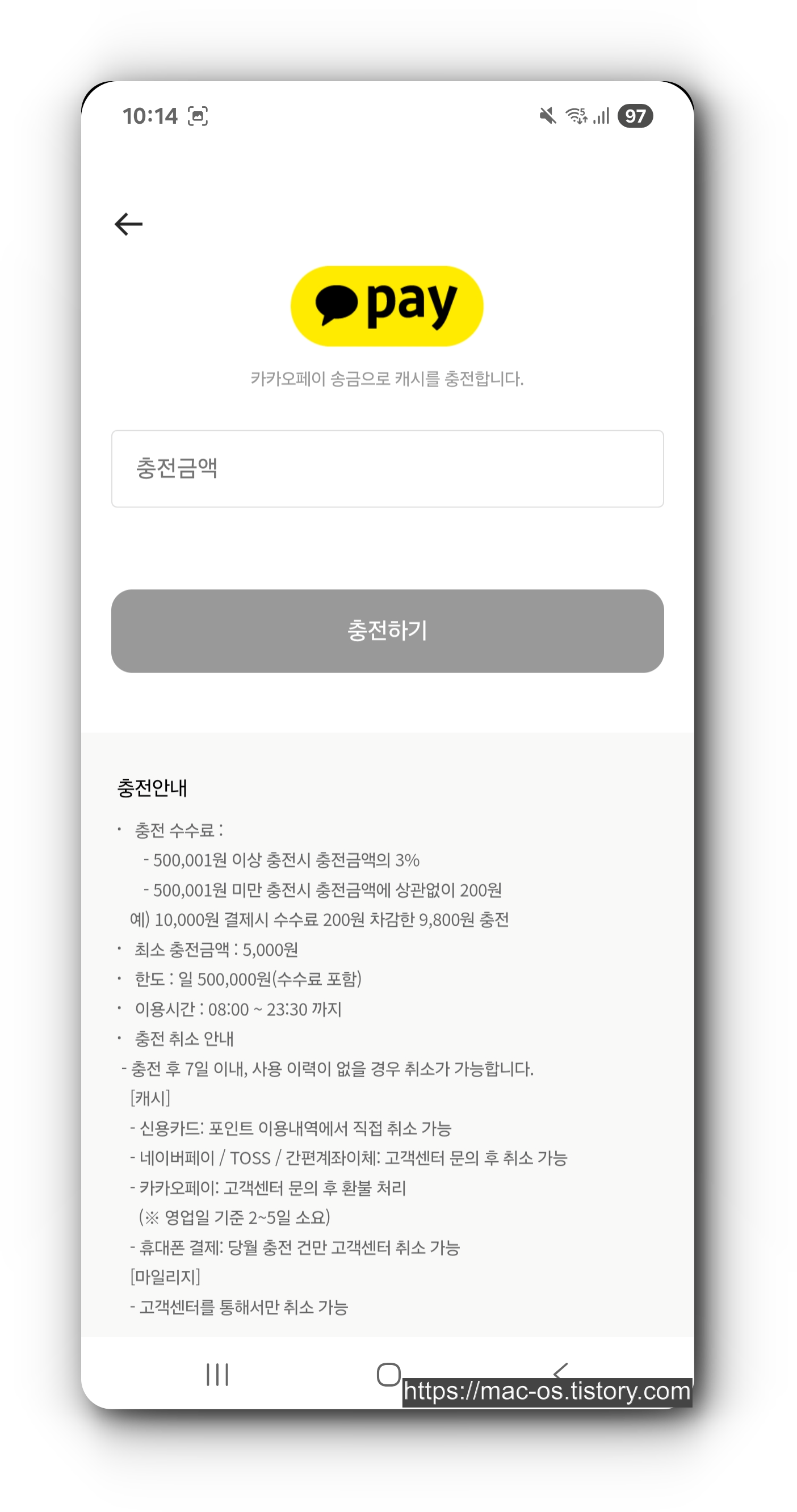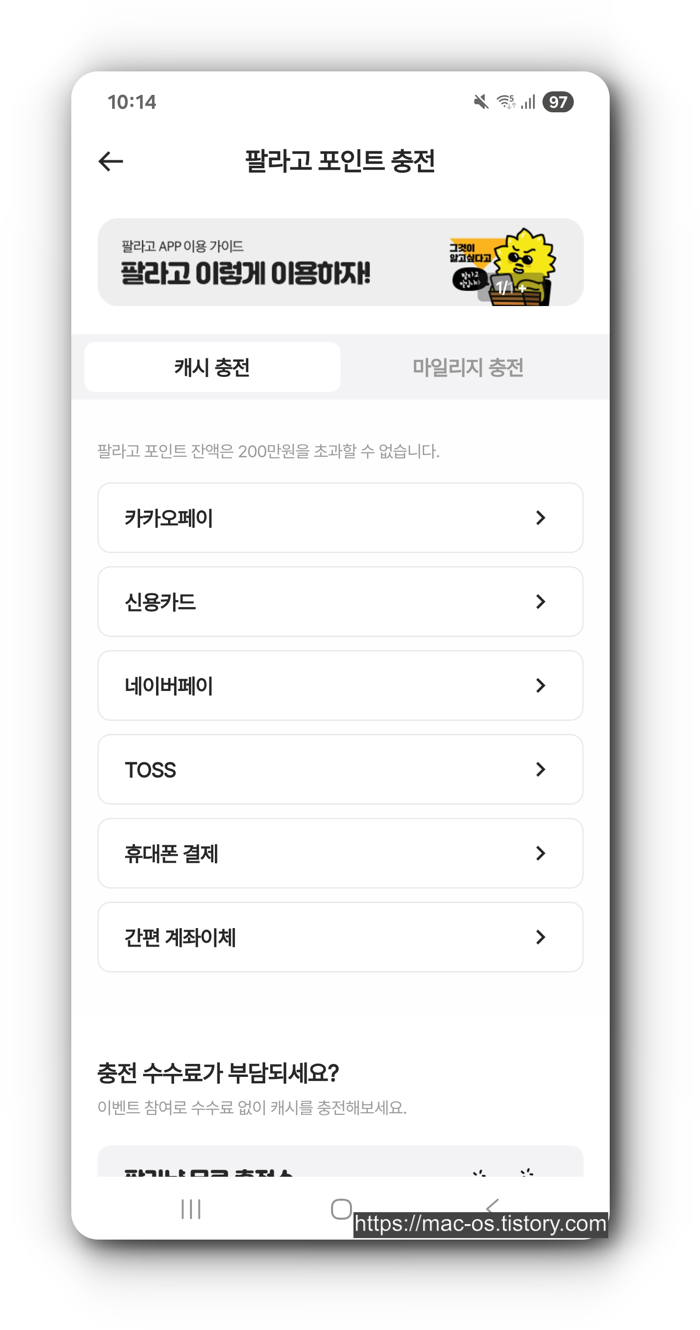 - 캐시/마일리지를 충전하여 기프티콘을 구매할 수 있는데, 카카오페이/네이버페이로 결제하면 50만원 미만 충전시 수수료 200원이다.