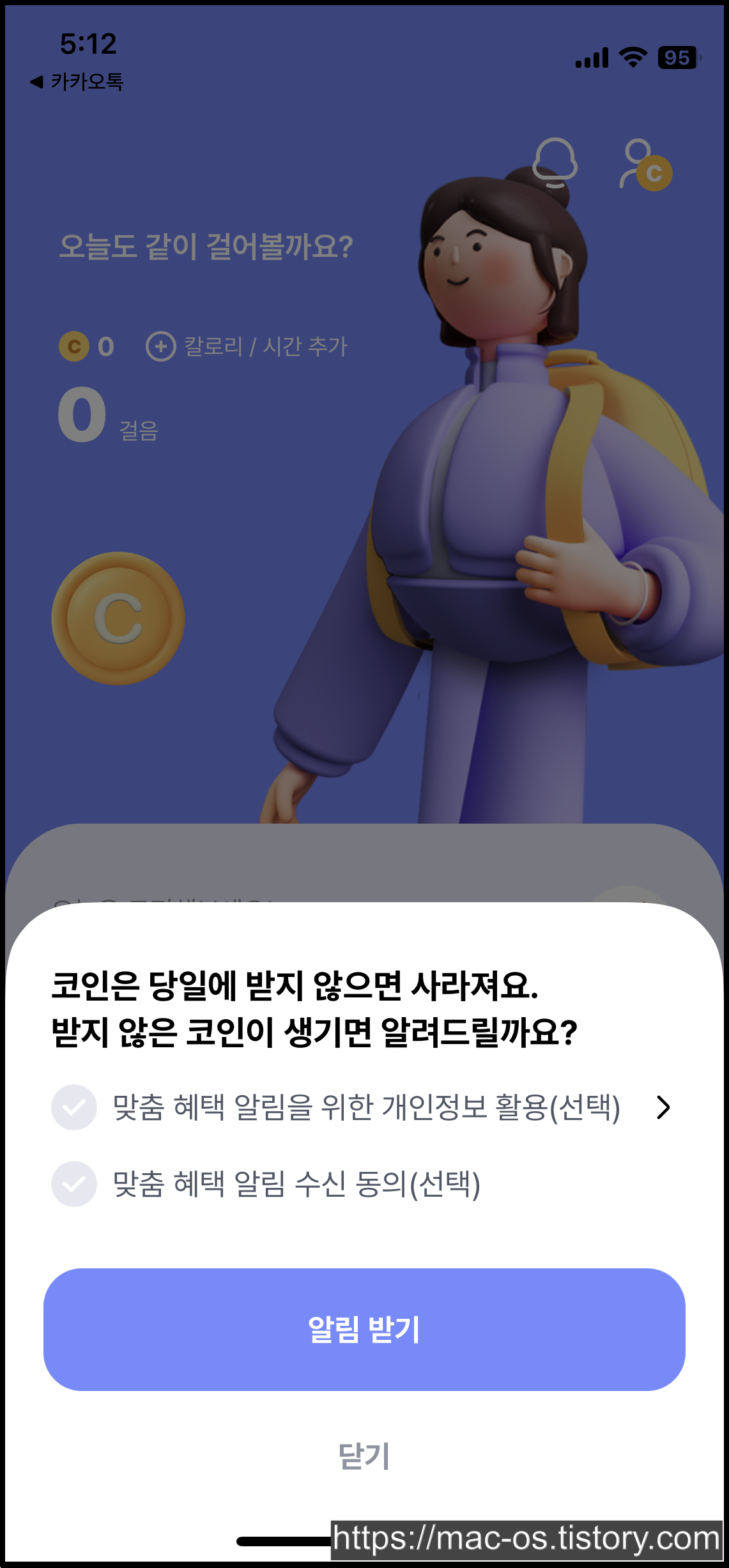 소셜 로그인 계정으로 간편 가입을 완료하면 1,000 걸음마다 3코인이 적립된다는 창이 나온다.
