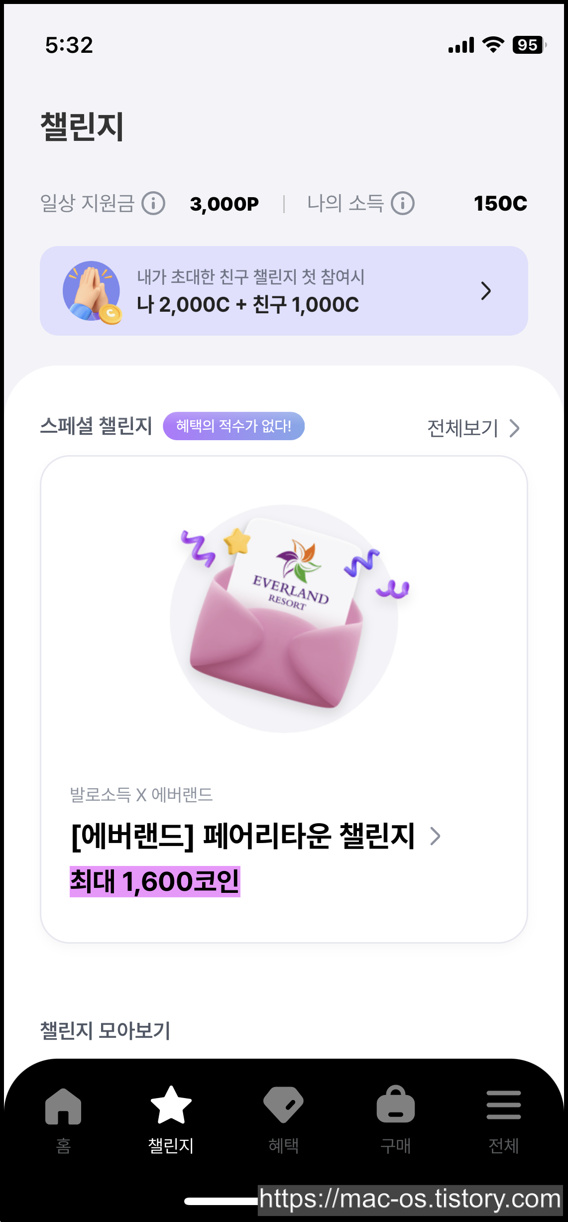 챌린지를 마쳤다면 [소득 받기] 버튼을 터치하여 보상으로 최대 5,000 코인을 받을 수 있다. 달성된 목표에 따라 코인, 쿠폰, 100C 교환권 등 다양한 소득이 지급된다.