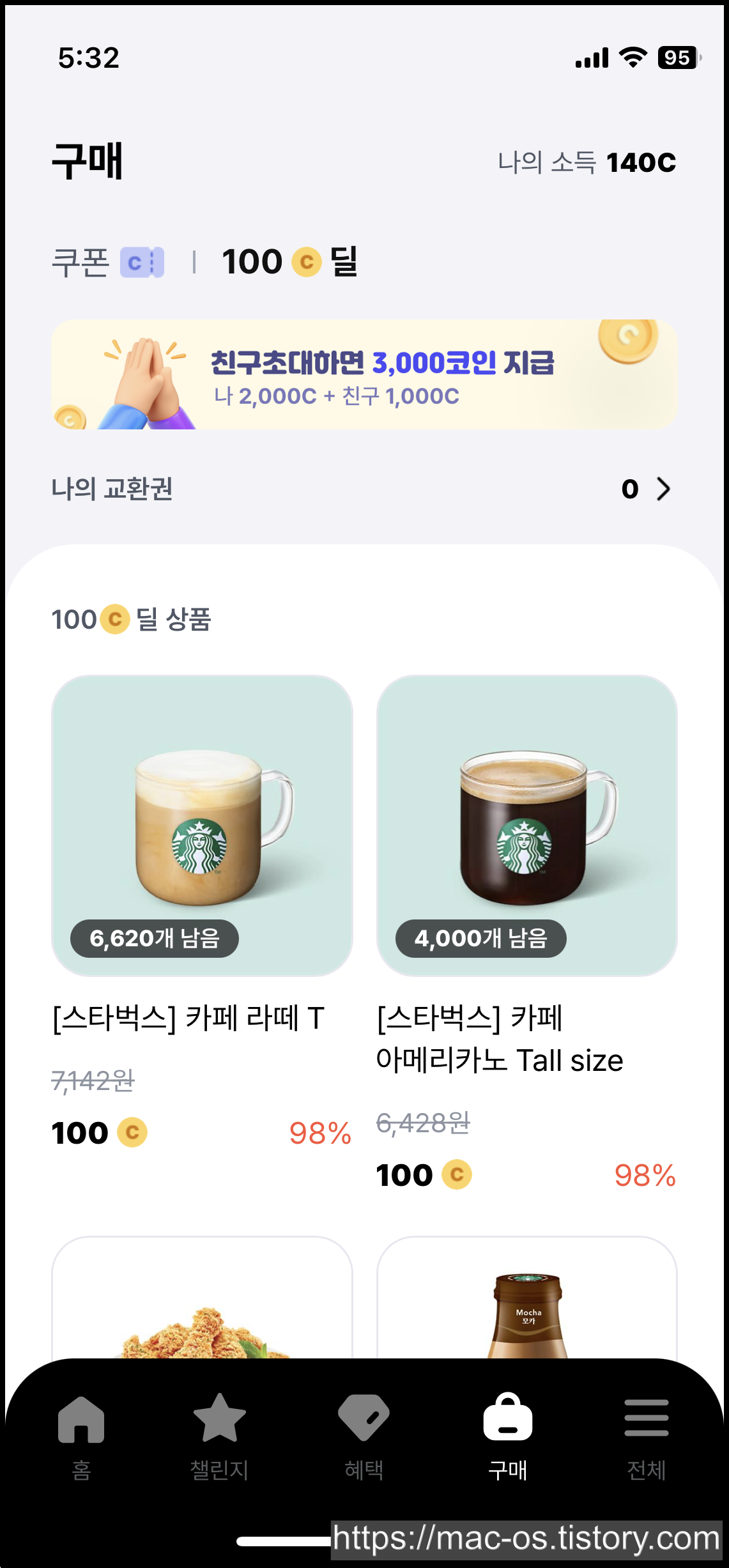 - 챌린지 보상으로 받은 코인은 기프티콘 쿠폰을 구매하는데 사용이 가능하다.