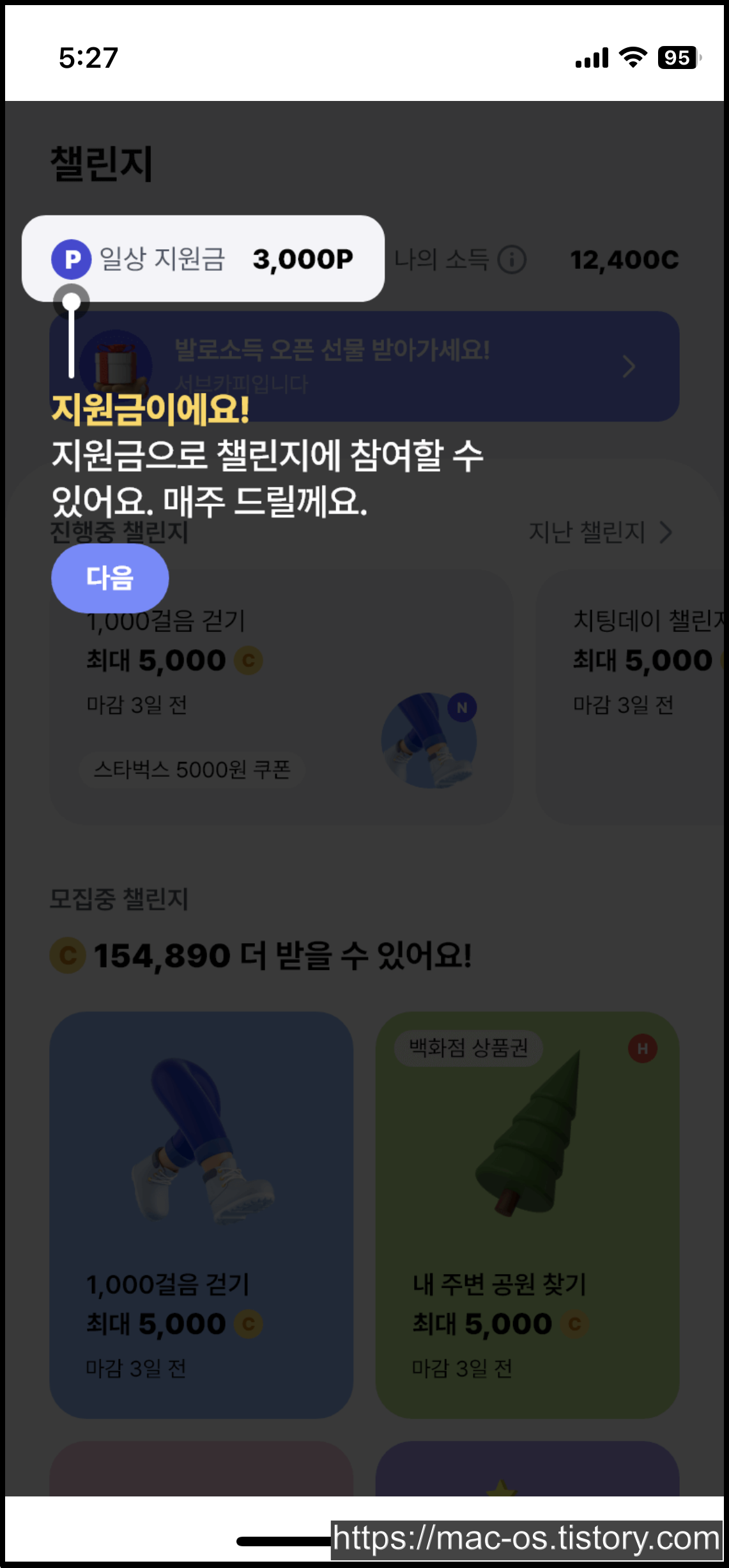 챌린지 탭으로 처음 이동하면 이렇게 둘러보기 챌린지 튜토리얼이 시작된다. 챌린지는 일상 지원금 1,000포인트로 참여할 수 있다.