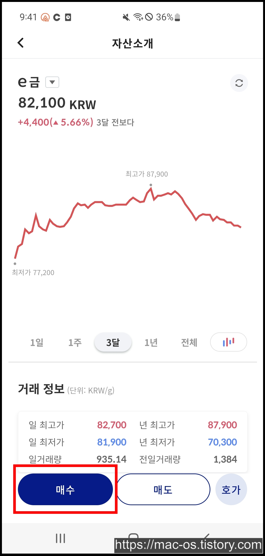 센골드 앱 홈 화면에서 자신이 원하는 자산을 선택하고 [매수]를 누르면 포인트를 사용하여 e금을 구매할 수 있다.
