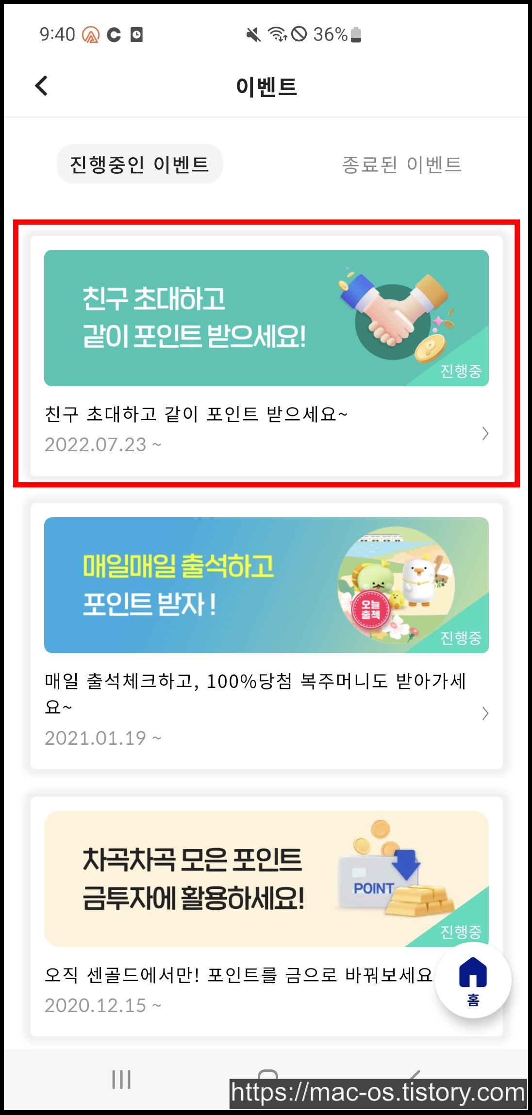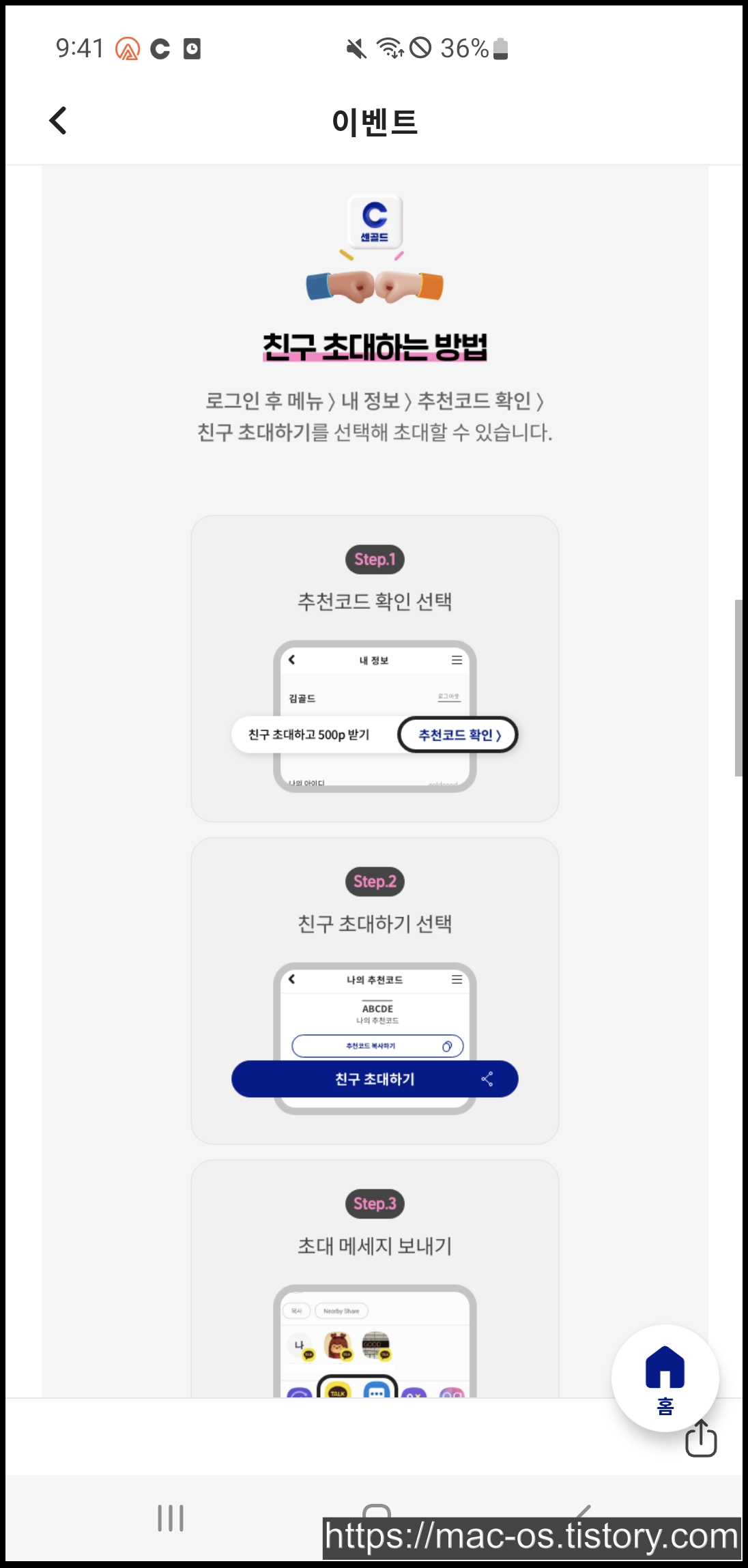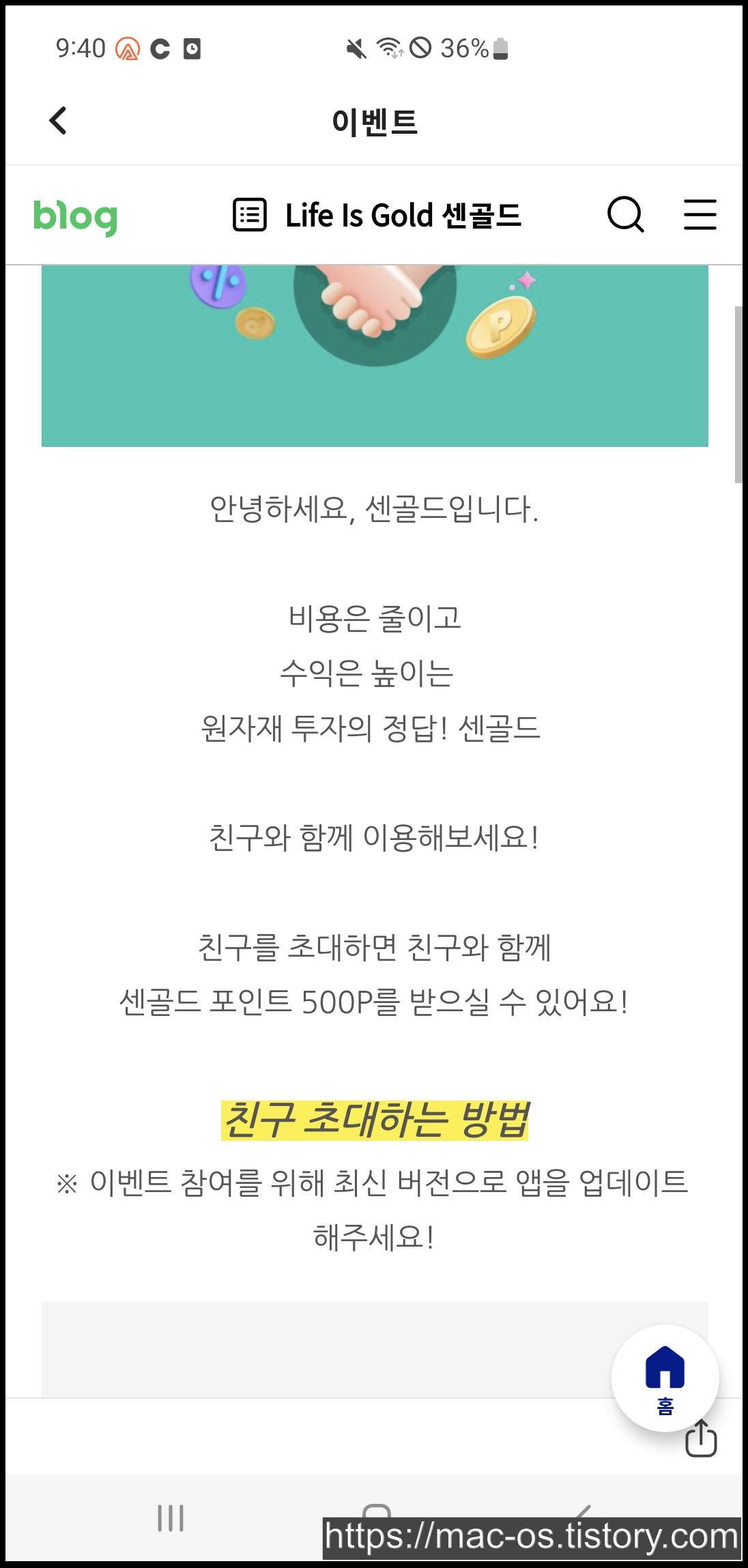 친구를 초대하면 친구와 함께 센골드 포인트 500P를 받을 수 있다.