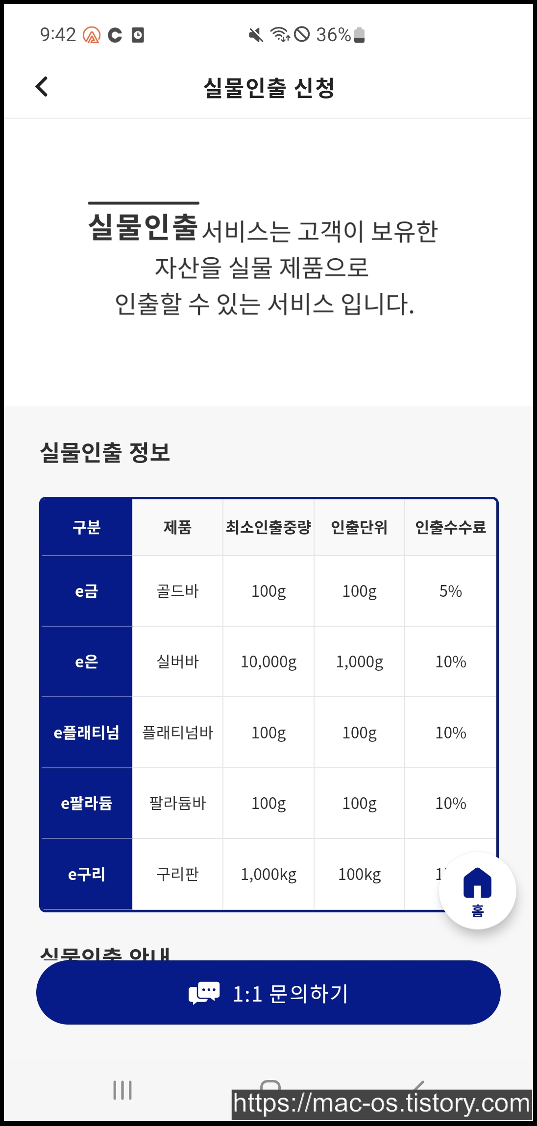 - e금/e은/e플래티넘/e팔라듐/e구리 등을 g 단위로 구매 후 실물교환 신청하는 구조