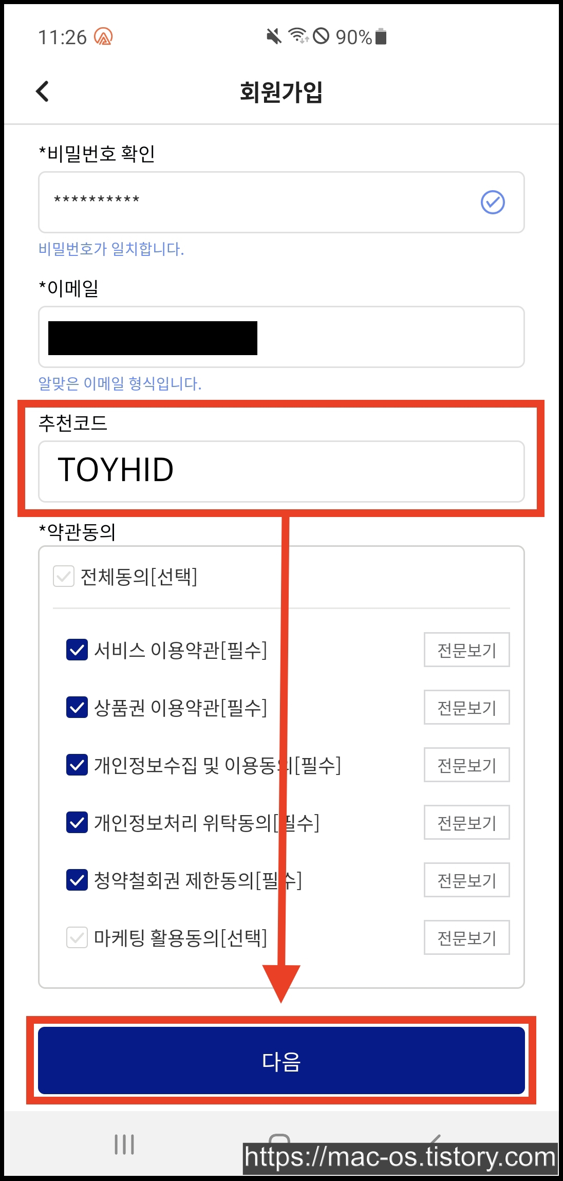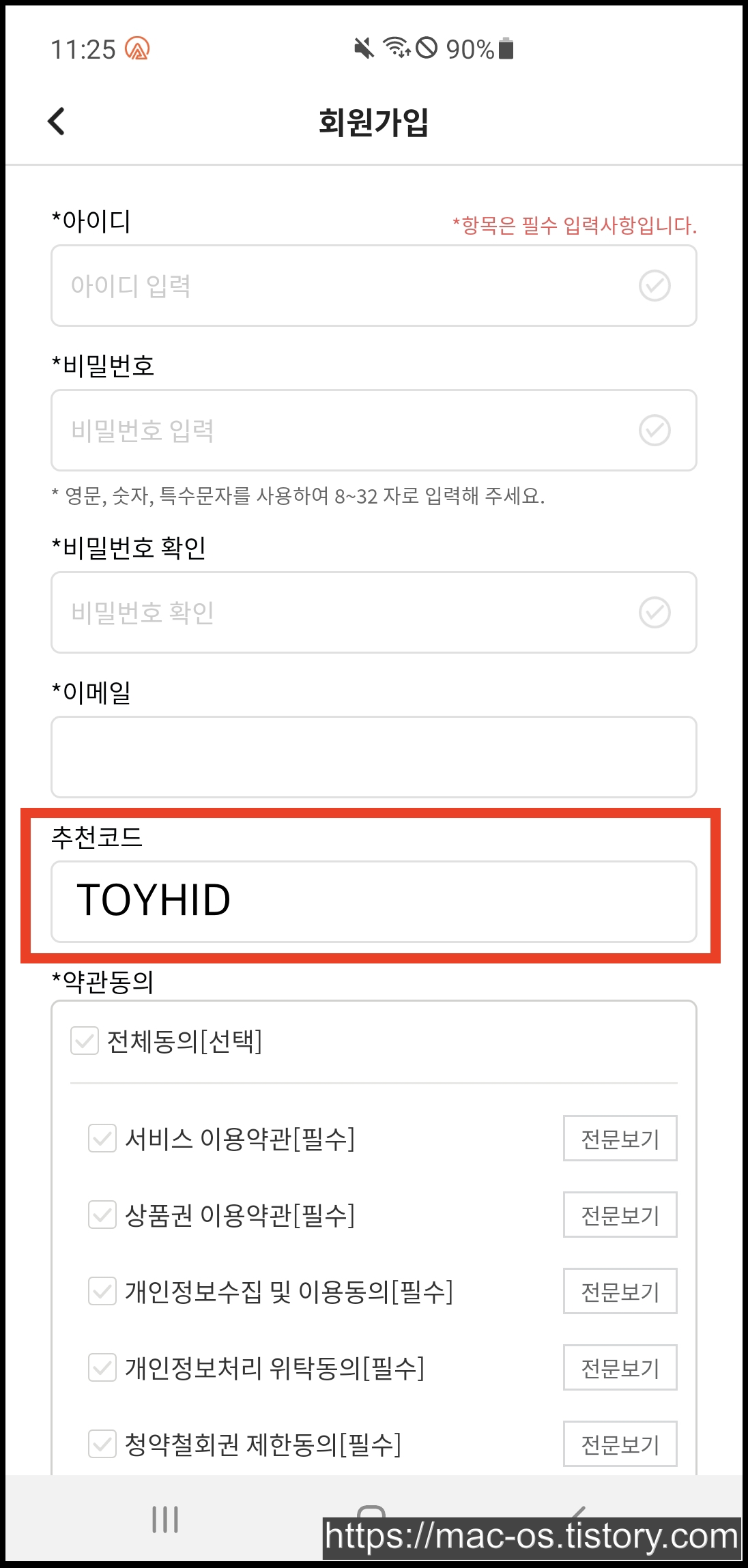 - 추천코드 란에 TOYHID를 복사하여 입력