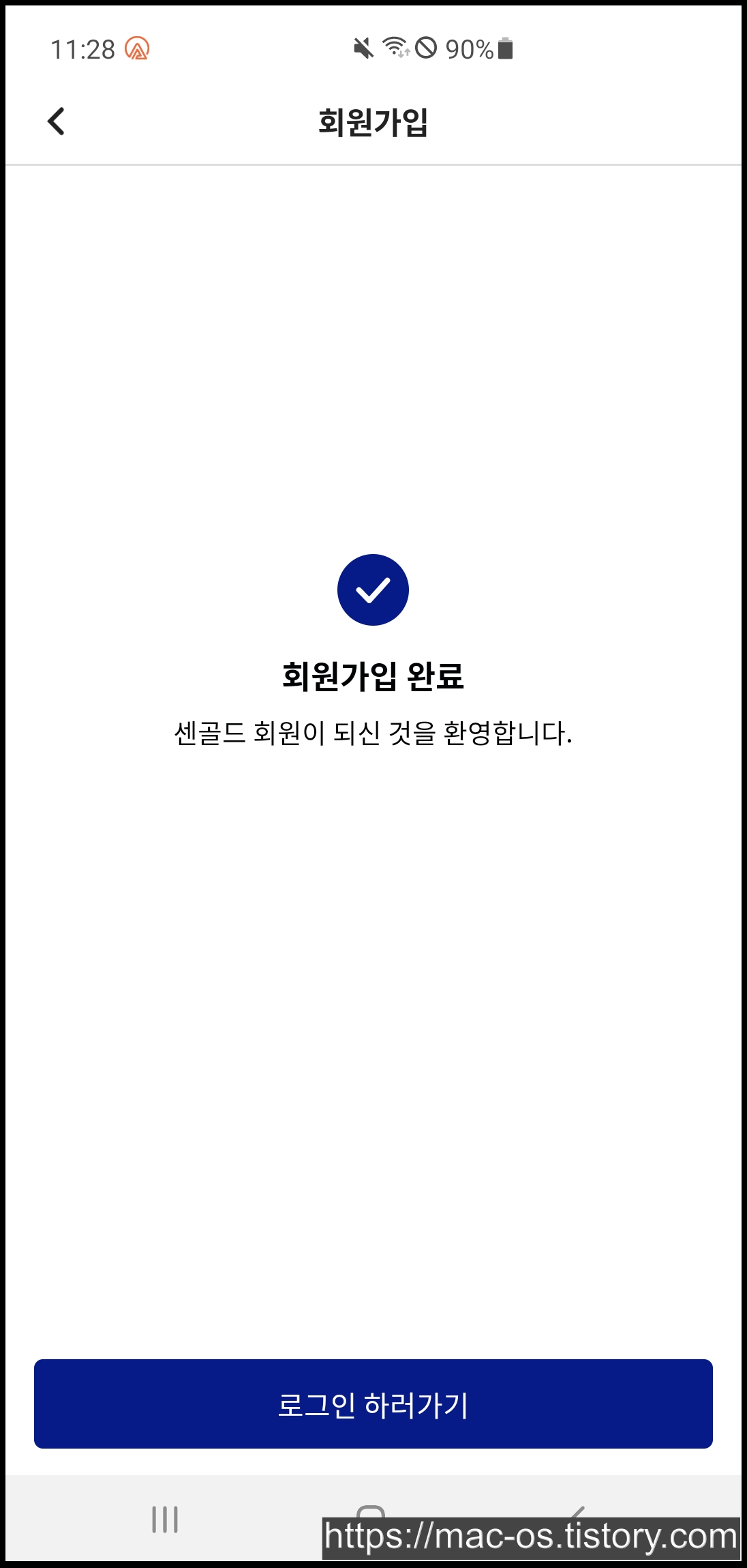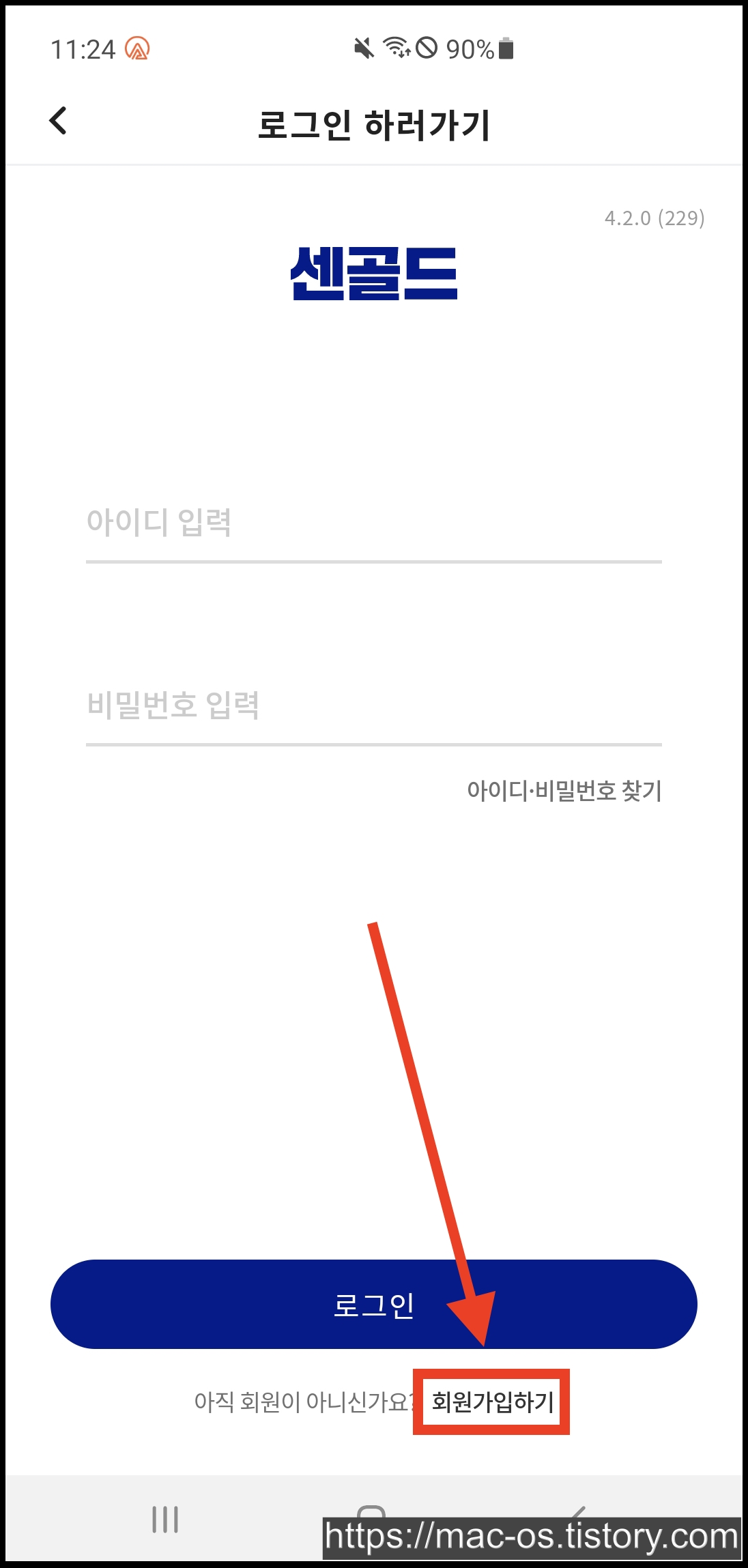 센골드 앱 실행 후 로그인 페이지에서 [회원가입하기] 터치